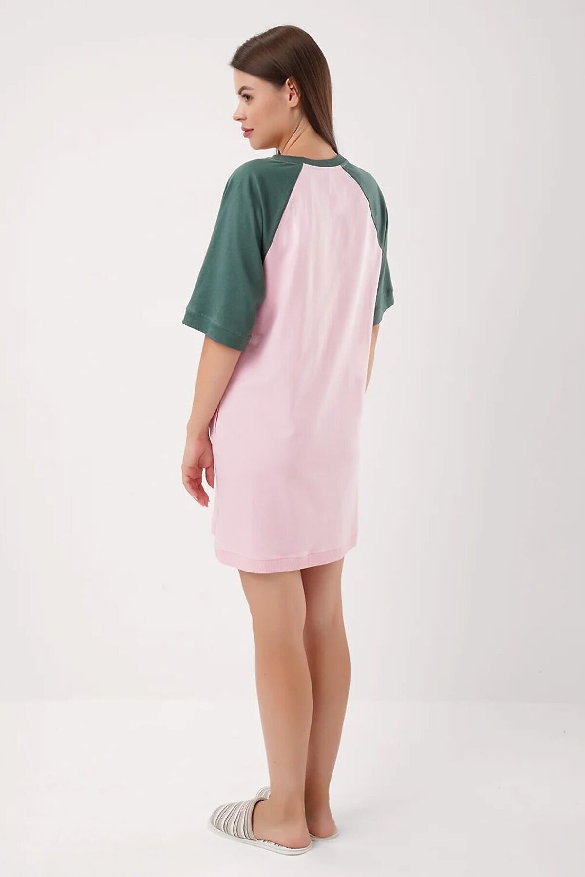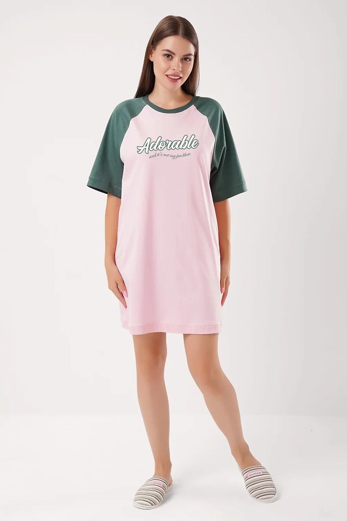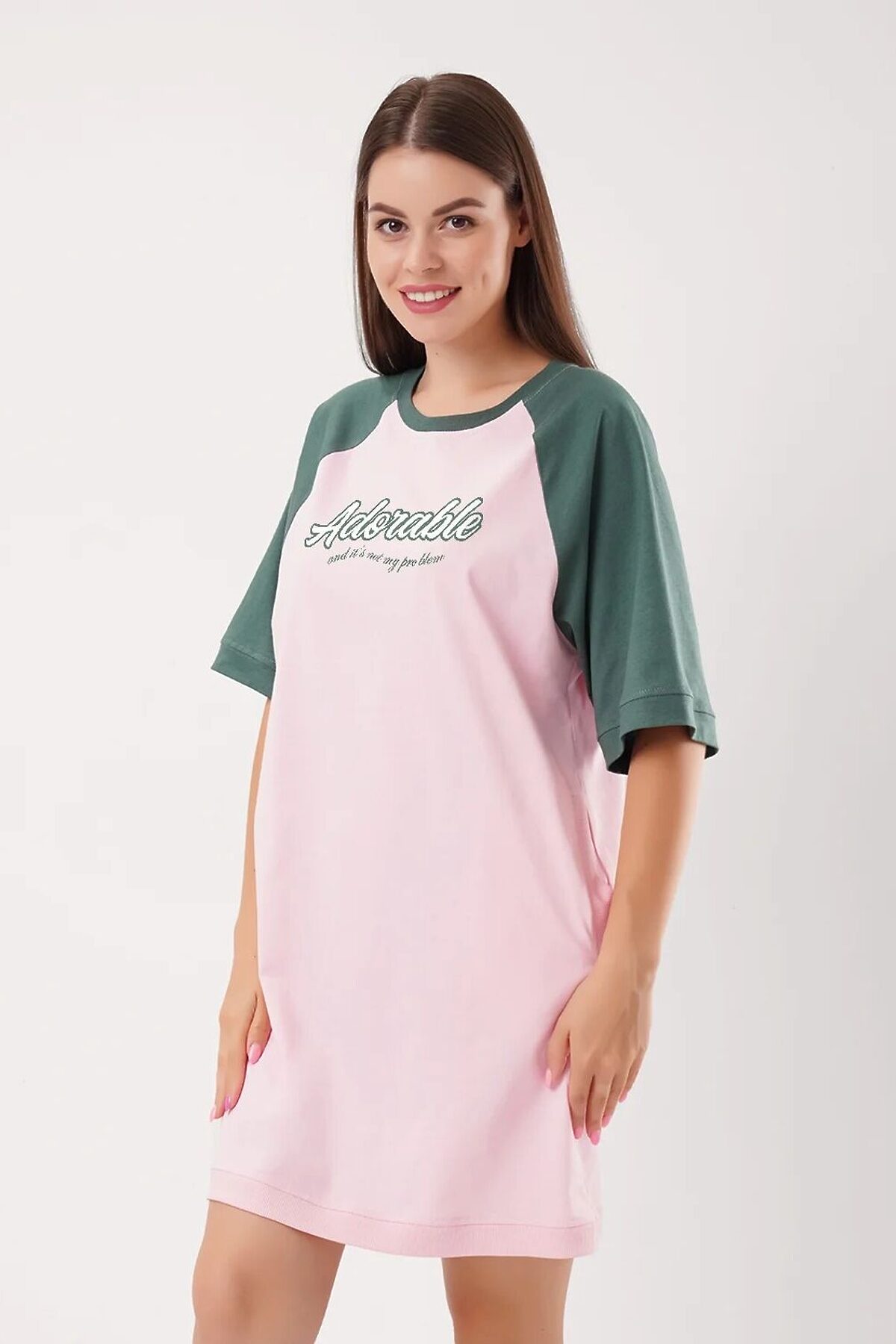 Платье для дома и отдыха прямого силуэта из хлопкового трикотажного полотна. Округлая горловина с обтачкой. Короткий рукав реглан,по низу рукава манжет.Карманы листочка из кашкорсе в боковом шве.По низу изделия манжет из кашкорсе. Спереди принт.