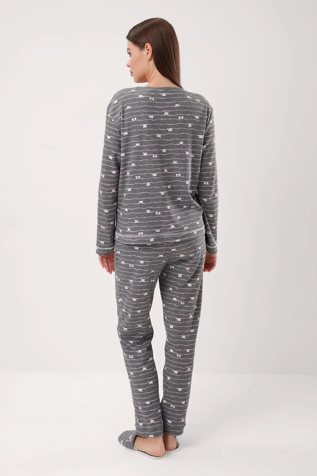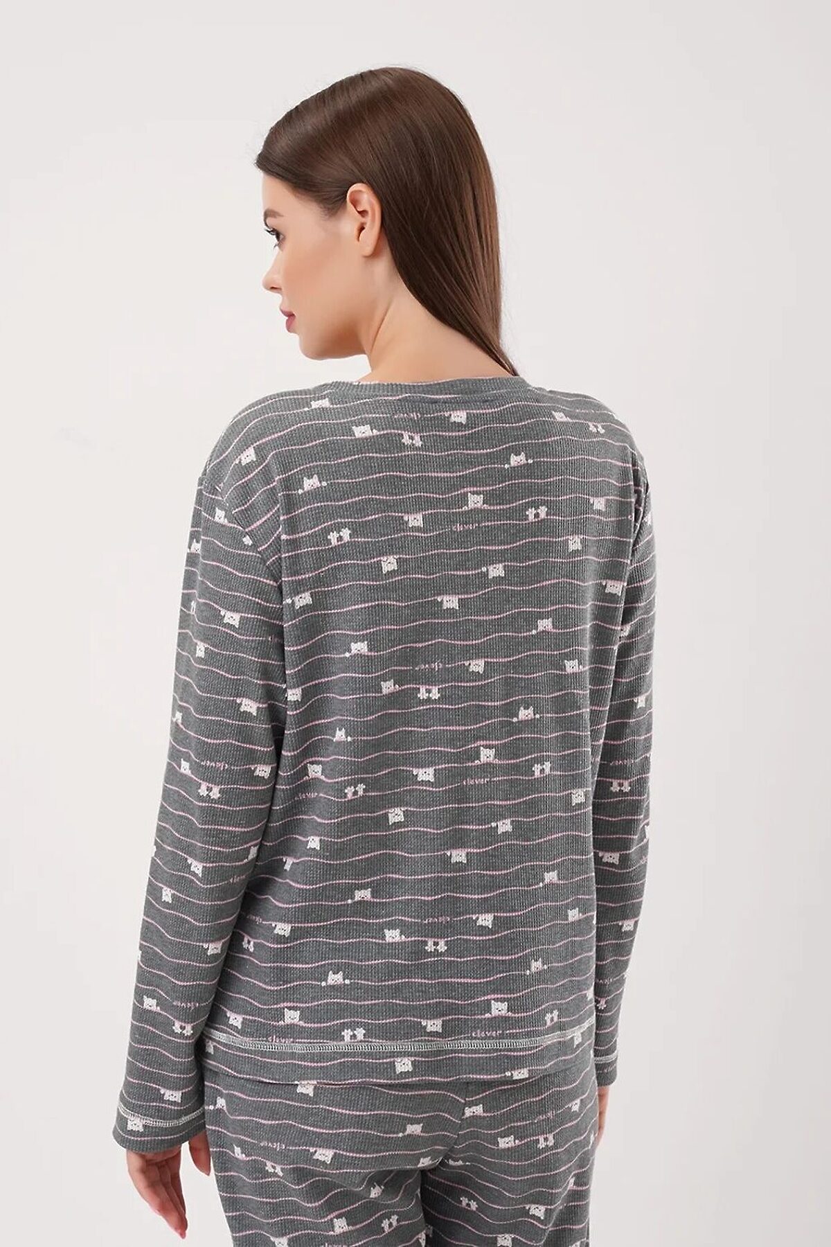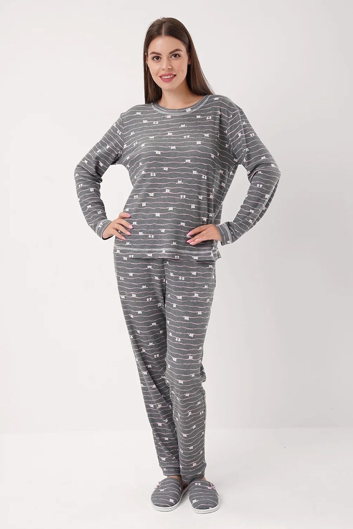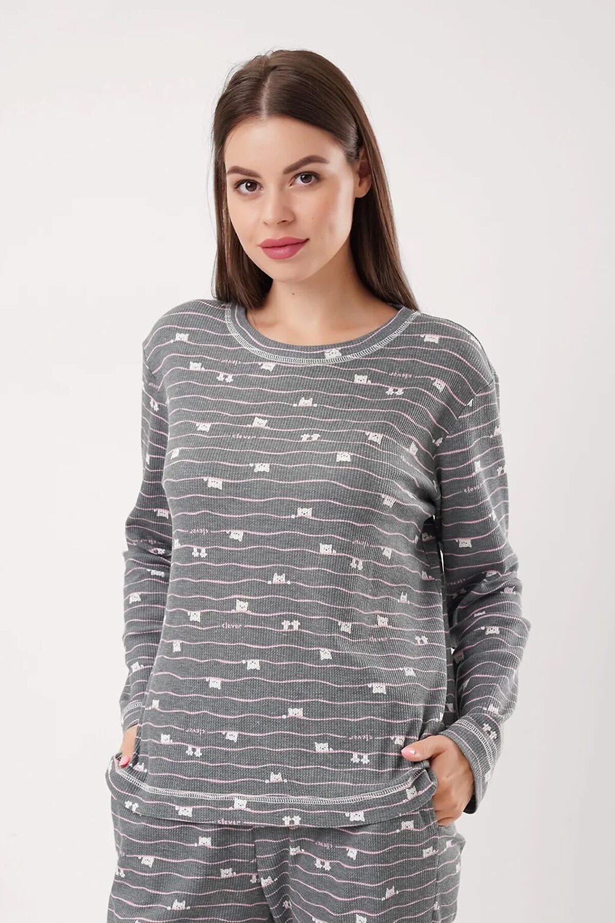 Набор одежды из трикотажного полотна "вафелька". Фуфайка прямого силуэта.По горловине обтачка. Втачной длинный рукав. По горловине,низу изделия и рукавов застил. Брюки с притачным поясом на внутренней резинке. Боковые карманы в швах. По низу брюк манжет.