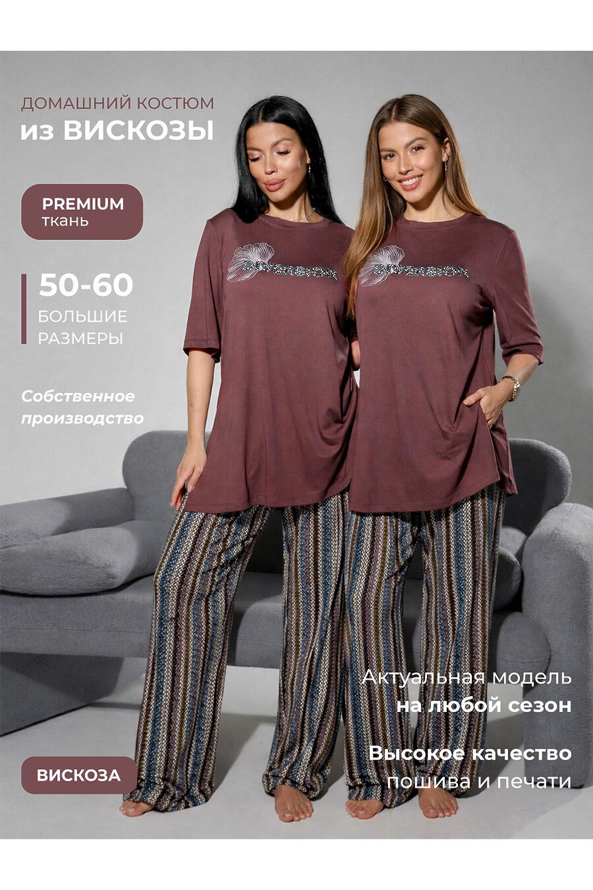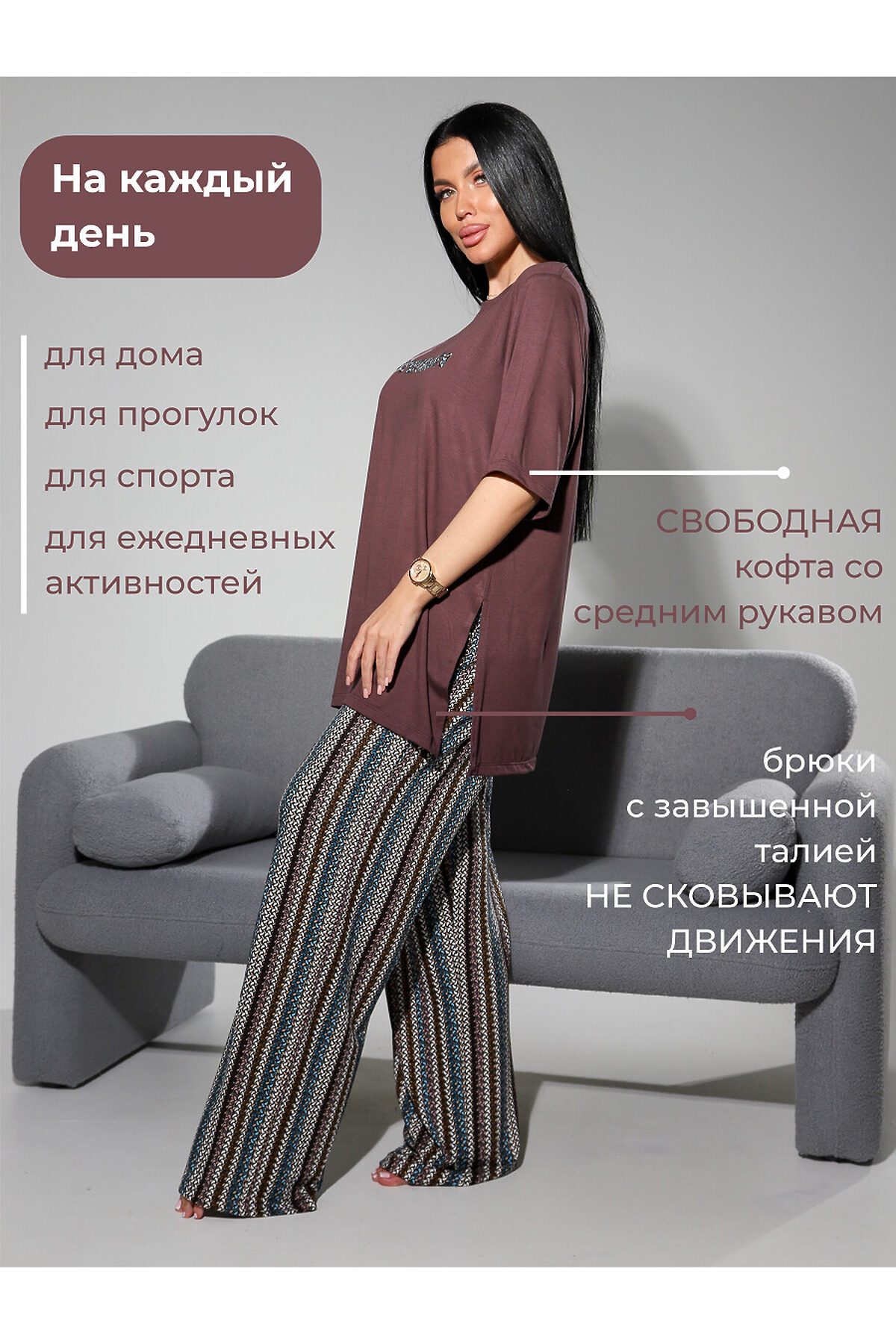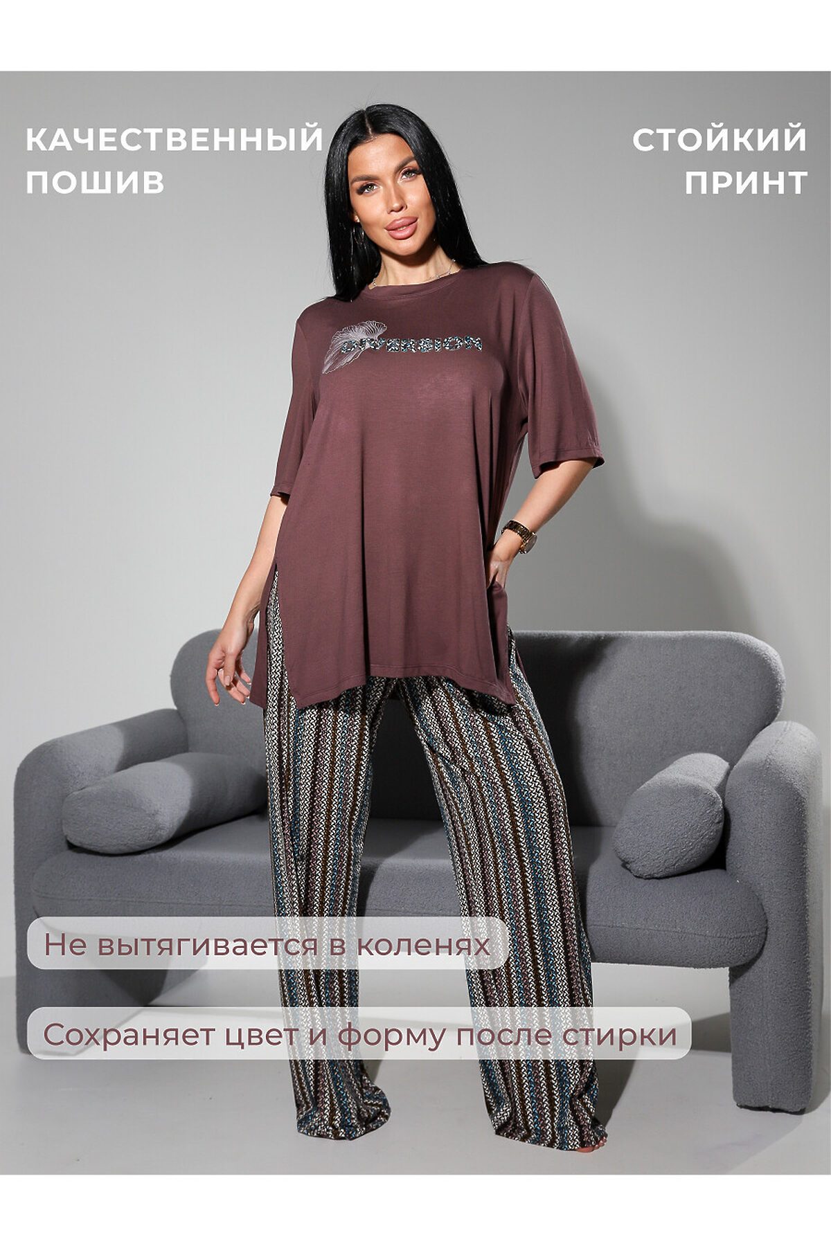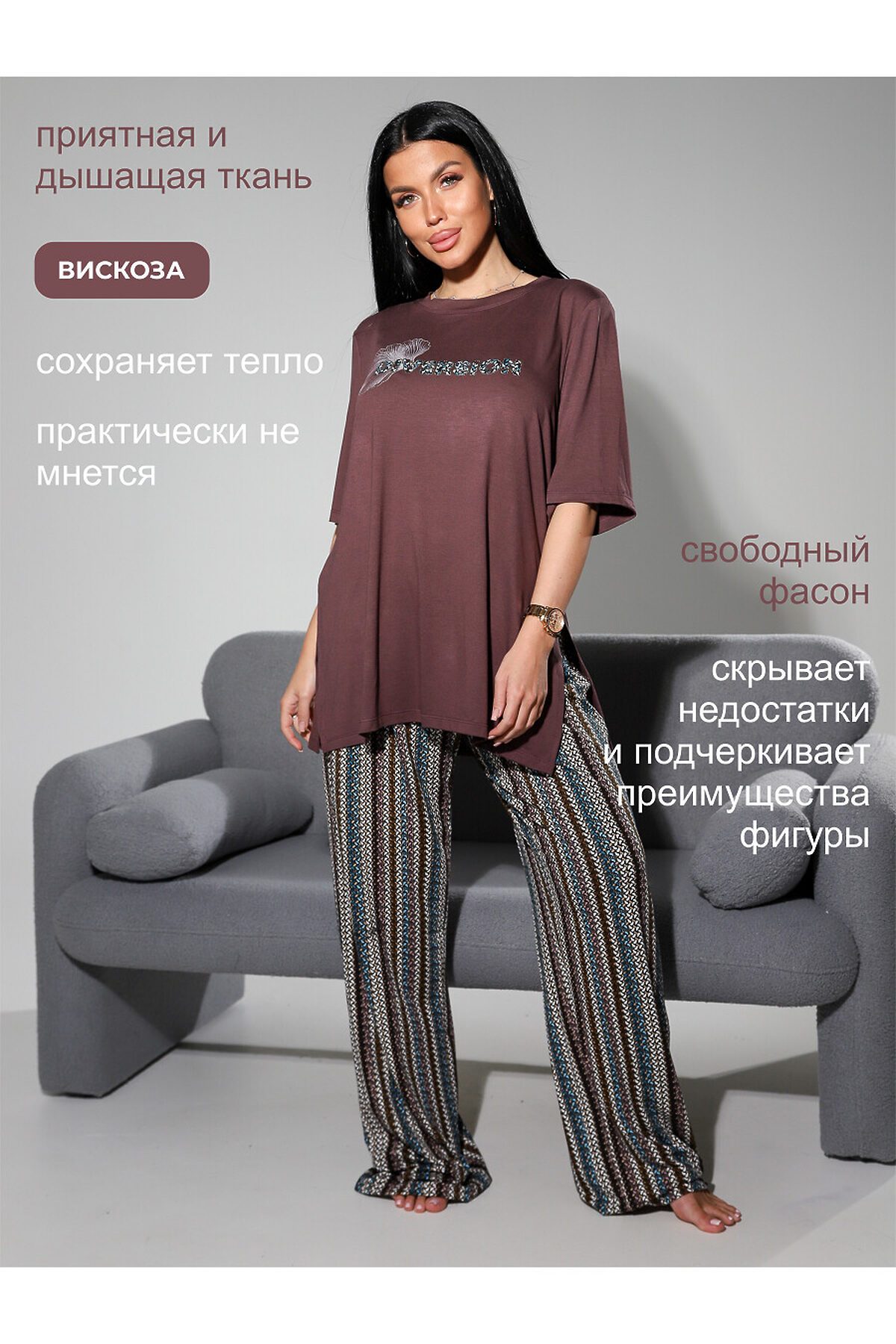 Подарите себе истинное наслаждение комфортом и элегантностью с женским домашним костюмом от бренда NINEL. Этот комплект, состоящий из свободной футболки и удобных брюк, создан для того, чтобы вы чувствовали себя расслабленно и уверенно в любой домашней обстановке. Непревзойденный комфорт премиальной вискозы: Сердце этого костюма высококачественная вискоза, материал, который дарит ощущение второй кожи. Мягкая, дышащая и приятная на ощупь, вискоза обеспечивает идеальный микроклимат, позволяя телу дышать и сохраняя ощущение свежести в течение всего дня. Ее нежная текстура ласкает кожу, а естественный блеск придает изделию изысканный вид. Свобода и стиль в каждой детали: Футболка свободного кроя: Эта футболка воплощение непринужденной элегантности. Ее свободный силуэт не сковывает движений, даря максимальный комфорт. Особый акцент стильные разрезы по бокам, которые добавляют образу легкости и современности, а также обеспечивают дополнительную вентиляцию. Круглый вырез горловины и короткие рукава делают футболку универсальной и подходящей для любого времени года. Удобные брюки: Брюки идеально дополняют футболку, создавая гармоничный и завершенный образ. Их свободный крой обеспечивает максимальную свободу движений, а мягкая резинка на поясе гарантирует идеальную посадку без сдавливания. Брюки прекрасно подходят как для отдыха, так и для выполнения домашних дел. Преимущества костюма NINEL: Премиальная вискоза: Натуральный, дышащий и гипоаллергенный материал для вашего комфорта. Свободный крой: Максимальная свобода движений и ощущение легкости. Стильные разрезы на футболке: Современный акцент, добавляющий образу изюминку. Универсальность: Идеален для дома, отдыха и сна. Элегантный дизайн: Сочетание комфорта и утонченного стиля. Бренд NINEL: Гарантия качества и внимания к деталям. Этот домашний костюм от NINEL это не просто одежда, это инвестиция в ваше самочувствие и настроение. Позвольте себе окунуться в мир уюта и стиля, где каждая деталь создана для вашего максимального комфорта.