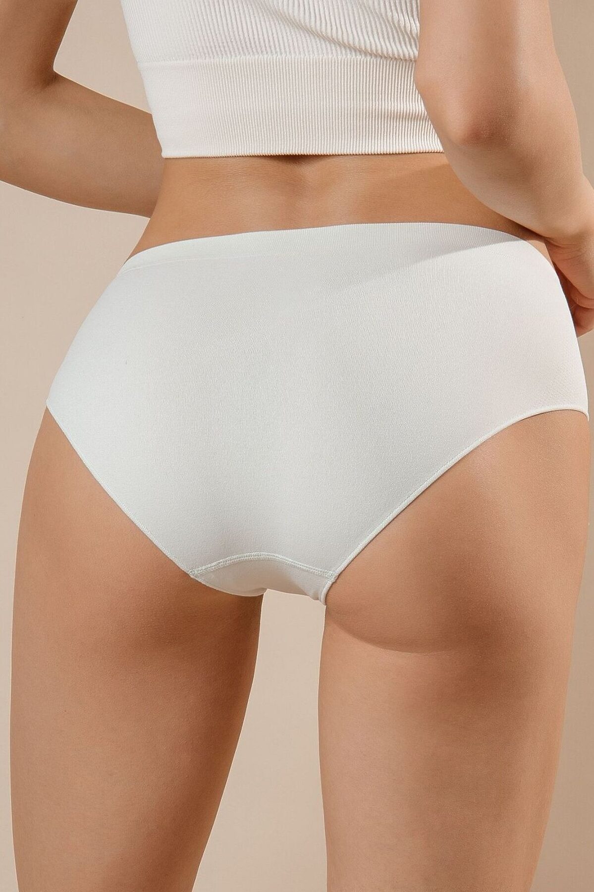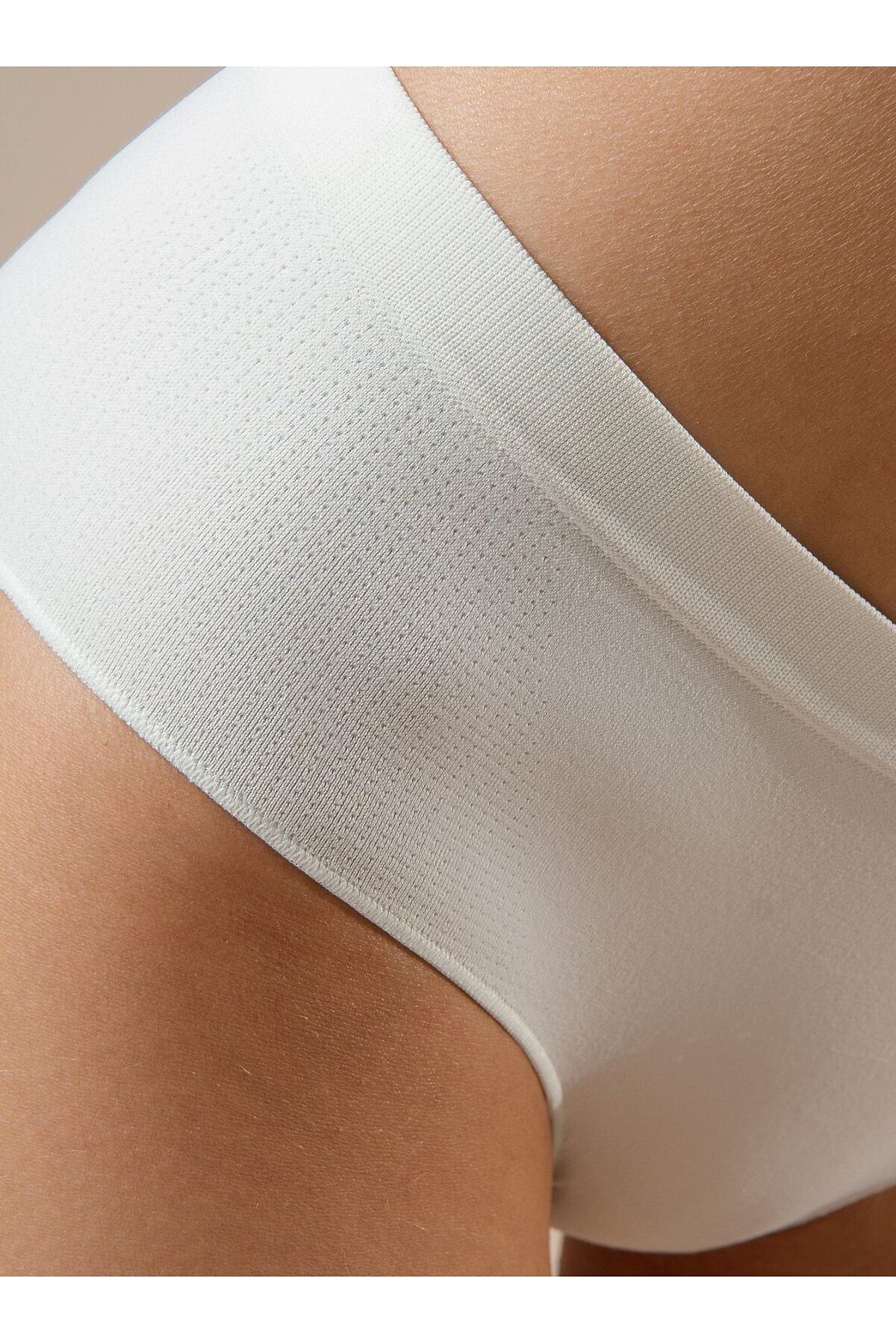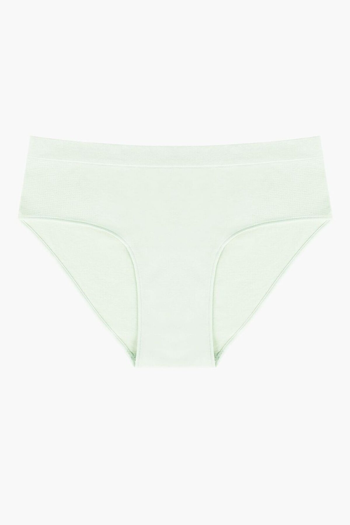Женские трусы от торговой марки Indefini. Трусы-слипы фисташкового цвета с высокой посадкой, изготовлены из мягкой микрофибры в тонкий рубчик без боковых швов, дополнены гигиенической хлопковой ластовицей. Вырезы для ног обработаны плоским швом вподгибку с резинкой, широкий пояс на резинке плотно фиксирует на теле.