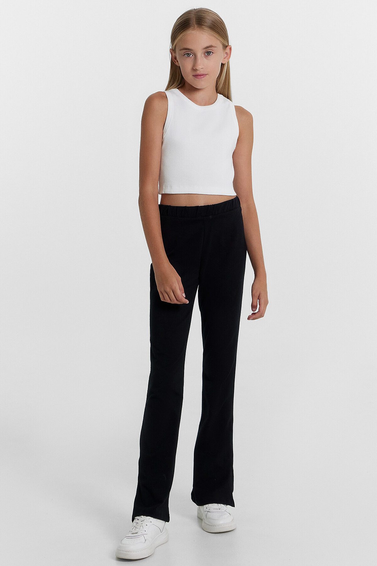 Топ для девочек прилегающего силуэта. Горловина круглая. Проймы и горловина окантованы бейкой из основного полотна. Низ изделия обработан швом в подгибку.