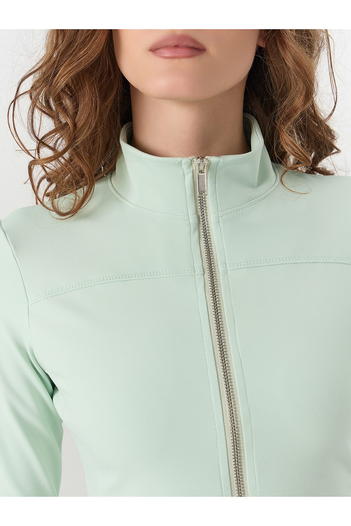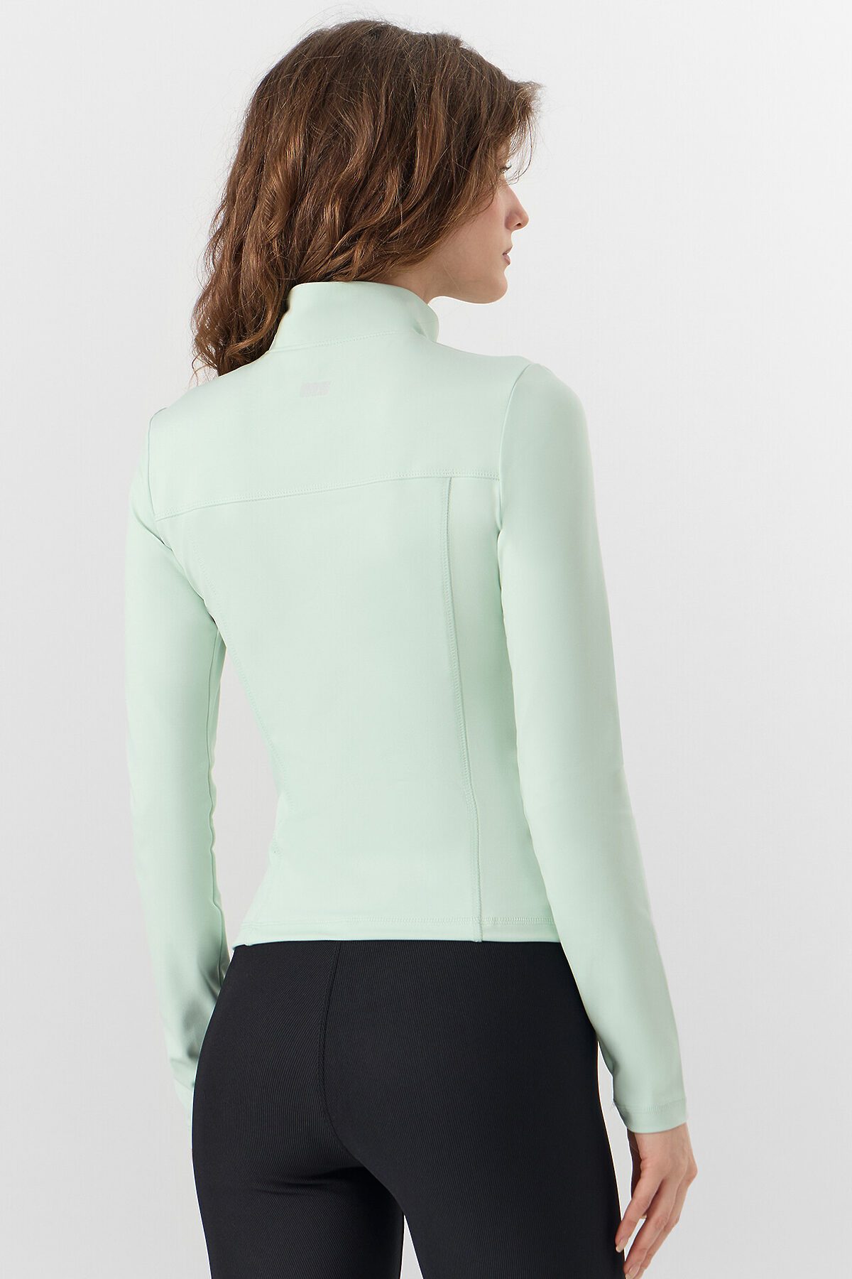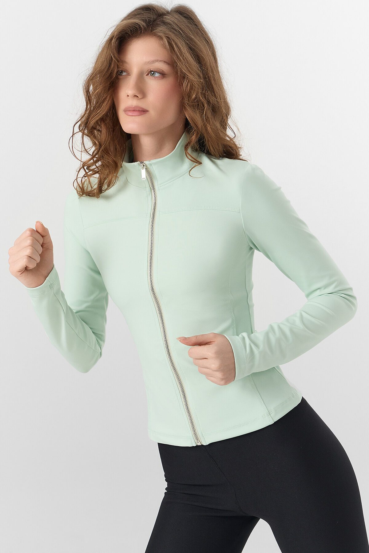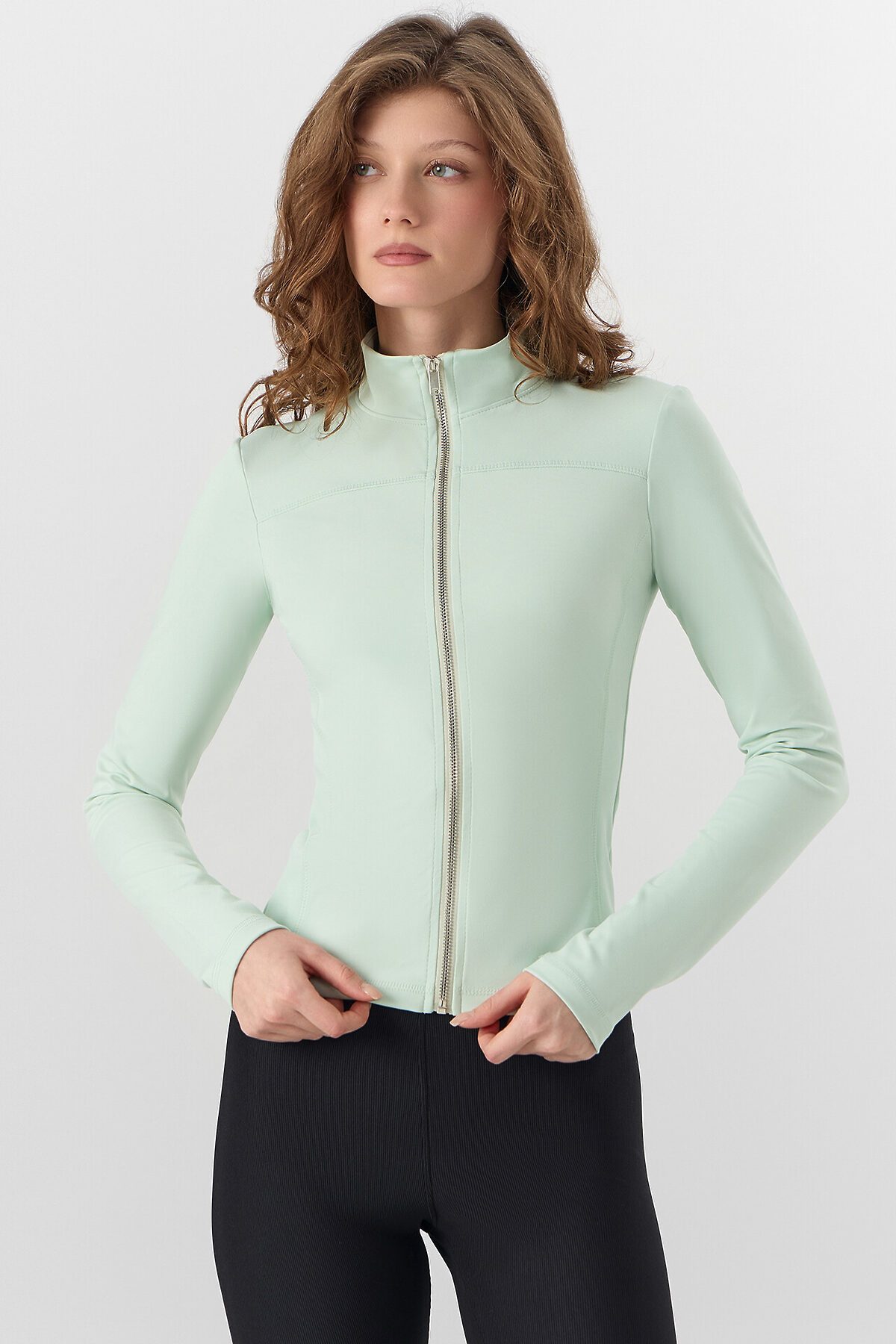 Жакет изготовлен из трикотажного полотна интерлок Жакет прилегающего силуэта, укороченный. Горловина округлой формы с воротником стойкой. Рукава втачные длинные. Жакет с отрезными бочками. По переду фигурная кокетка. По спинке фигурные рельефы.Центральная застежка на железную молнию (OpenEnd, StandartMetal №8 (7.6мм), слайдер Auto-Lock. Нижний срез жакета и рукавов обработан швом вподгибку.