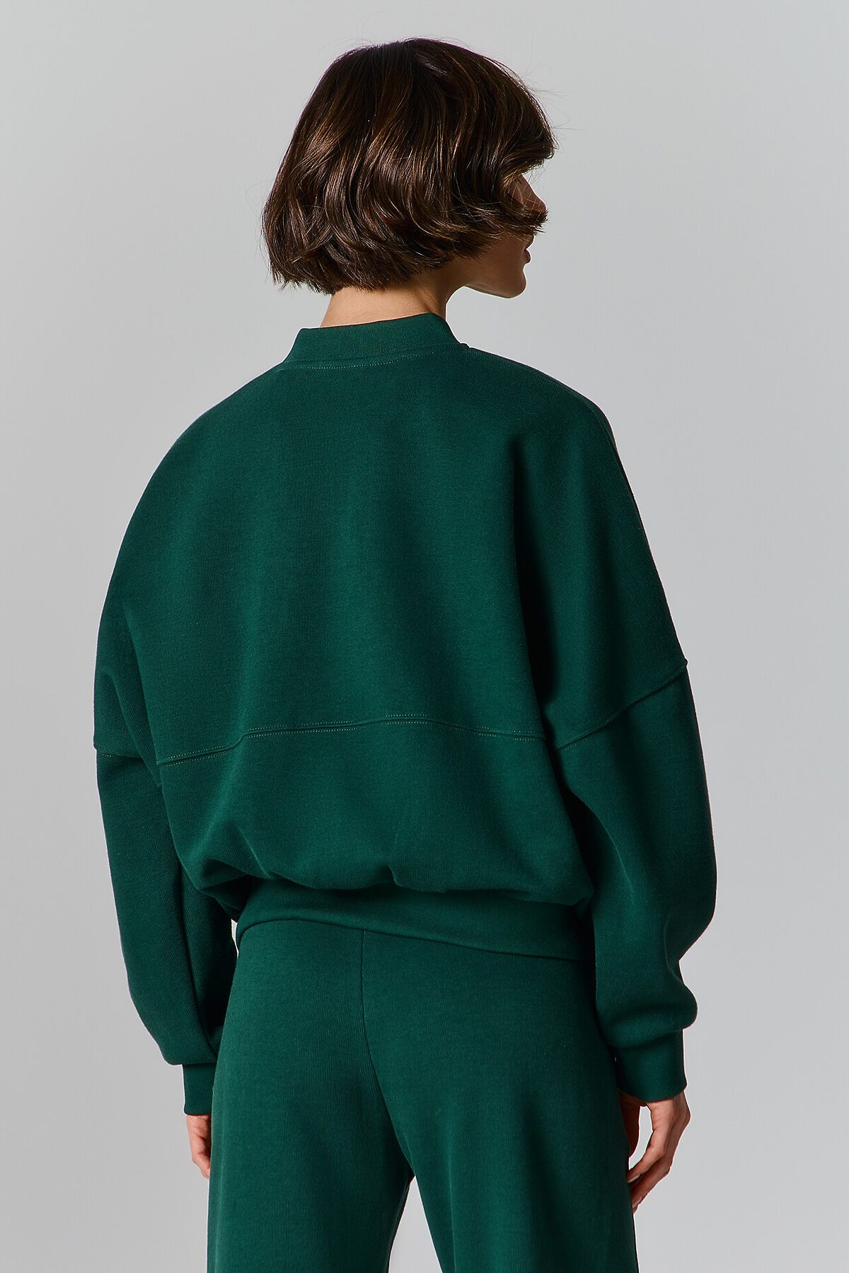 Круглая горловина оформлена воротником-стойкой из рибаны, а шов на спинке аккуратно закрыт хлопковой тесьмой для повышенного комфорта. Длинные рукава дополнены отрезными манжетами из той же рибаны.
