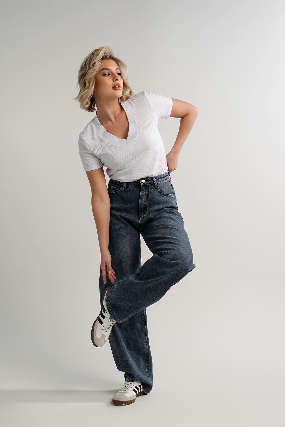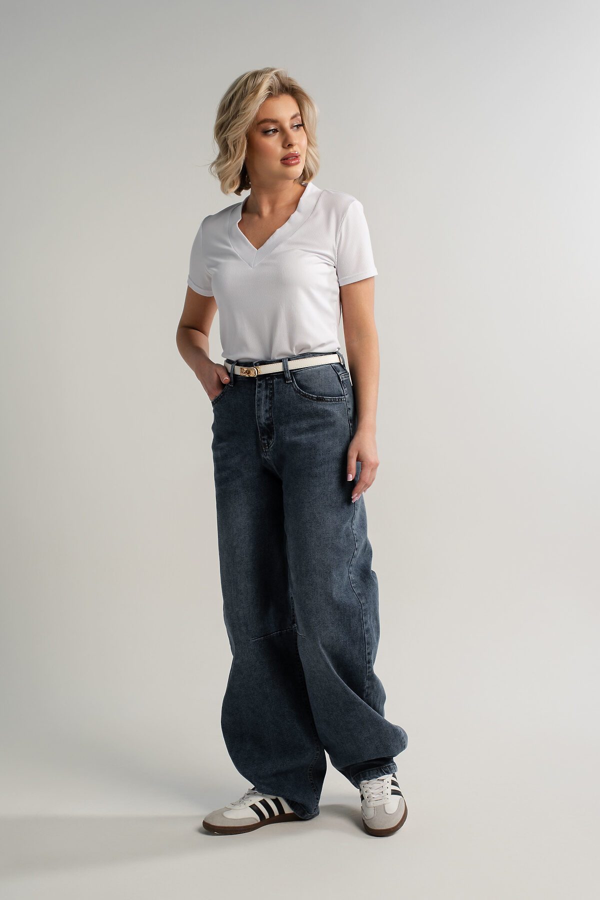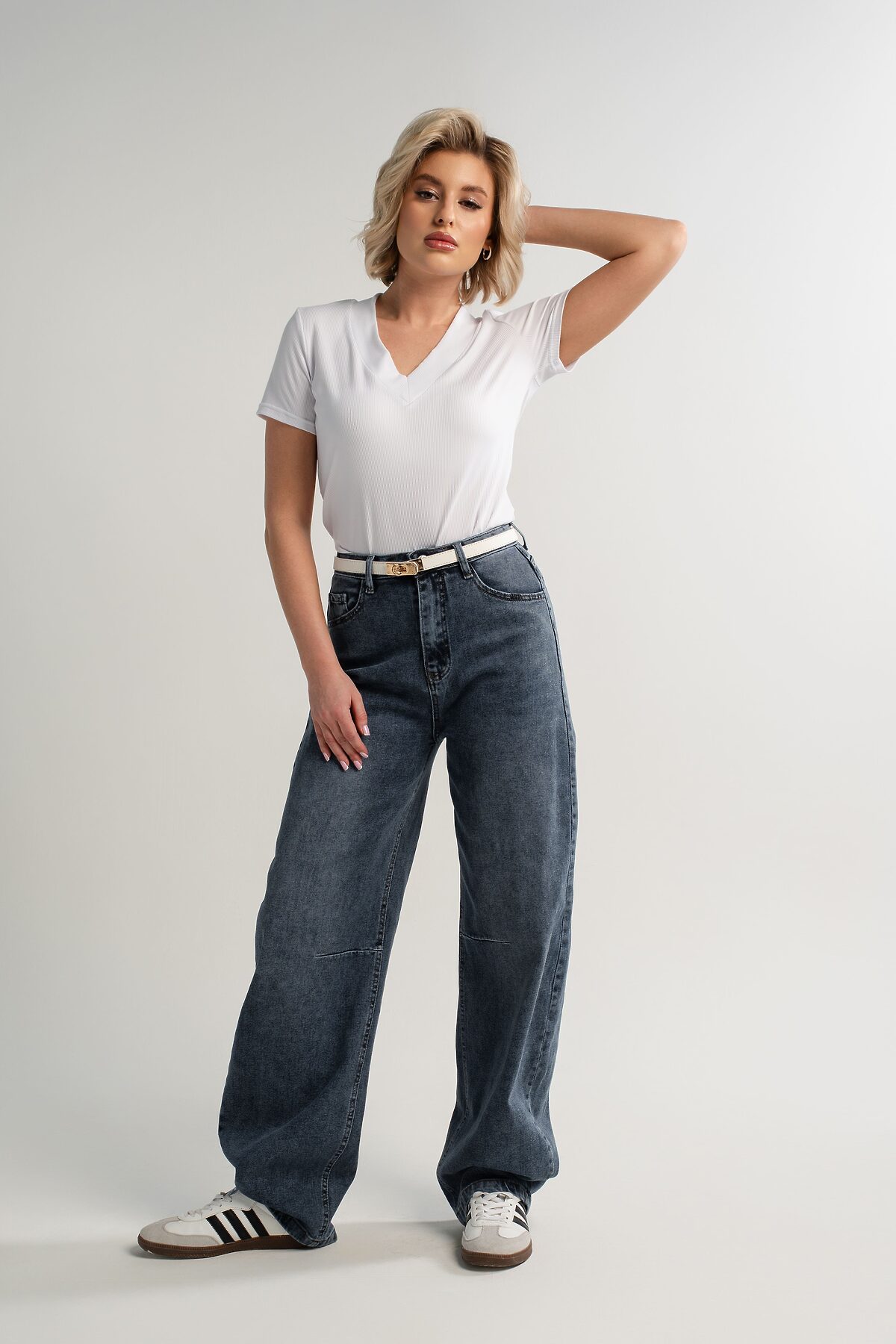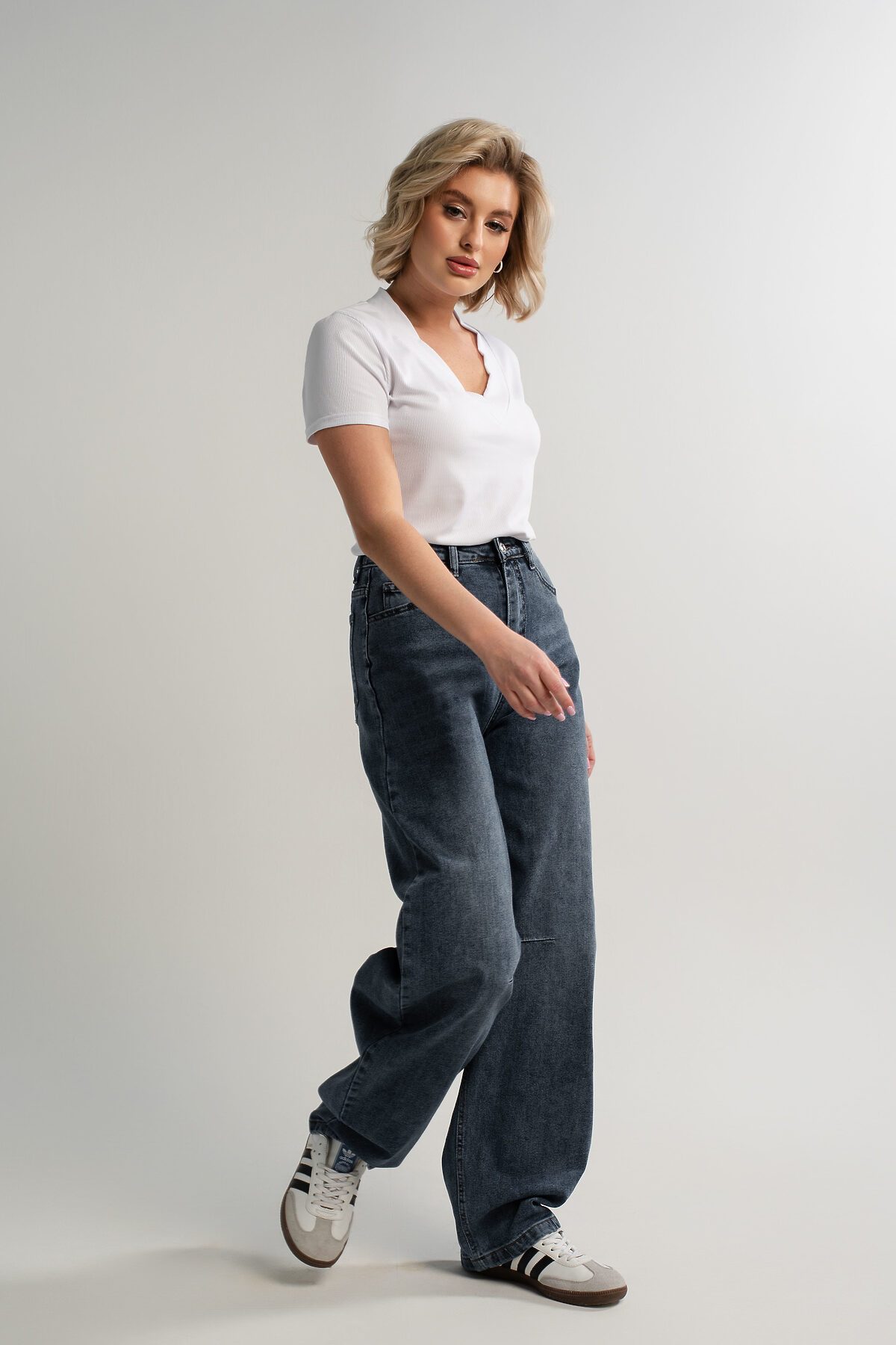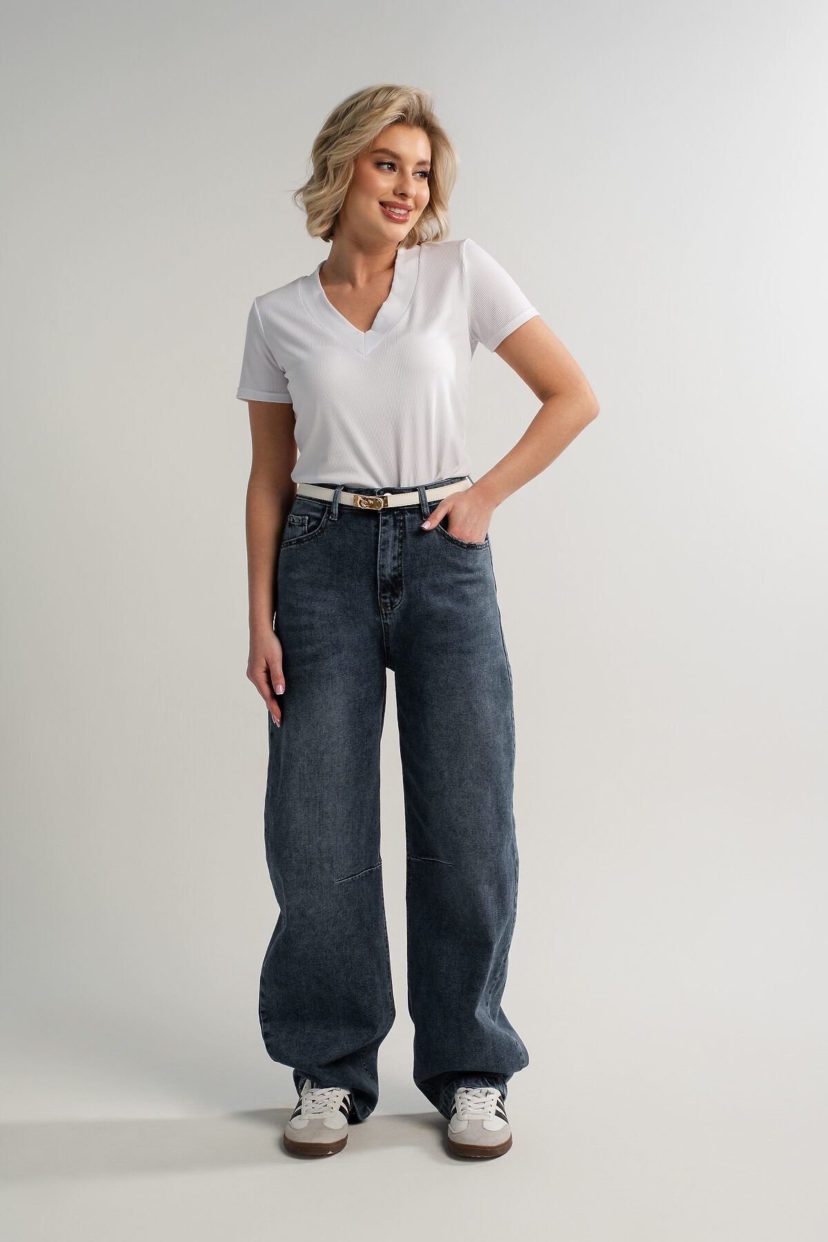 Стильные джинсы с высокой посадкой — отличное решение для современной женщины, ценящей комфорт и актуальный образ. Они оснащены молнией и пуговицей, передними и задними карманами, а также шлёвками для ремня. Широкий крой от бедра обеспечивает удобство и свободу движений на протяжении всего дня. Джинсы искусственно состарены и потерты, что добавляет им особый шарм и индивидуальность. Это идеальный выбор для создания модных и комфортных повседневных образов.