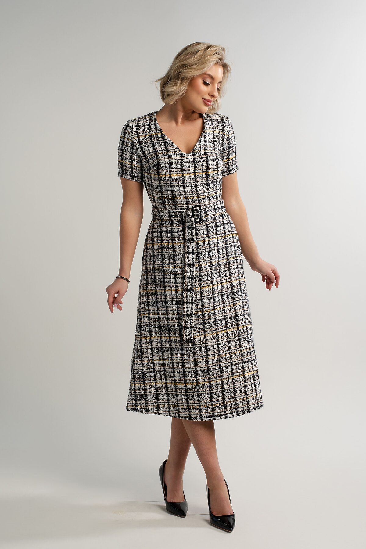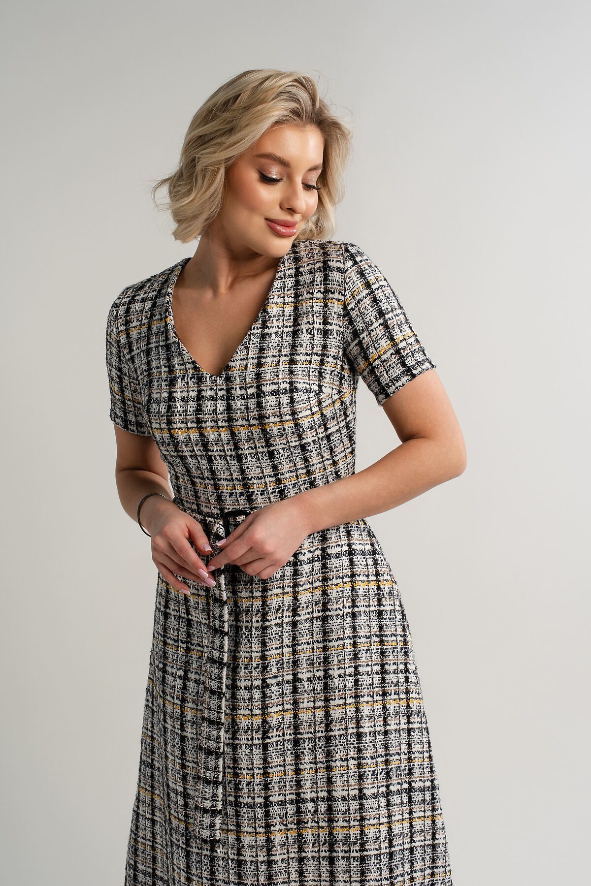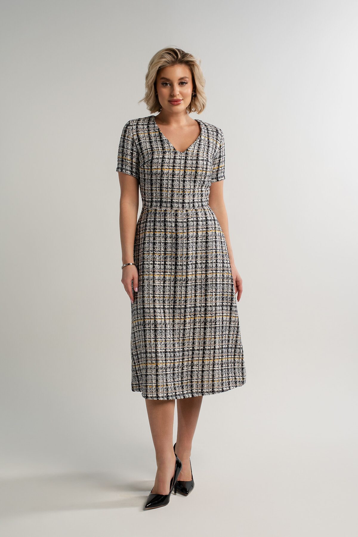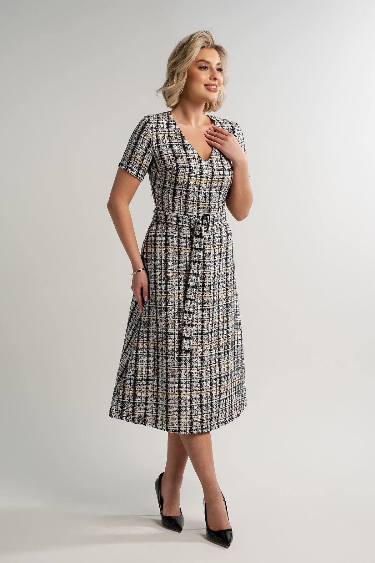 Твидовое женское платье — элегантное и универсальное решение для любого случая. V-образная горловина подчеркнет изящность, а отсутствие подкладки обеспечивает комфорт и легкость. Этот стильный наряд идеально дополнит ваш гардероб, придавая образу нотки утонченности и современного шика.