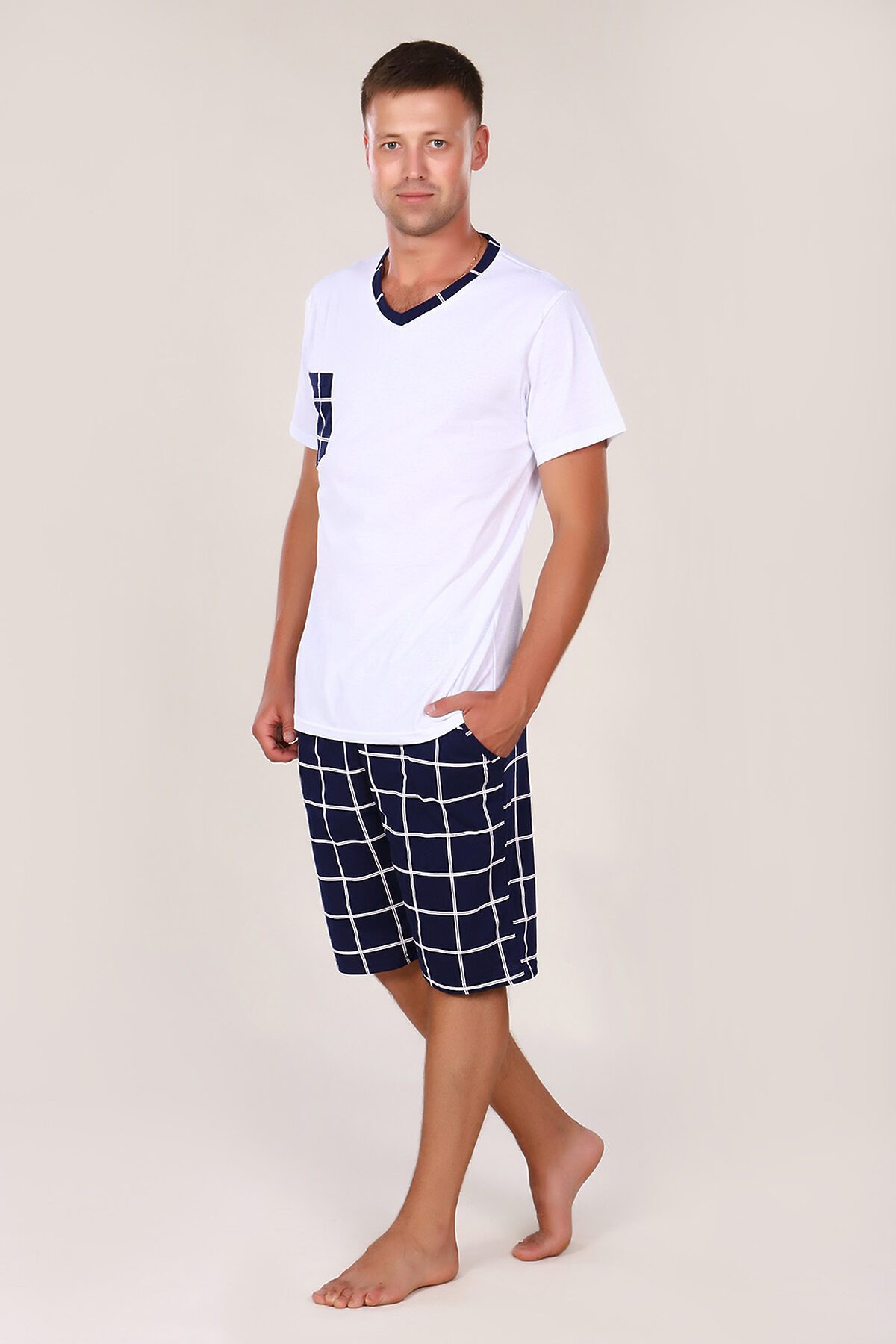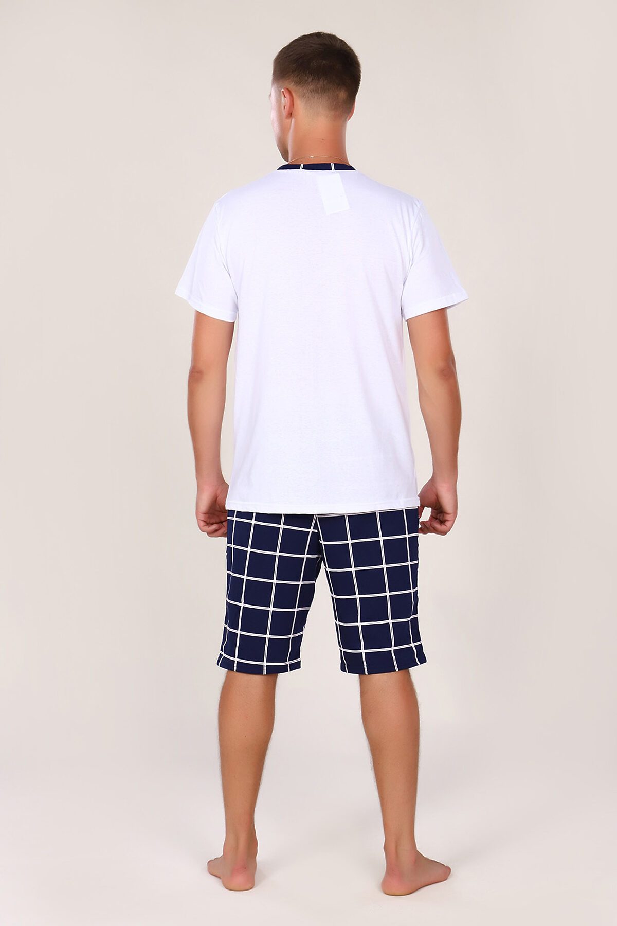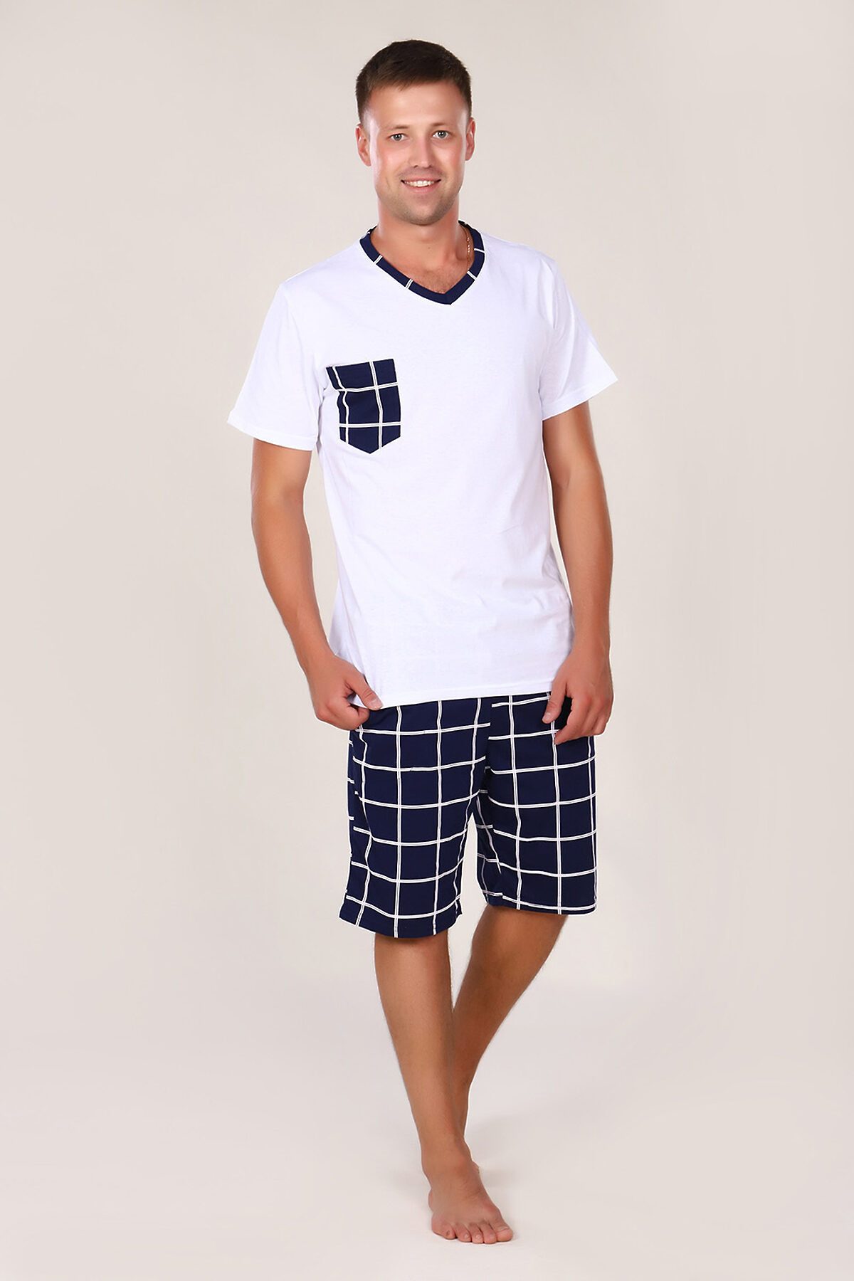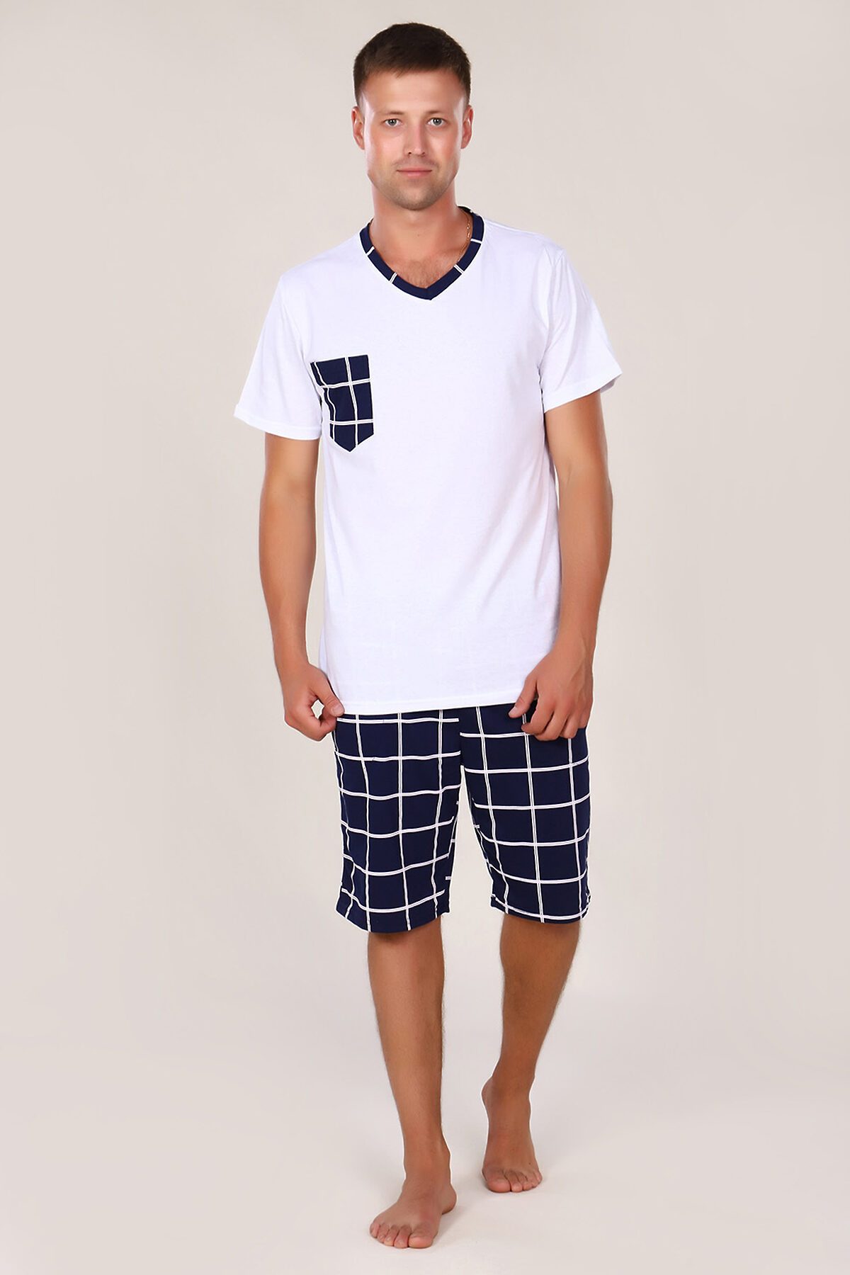 Этот мужской костюм представляет собой комплект для повседневного или домашнего использования, состоящий из белой футболки свободного кроя и темно-синих шорт в клетку. Основные характеристики Материал: Обе составляющие части выполнены из 100% хлопка, что обеспечивает комфорт, воздухопроницаемость и гипоаллергенность. Футболка: Белого цвета, свободного кроя (оверсайз), что подразумевает более широкую и длинную модель по сравнению с классическими футболками. Она оснащена накладным карманом на груди. Шорты: Темно-синего цвета с рисунком в клетку. Имеют карманы и пояс на резинке. Размерный ряд: Представлен в широком ассортименте размеров, включая большие размеры (от 48 до 62). Этот комплект сочетает в себе стиль и практичность, идеально подходит для отдыха или неформальных мероприятий.