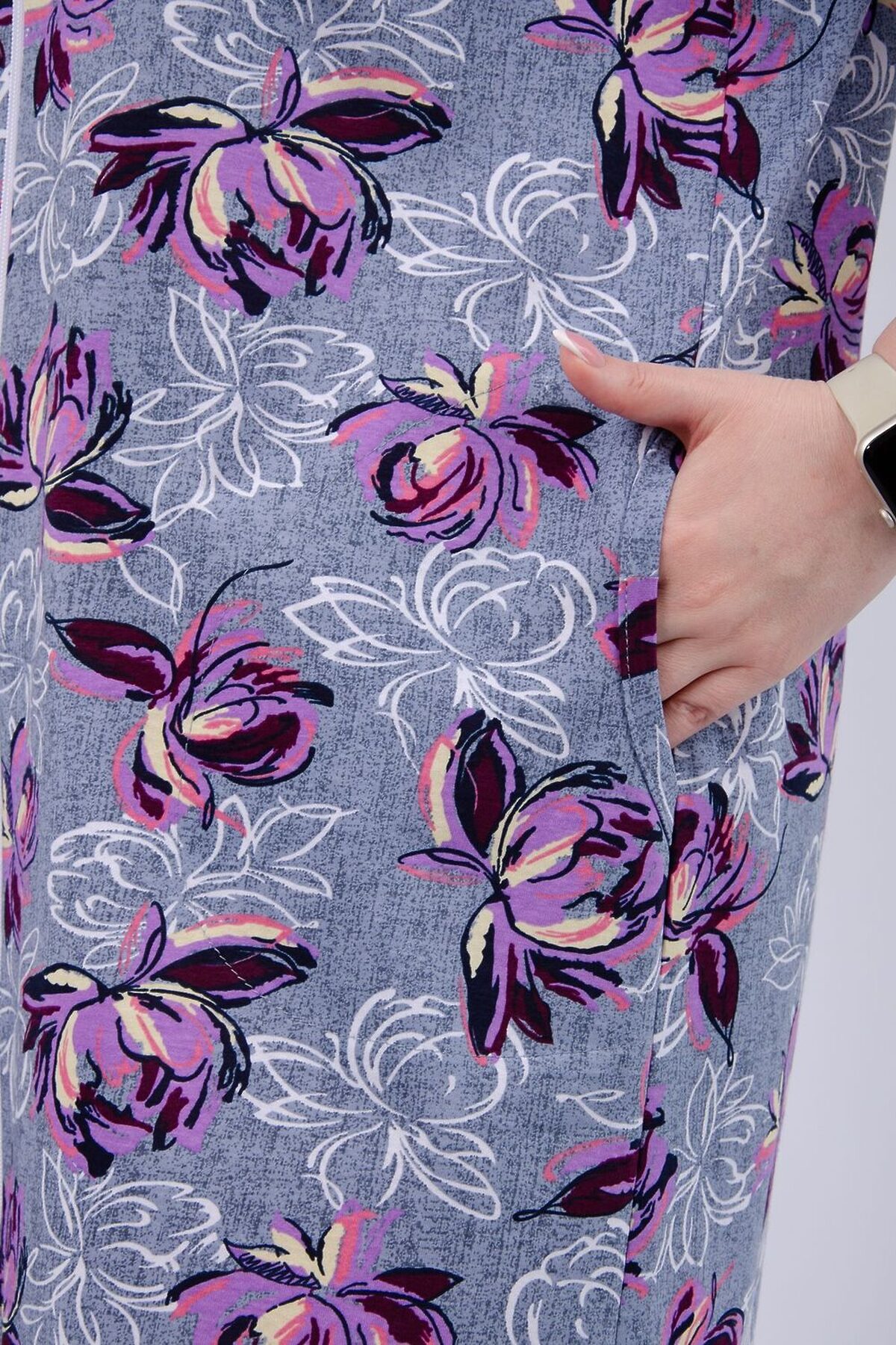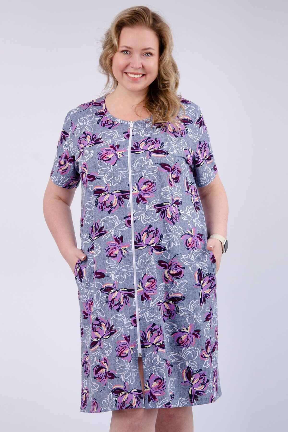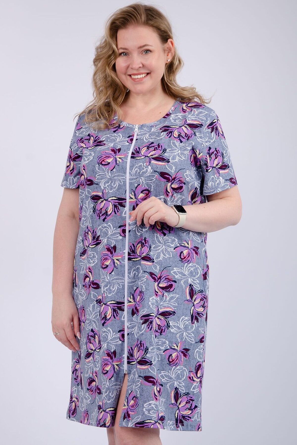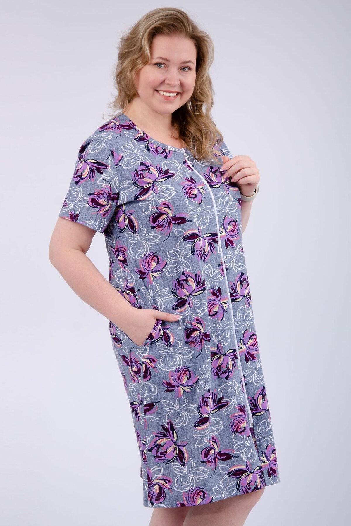 Женский халатик на молнии самая распространенная и универсальная одежда для домашнего отдыха и хозяйственных хлопот. После трудного рабочего дня, приходя домой, первым делом хочется переодеться. И данная модель это идеальный вариант среди представительниц прекрасной половины человечества. Модель выполнена из 100% хлопчатобумажной ткани.