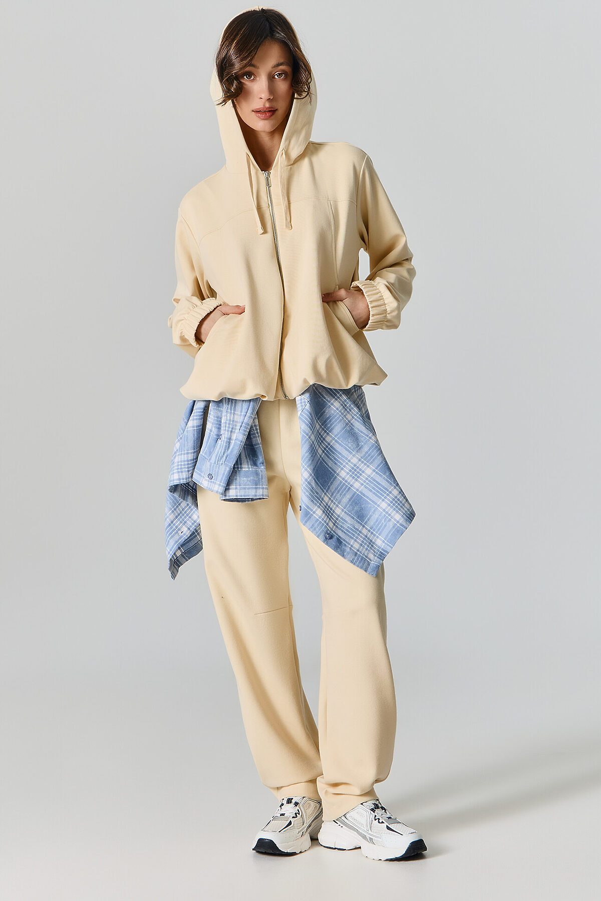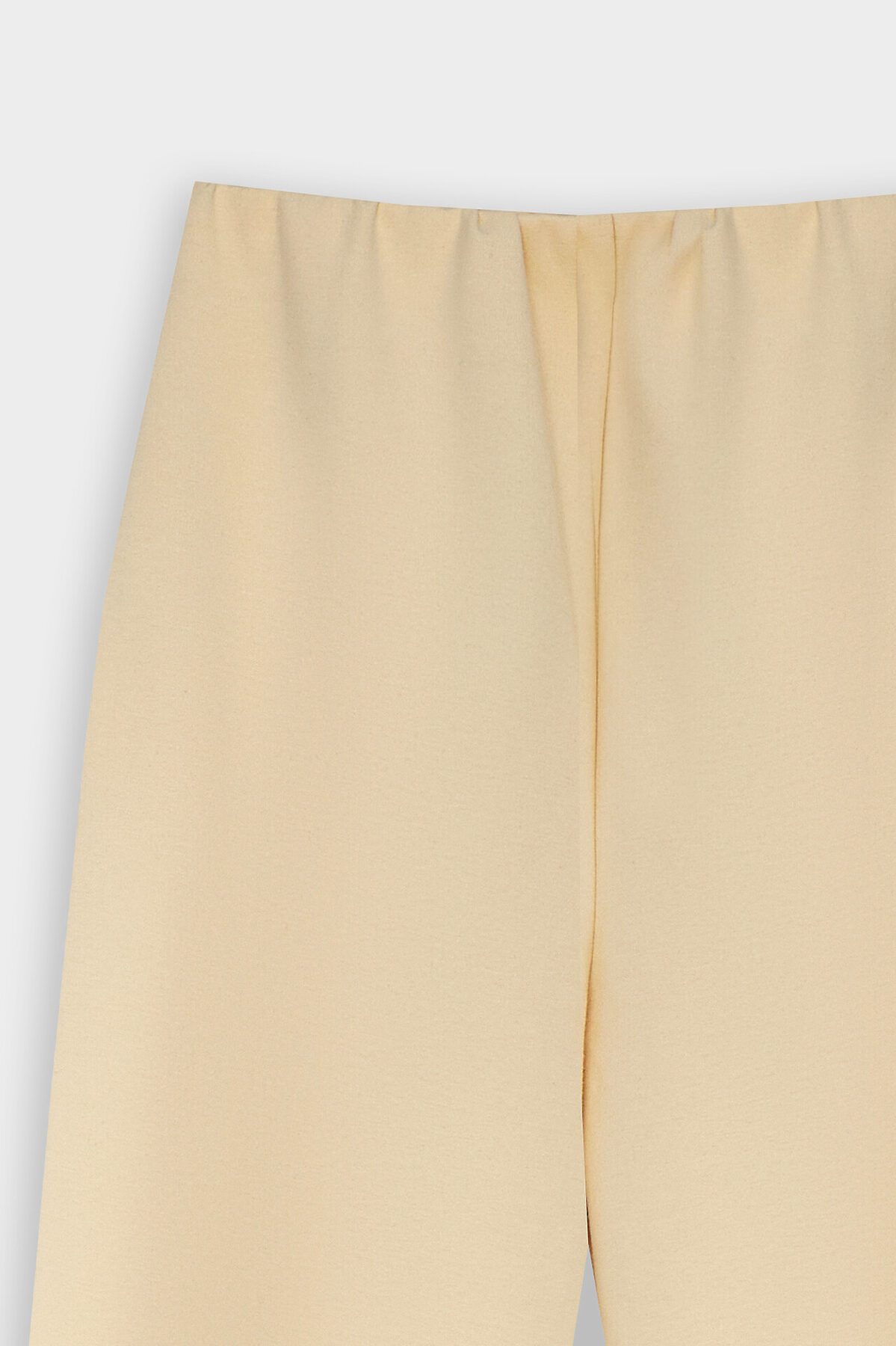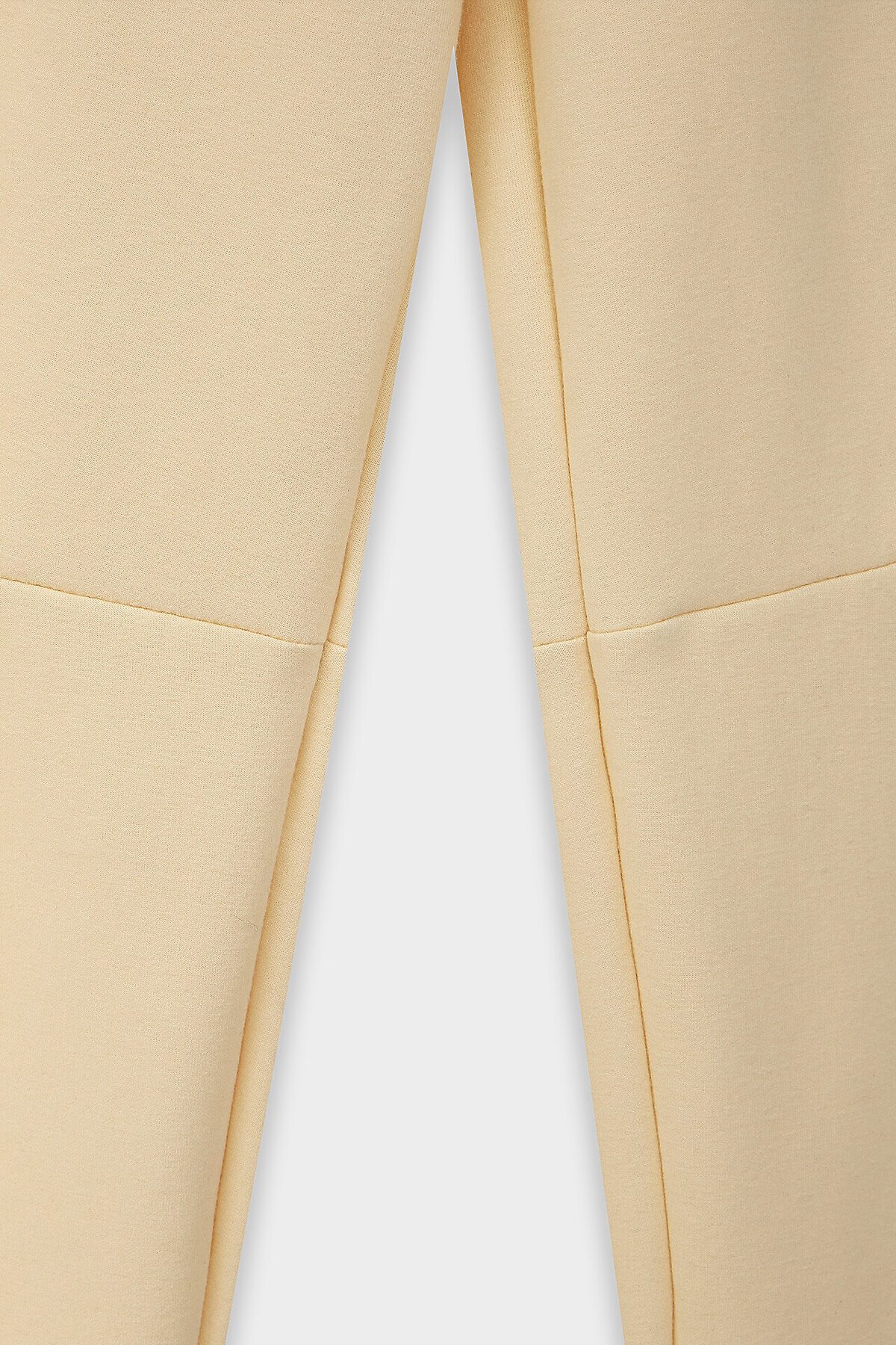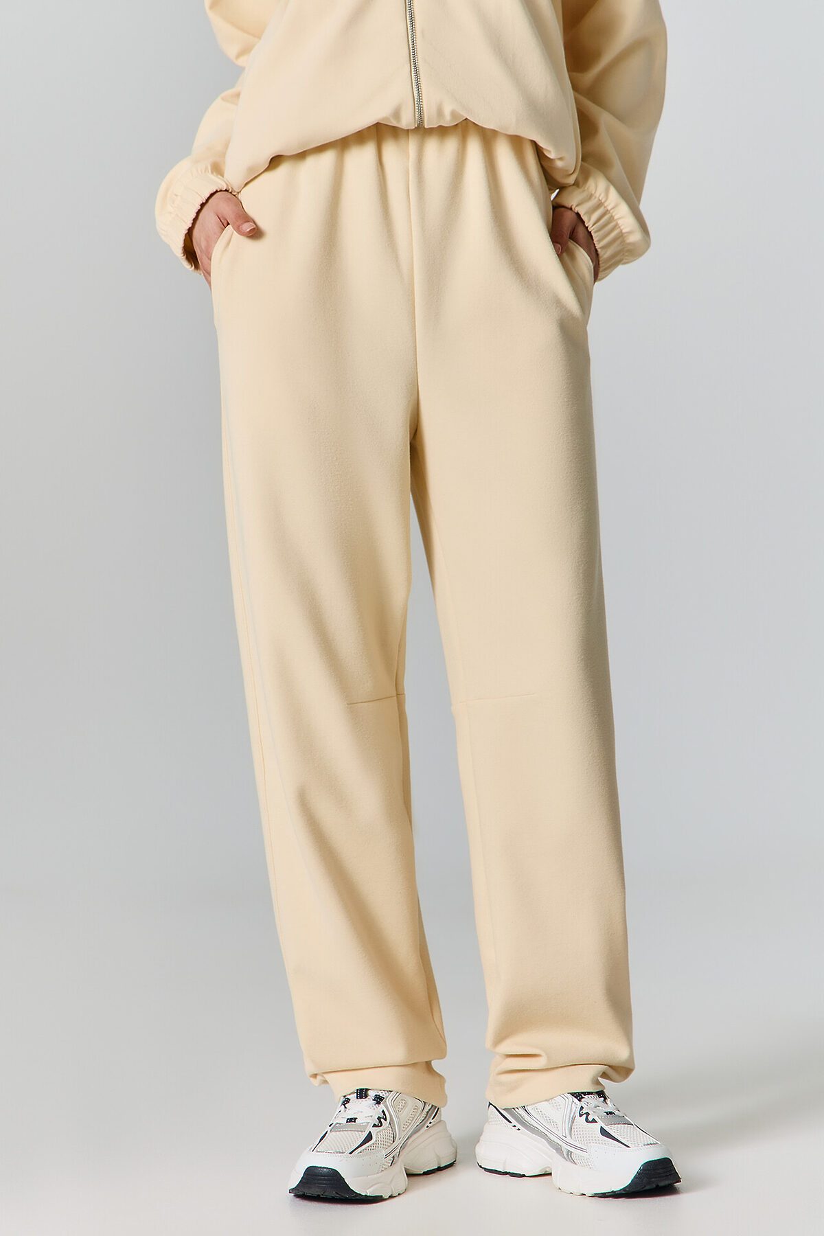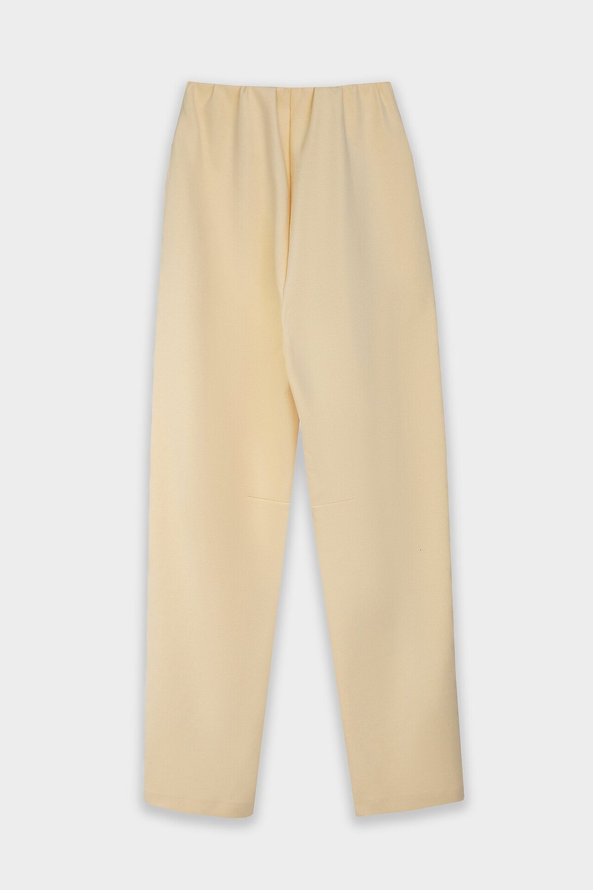 Боковые швы смещены вперед, чтобы создать более плавный и женственный силуэт. На поясе предусмотрена мягкая резинка, а в боковых швах спрятаны удобные карманы. Особый крой в области колена позволяет брюкам сохранять свою форму и не сковывать движения при ходьбе.