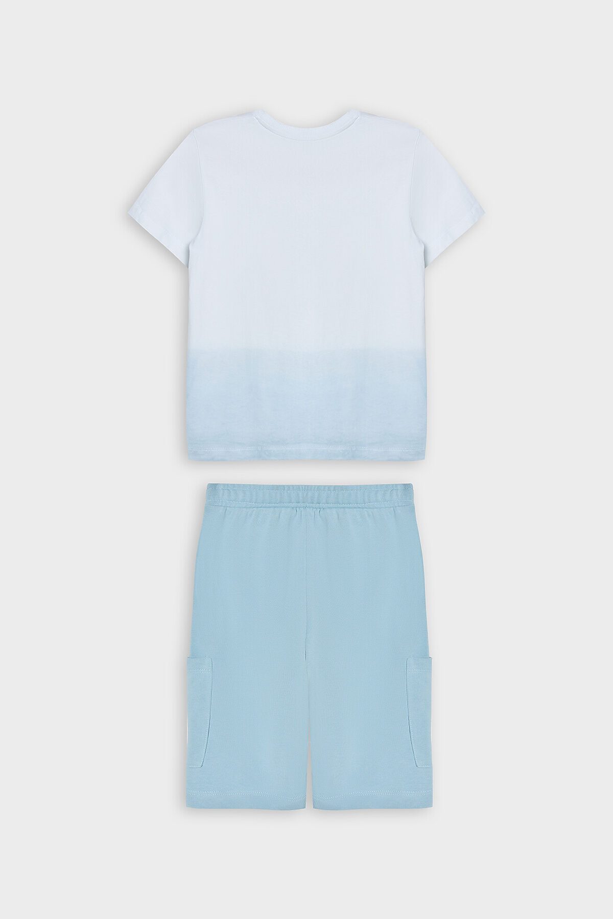 Комплект состоит из футболки и шорт. Футболка прямого силуэта. Рукава втачные короткие. Горловина круглой формы, обтачка из рибаны. Шов втачивания рибаны по спинке закрыт бейкой из основного полотна. Низ футболки и рукавов обработан швом в подгибку. Шорты прямого силуэта. Пояс отрезной с эластичной тесьмой внутри. По поясу проложены две декоративные строчки, внутри пробиты петли и втянута х/б тесьма. По переду имитация гульфика. На деталях переда накладные карманы. Низ изделия обработан швом в подгибку.