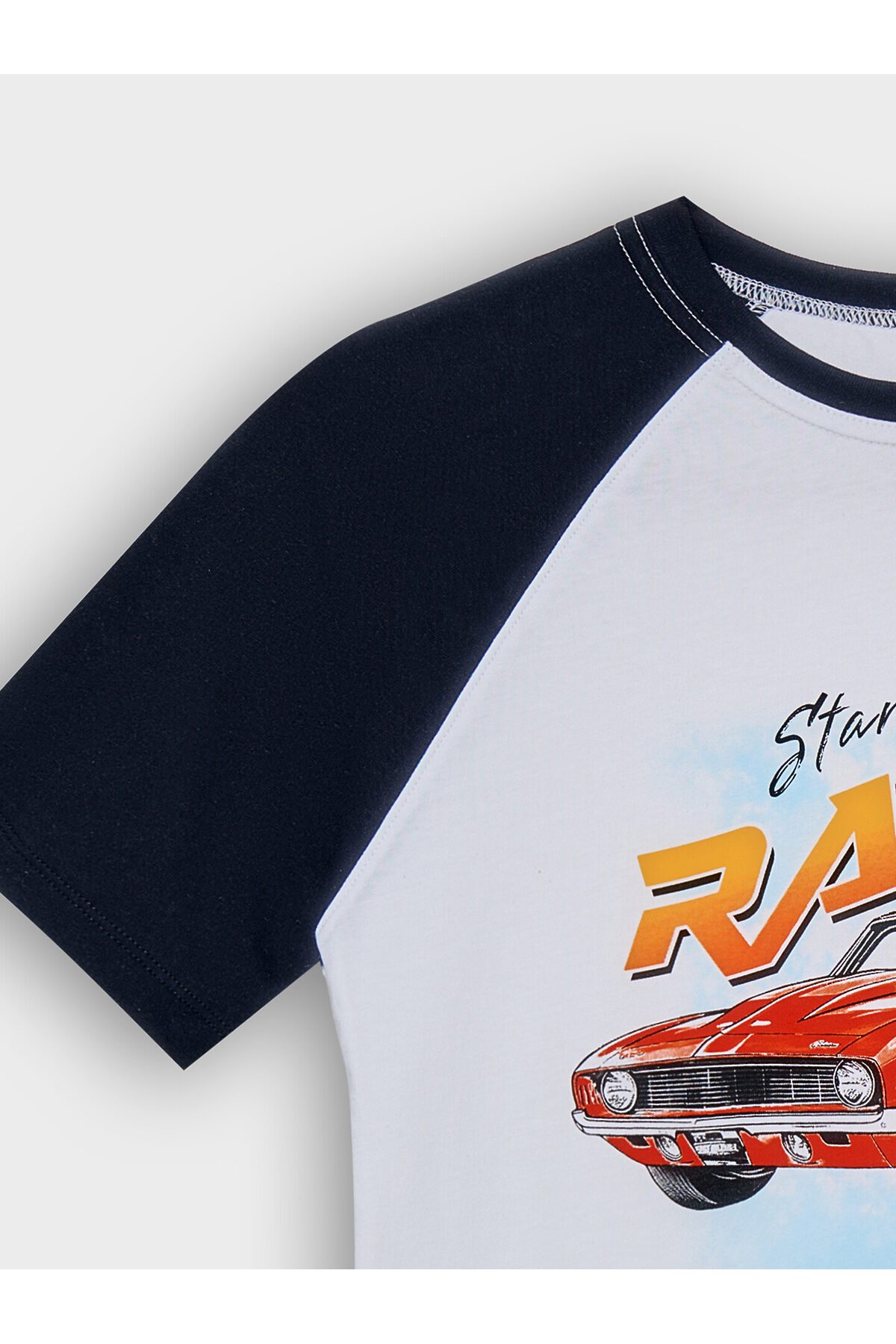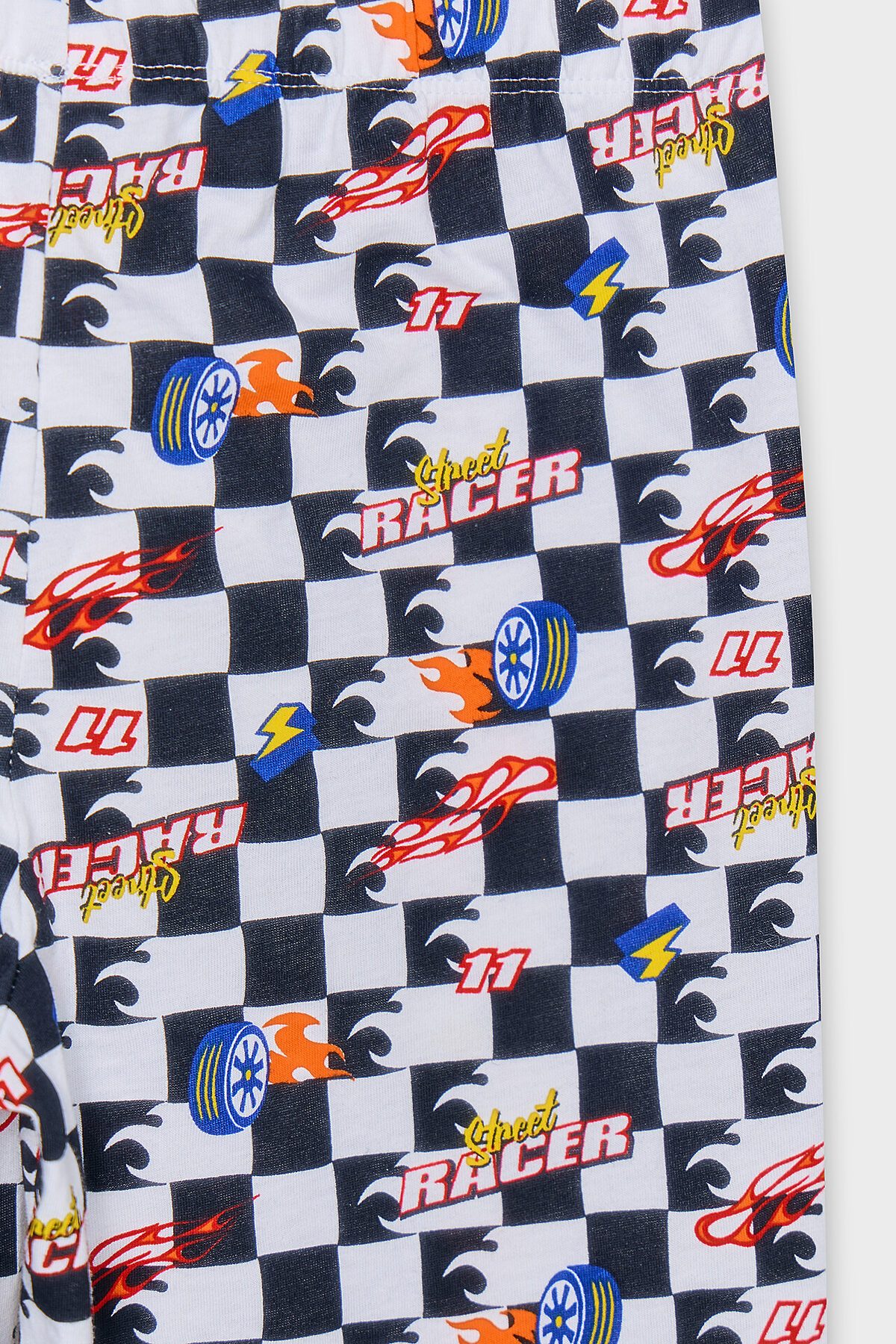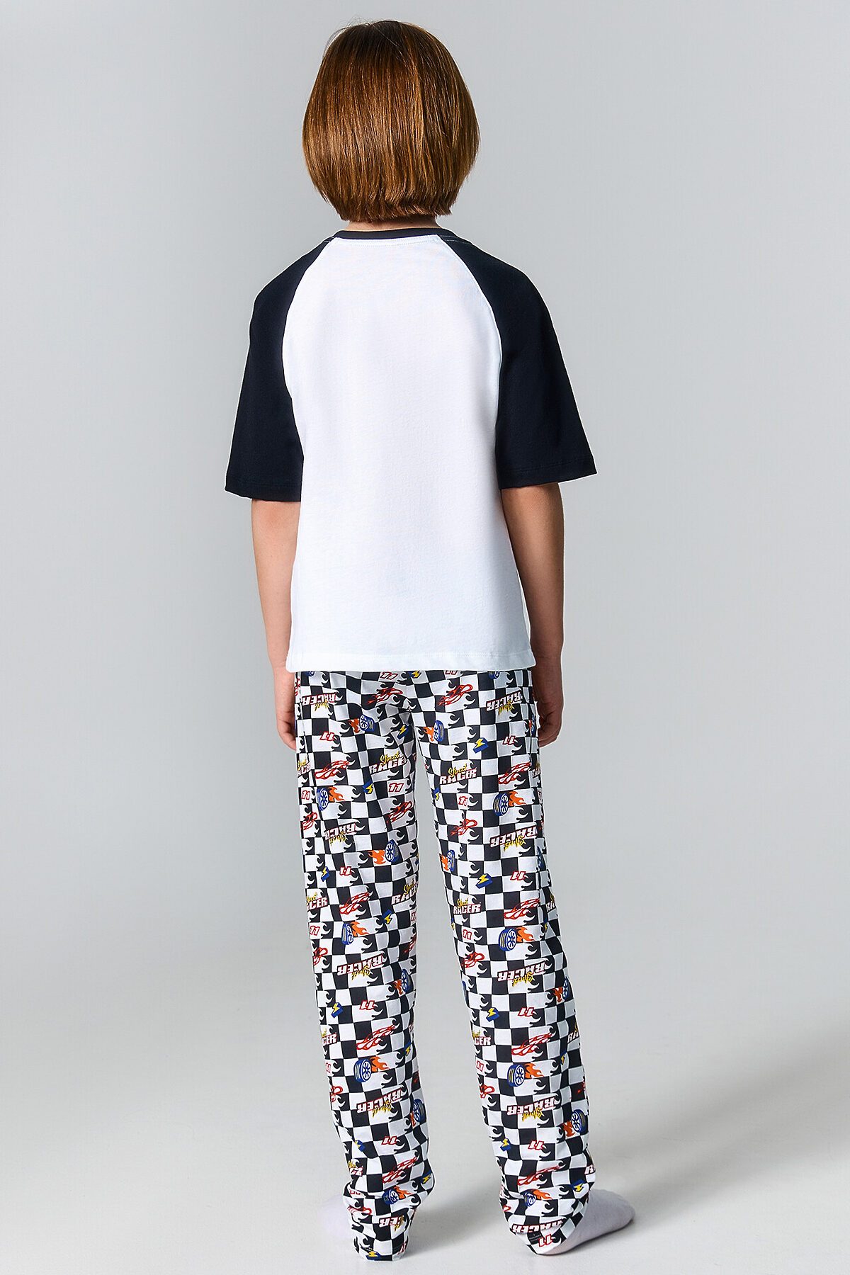 Комплект для мальчиков состоит из джемпера и брюк. Горловина круглой формы с притачной обтачкой из рибаны 1*1, R-24 (R11-062.02.220), 96% хлопок; 4% эластан, 160 см, 220 гр/м?. Рукава короткие, реглан. Перед и спинка цельнокроеные. Низ джемпера и рукавов обработан швом в подгибку. Брюки длинные, прямые. По верхнему срезу брюк настрочена эластичная жаккардовая тесьма 25мм, JT1-25. Низ брюк застрочен вподгибку.