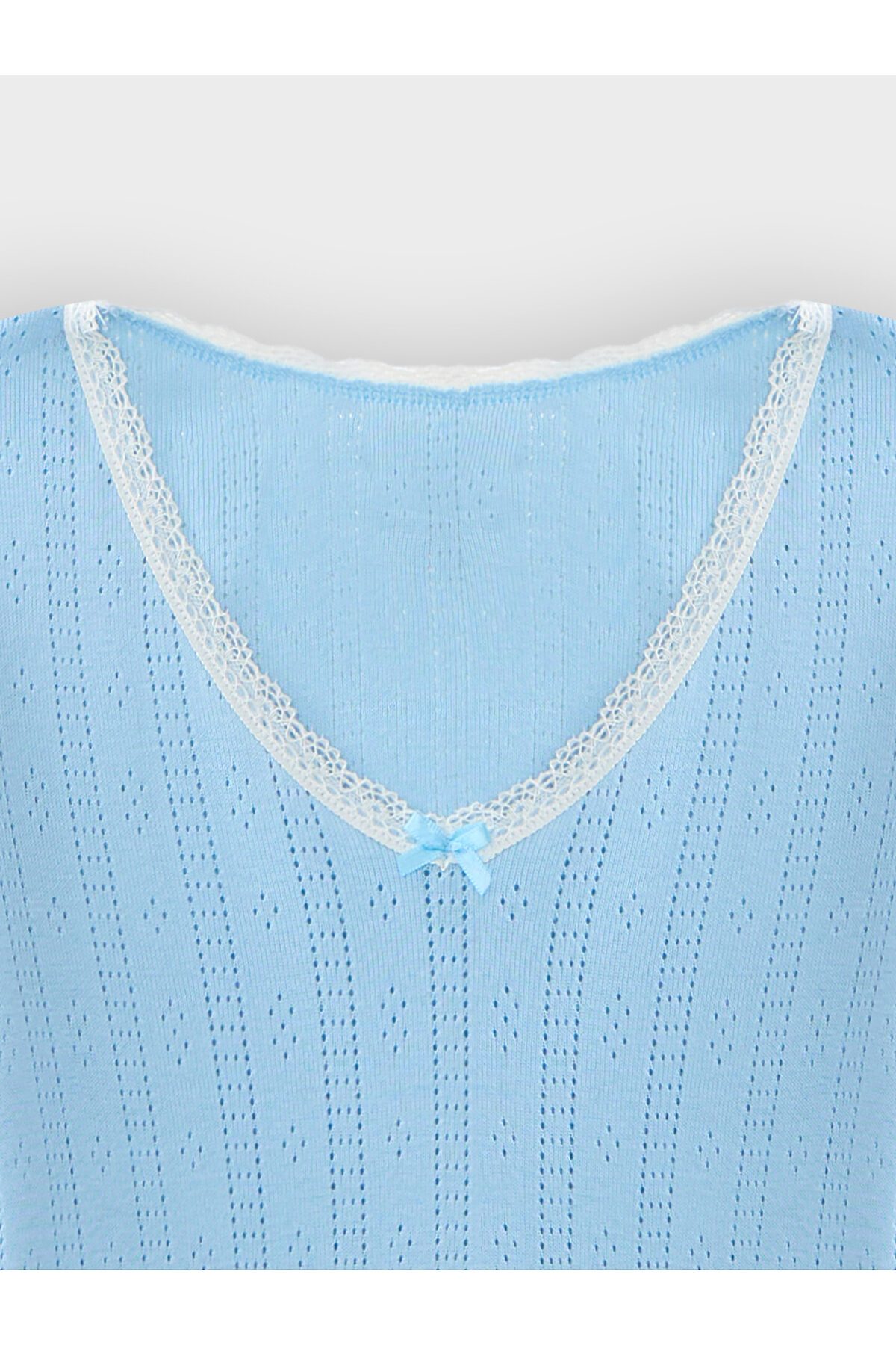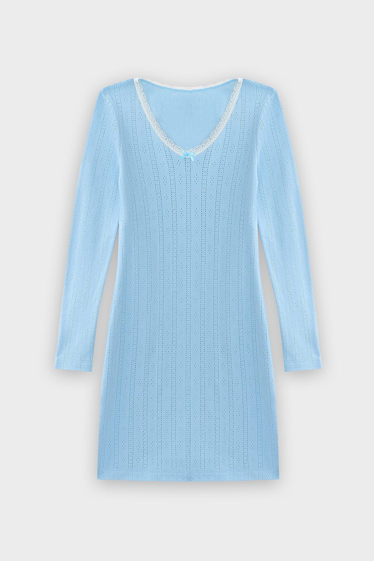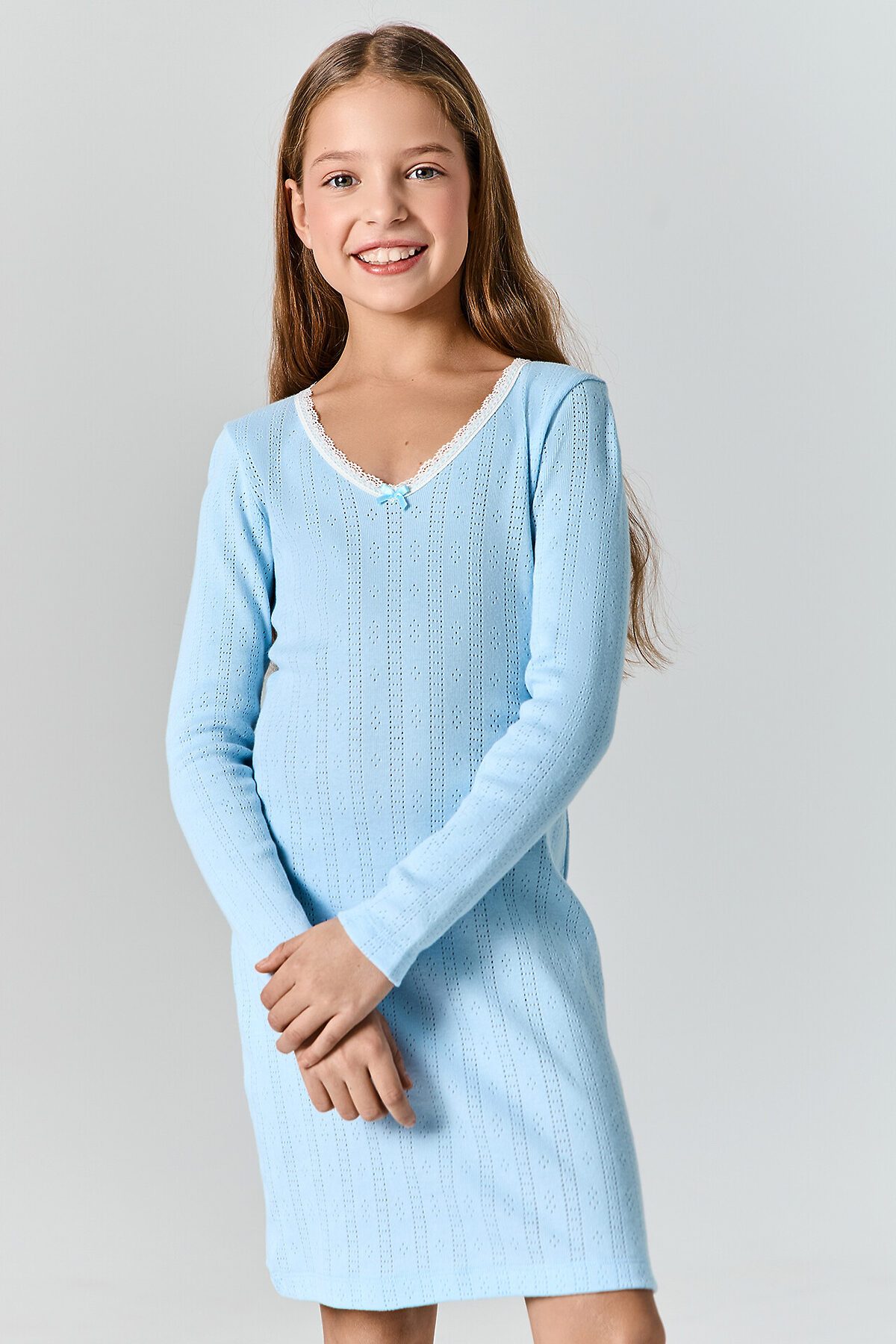 Сорочка полуприлегающего силуэта для девочек. Горловина V-образной формы, обработана кружевом Devsel L20166-1.5, ширина 15мм. Рукава длинные втачные, одношовные. Перед и спинка цельнокроеные. Низ изделия и рукавов обработаны на 2-х игольной плоскошовной машине швом в подгибку. Декор по заданию - бантик (6737-0011А)