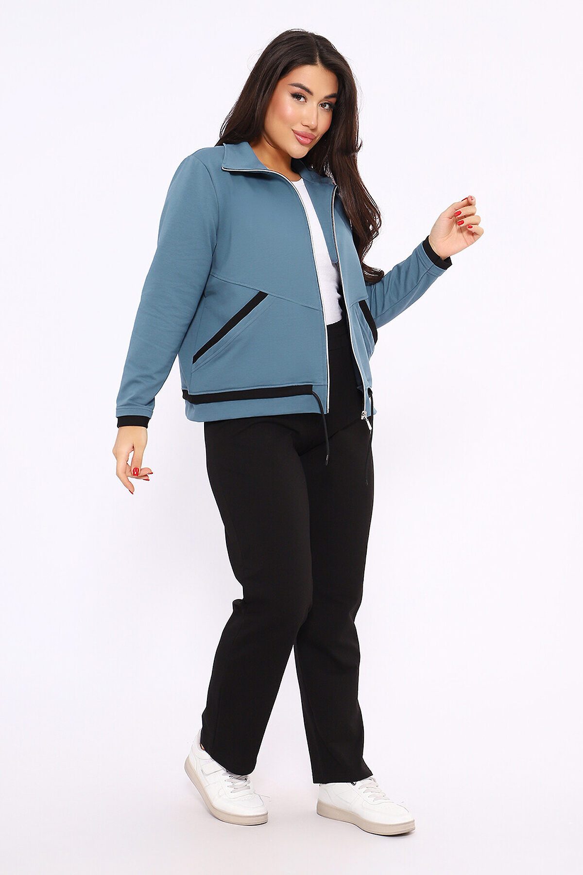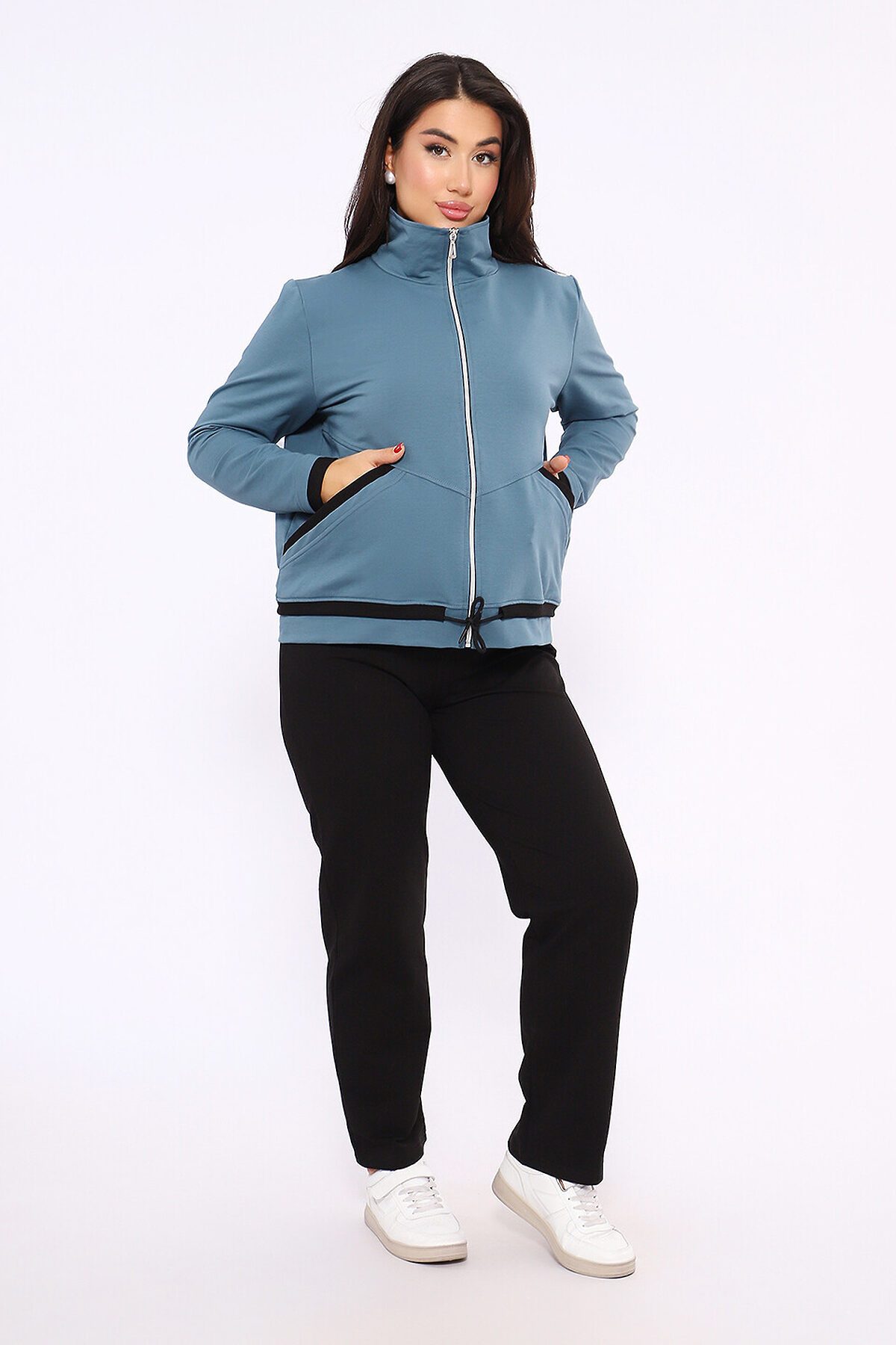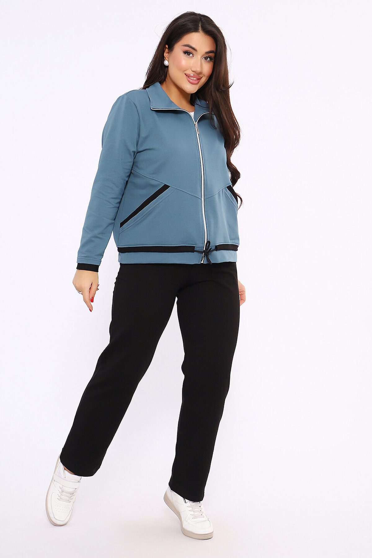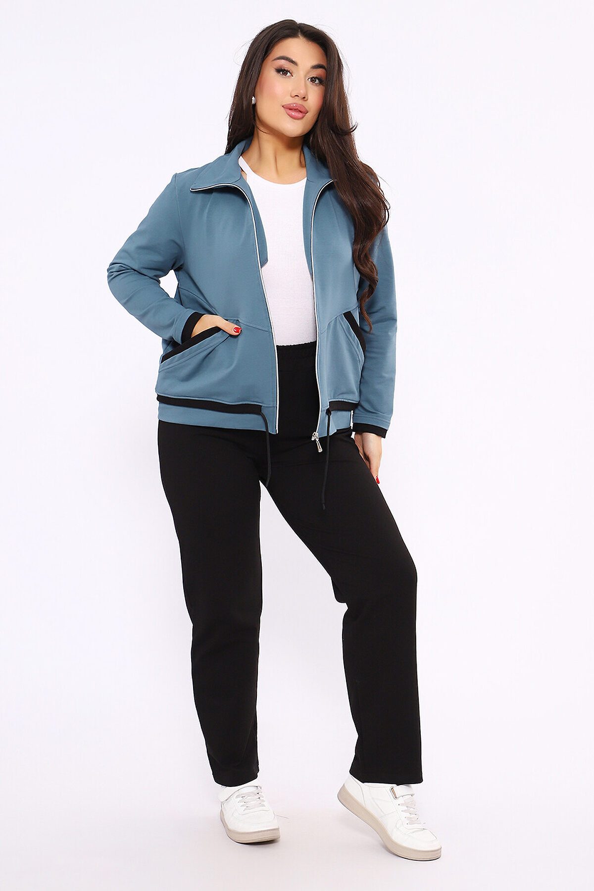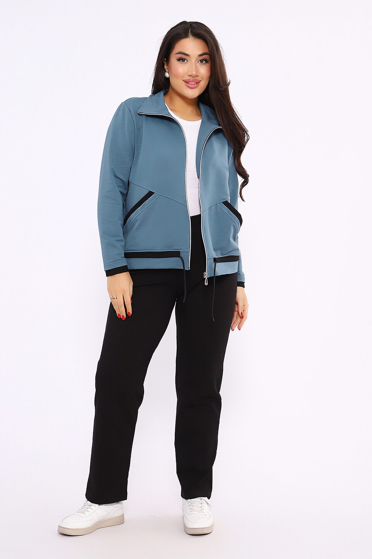 Этот женский спортивный костюм состоит из олимпийки на молнии с воротником-стойкой и черных спортивных брюк, изготовленных из мягкого и прочного материала футер 2-х нитка Описание Комплекта Верх (Олимпийка) Фасон: Легкая спортивная куртка прямого силуэта на полной застежке-молнии. Детали: Оснащена удобными боковыми карманами и воротником-стойкой. Низ (Брюки) Цвет: Черные спортивные брюки. Фасон: Брюки от костюма с поясом на резинке, обеспечивающим комфортную посадку.