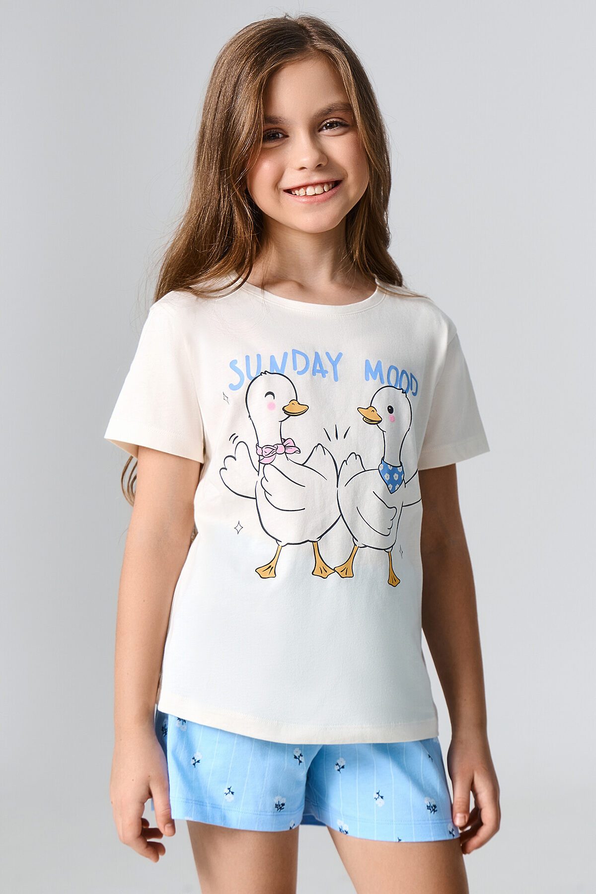 Пижама для девочек — идеальное сочетание комфорта и легкости для спокойного сна. Футболка свободного кроя с круглой горловиной и короткими рукавами обеспечивает удобную посадку, позволяя двигаться без ограничений. Она не сковывает движения и дарит ощущение мягкости благодаря натуральному материалу. Шорты длиной до колен с эластичным поясом мягко прилегают к телу, гарантируя комфорт и свободу движений. Их свободный крой делает пижаму универсальным вариантом для теплых ночей и домашнего отдыха. Выполненный из трикотажной кулирки комплект приятен к коже, воздухопроницаем и обеспечивает уютную атмосферу для сна. Отличный выбор для спокойных ночей, дарящий мягкость, удобство и приятные ощущения!