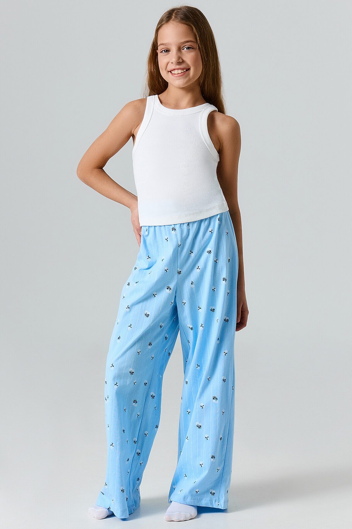 Брюки для девочек домашние MARK FORMELLE, цветы на голубой полоске