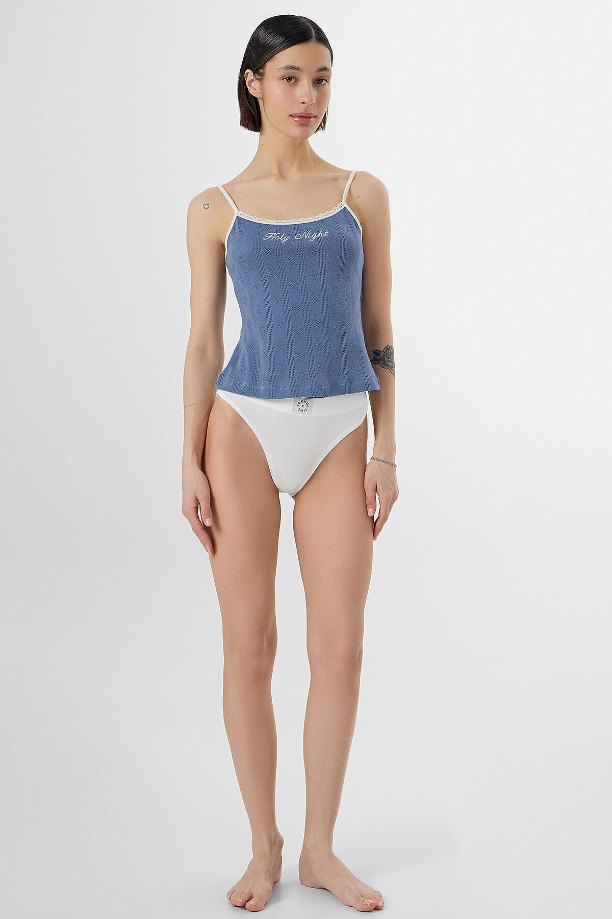 Топ женский из рибаны, силуэт прилегающий. Верхний край переда и спинки обработан кружевом 1,5 см (код L56-1,5 см, артикул L20166). Бретели из основного полотна, внутри жилка 6 мм (WT4-6, девсель 13460W). Нижний срез обработан швом вподгибку. Бантик по заданию.