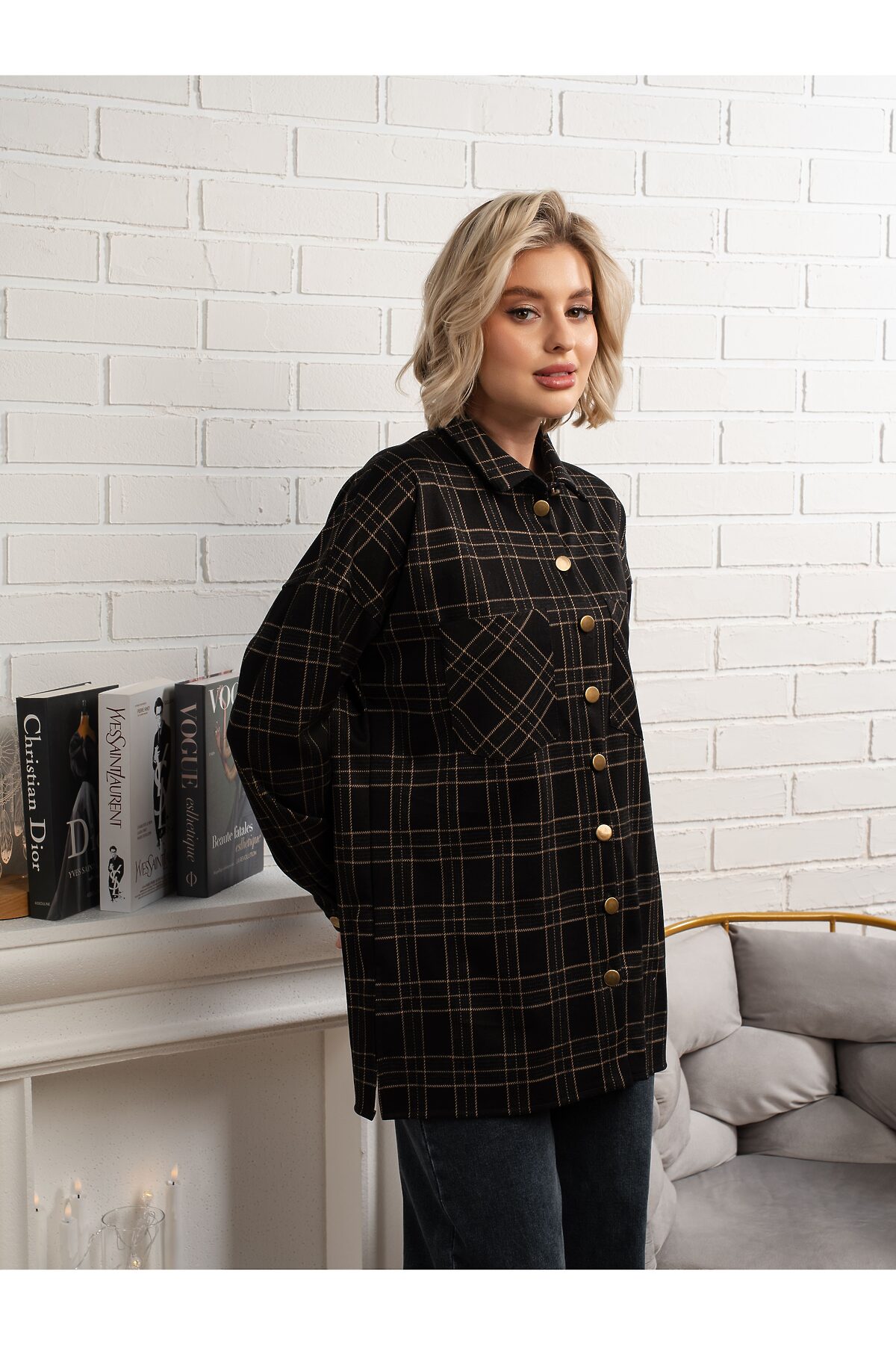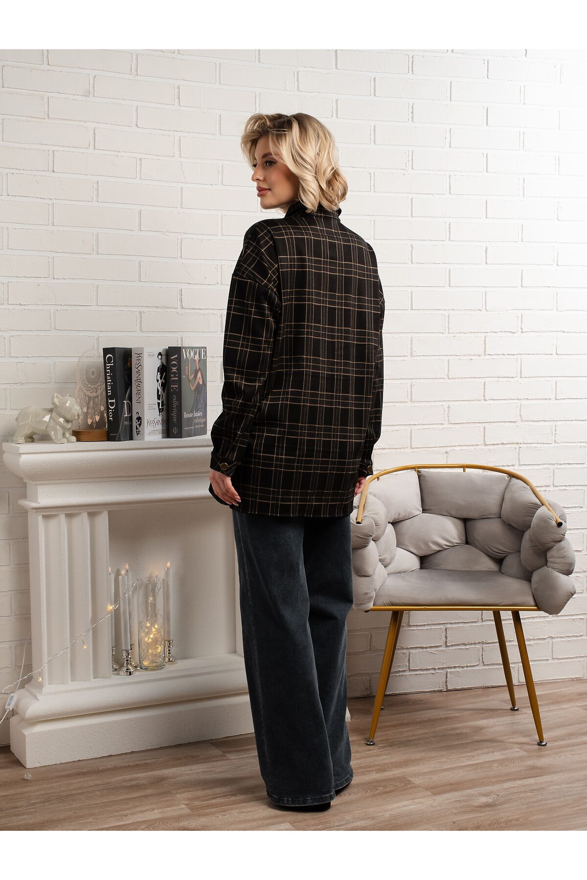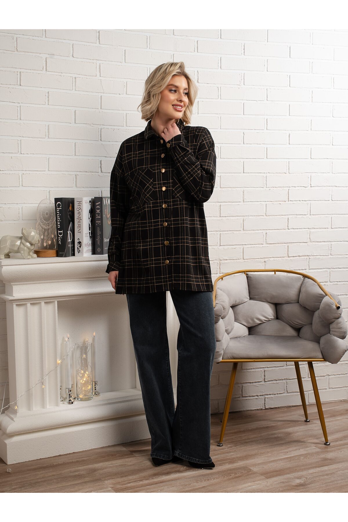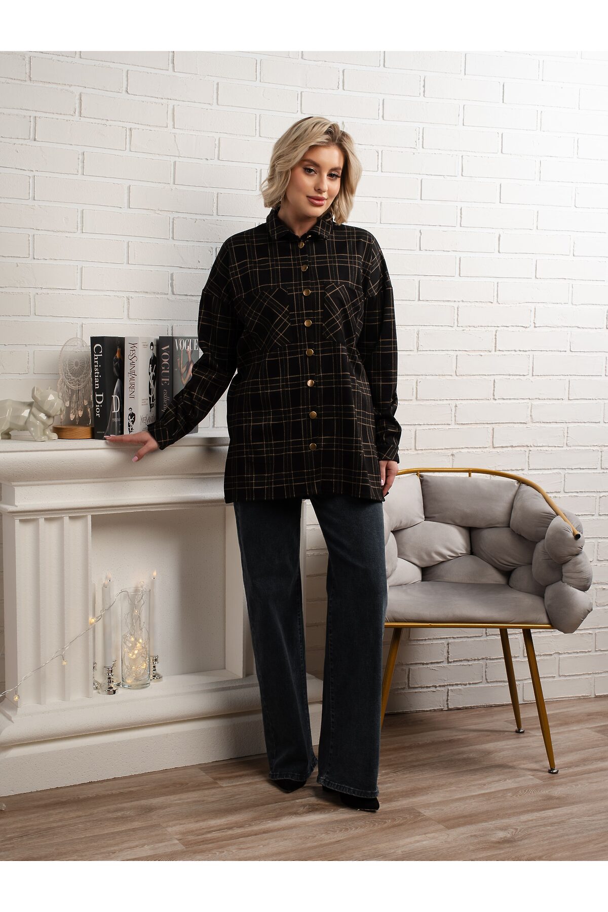 Добавьте в свой гардероб универсальный элемент с этой стильной рубашкой в клетку. Черная основа с тонкой бежевой клеткой создает элегантный и актуальный вид. Рубашка имеет прямой свободный крой, который выглядит модно и обеспечивает комфорт. Длинные рукава с манжетами на пуговицах и классический отложной воротник придают ей завершенный вид. Удобная удлиненная длина идеально подходит для создания многослойных образов, сочетаясь как с джинсами, так и с леггинсами. Акцентные золотистые пуговицы добавляют изысканности.