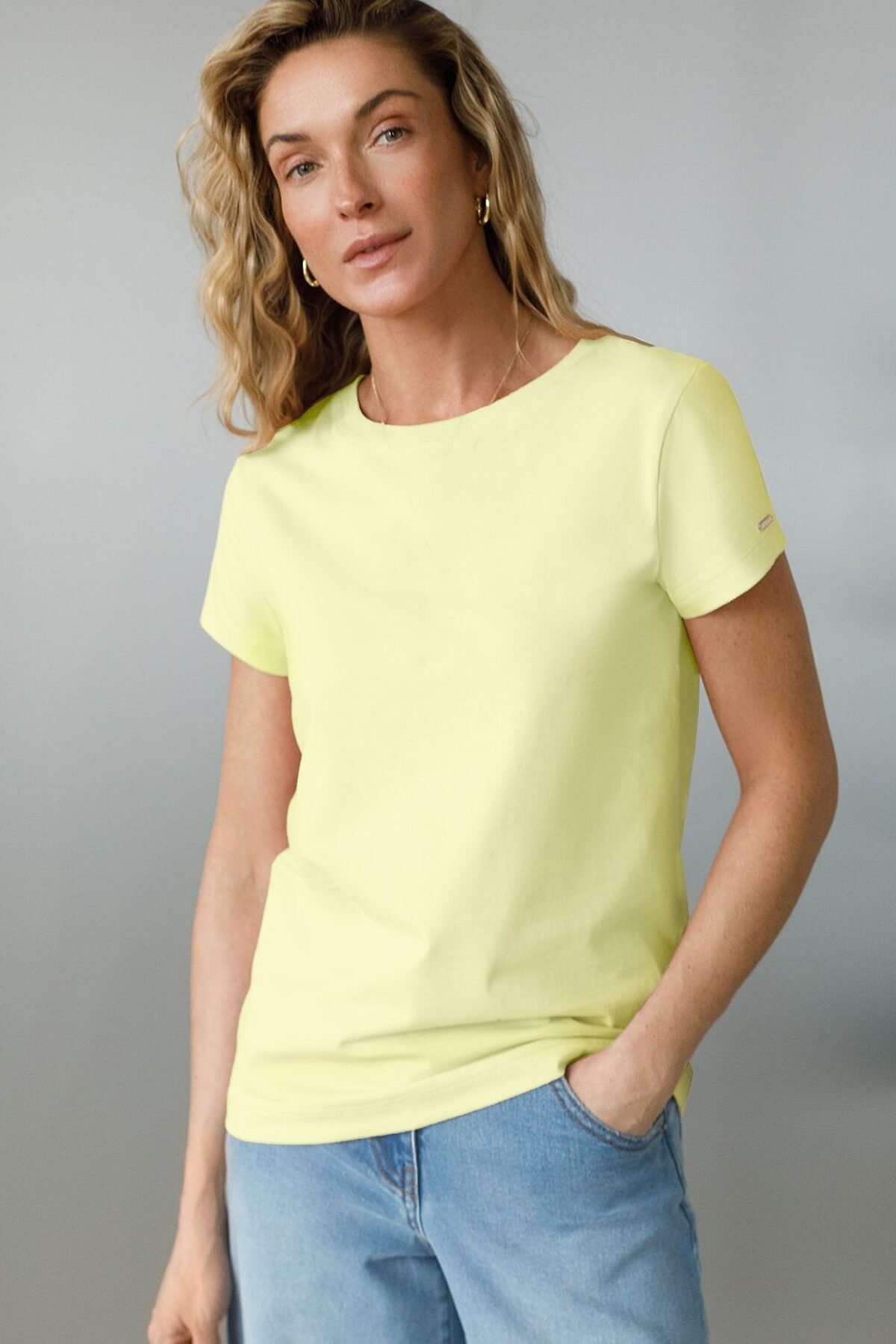 Стильная и модная женская футболка лимонного цвета станет отличным дополнением к вашему гардеробу. Футболка плотностью 170 Г/м2 изготовлена из премиального хлопка с добавлением эластана. Добавление эластана в состав изделия способствует формоустойчивости. Эта классическая футболка подходит для создания кэжуал образа на каждый день и идеально подойдет для работы. Модель не мнется, что делает ее практичным вариантом для активных женщин, которые ценят стиль и удобство. Благодаря однотонной расцветке эта футболка легко комбинируется с различными элементами гардероба. Она станет универсальным решением для тех, кто предпочитает комфортный стиль casual. Повседневная футболка подчеркнет вашу индивидуальность и позволит вам выглядеть привлекательно в любой ситуации. Легкость в уходе и высокая износостойкость делают ее незаменимой вещью в вашем гардеробе. Одевайте эту модель как на работу, так и на встречу с друзьями — она всегда будет уместна! Стильная и практичная модель с простым кроем и лаконичным дизайном - идеальный вариант для тех, кто ценит качество, минимализм и классический стиль в одежде.