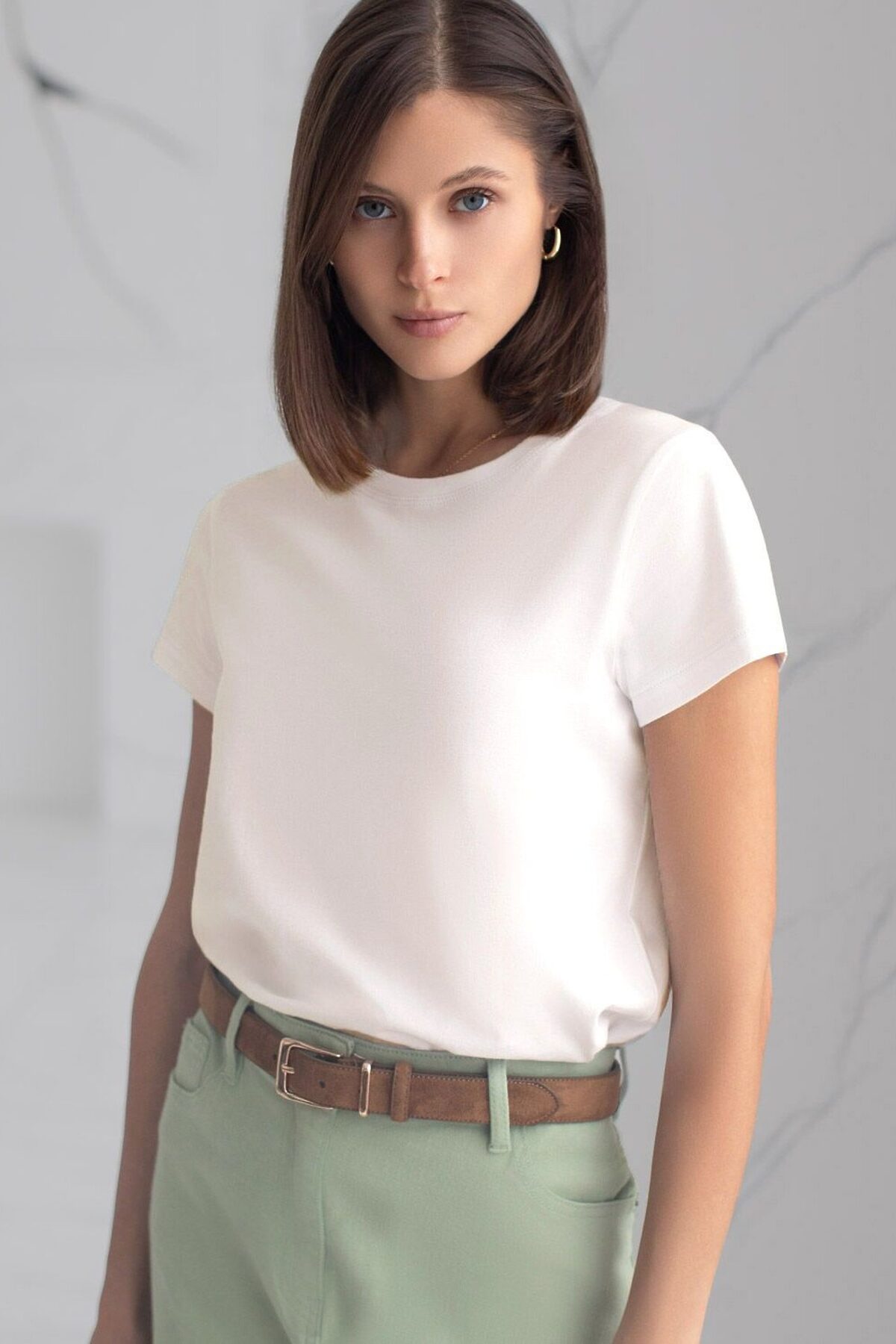 Стильная и модная женская футболка молочного цвета станет отличным дополнением к вашему гардеробу. Футболка плотностью 170 Г/м2 изготовлена из премиального хлопка с добавлением эластана. Добавление эластана в состав изделия способствует формоустойчивости. Эта классическая футболка подходит для создания кэжуал образа на каждый день и идеально подойдет для работы. Модель не мнется, что делает ее практичным вариантом для активных женщин, которые ценят стиль и удобство. Благодаря однотонной расцветке эта футболка легко комбинируется с различными элементами гардероба. Она станет универсальным решением для тех, кто предпочитает комфортный стиль casual. Повседневная футболка подчеркнет вашу индивидуальность и позволит вам выглядеть привлекательно в любой ситуации. Легкость в уходе и высокая износостойкость делают ее незаменимой вещью в вашем гардеробе. Одевайте эту модель как на работу, так и на встречу с друзьями — она всегда будет уместна! Стильная и практичная модель с простым кроем и лаконичным дизайном - идеальный вариант для тех, кто ценит качество, минимализм и классический стиль в одежде.