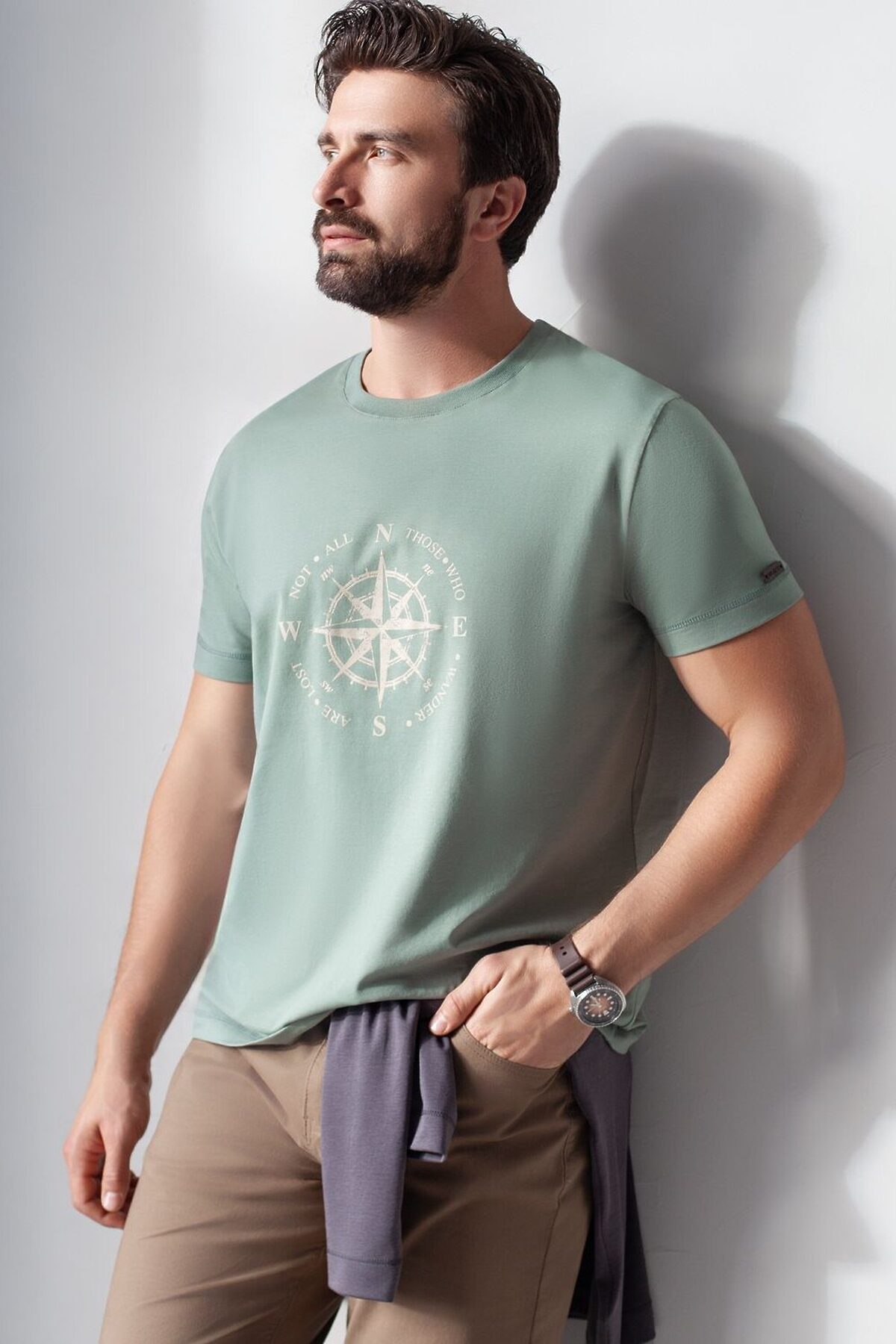 Базовая футболка светло-оливкового цвета из премиального хлопка с эластаном полуприлегающего кроя станет универсальным решением для любого случая. Прямой крой обеспечивает комфортную посадку на любую фигуру, включая большие размеры, подходит как на низкий, так и на высокий рост. Выполненная из натуральной ткани, она обладает дышащими свойствами, а за счет эластичности сохраняет форму даже после длительного ношения и многочисленных сирок. Однотонная футболка выполнена в минималистичном стиле, дополнена принтом в виде изображения компаса и надписи. Перевод надписи: Not all those who wander are lost - Не все те, кто странствует, потеряны. На рукаве нашивка из эко-кожи с логотипом VILATTE. Подходит как классический вариант для работы в офис, так и для повседневной носки или занятий спортом. Мягкая ткань приятна к телу, не вызывает дискомфорта и идеально подходит для дома или летних прогулок благодаря короткому рукаву. Простая и практичная футболка станет базовым элементом вашего гардероба. Она легко сочетается в спортивном или классическом стиле. Стрейч-ткань поддерживает свободу движений и подчеркивает индивидуальный стиль каждого мужчины.