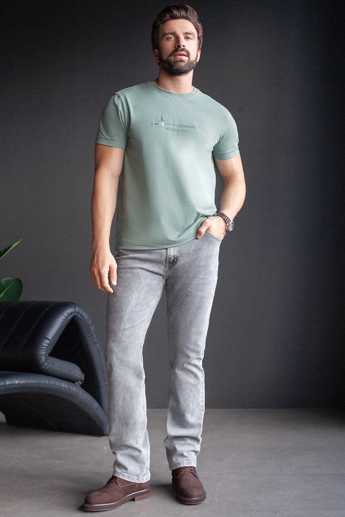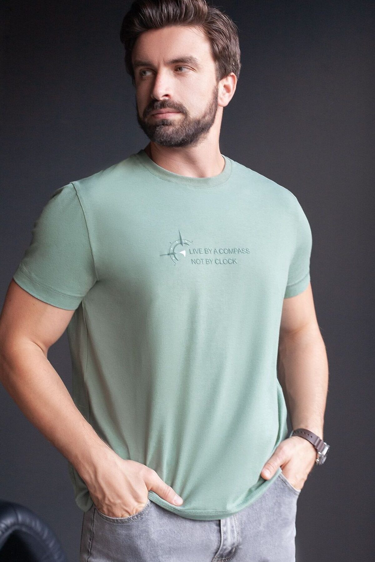 Базовая футболка светло-оливкового цвета из премиального хлопка с эластаном полуприлегающего кроя станет универсальным решением для любого случая. Прямой крой обеспечивает комфортную посадку на любую фигуру, включая большие размеры, подходит как на низкий, так и на высокий рост. Выполненная из натуральной ткани, она обладает дышащими свойствами, а за счет эластичности сохраняет форму даже после длительного ношения и многочисленных сирок. Однотонная футболка выполнена в минималистичном стиле, дополнена принтом в виде изображения компаса и надписи. Перевод надписи: Live by a compas not by clock - Жить по компасу, а не по часам. На рукаве нашивка из эко-кожи с логотипом VILATTE. Подходит как классический вариант для работы в офис, так и для повседневной носки или занятий спортом. Мягкая ткань приятна к телу, не вызывает дискомфорта и идеально подходит для дома или летних прогулок благодаря короткому рукаву. Простая и практичная футболка станет базовым элементом вашего гардероба. Она легко сочетается в спортивном или классическом стиле. Стрейч-ткань поддерживает свободу движений и подчеркивает индивидуальный стиль каждого мужчины.