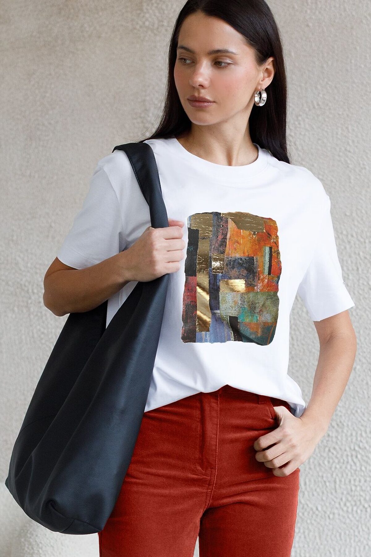 Модная футболка белого цвета привлекает внимание своим интересным дизайном и ярким принтом. Благодаря прямому крою изделие комфортно садится на любую фигуру, в том числе на большие размеры, и не сковывает движений. Круглый вырез подчеркивает современный стиль, а натуральный материал из хлопка с добавлением эластана обеспечивает удобство в повседневной носке и приятные тактильные ощущения. Прочность и износостойкая структура позволяют сохранять свежий внешний вид после множества стирок. Принт в виде яркой абстракции нанесен красками с устойчивым покрытием. Стильная футболка гармонично вписывается в любой гардероб и подойдет для прогулок, отдыха или неформальных встреч. Благодаря особенностям кроя модель хорошо сидит, скрывая недостатки и подчеркивая достоинства. Яркая футболка идеально сочетается с базовыми вещами, позволяя создавать новые интересные образы каждый день.