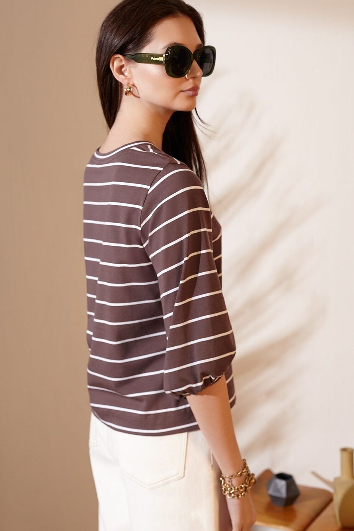 Лонгслив в полоску с рукавами-буфами из премиального хлопка с эластаном VILATTE, кофе-белый