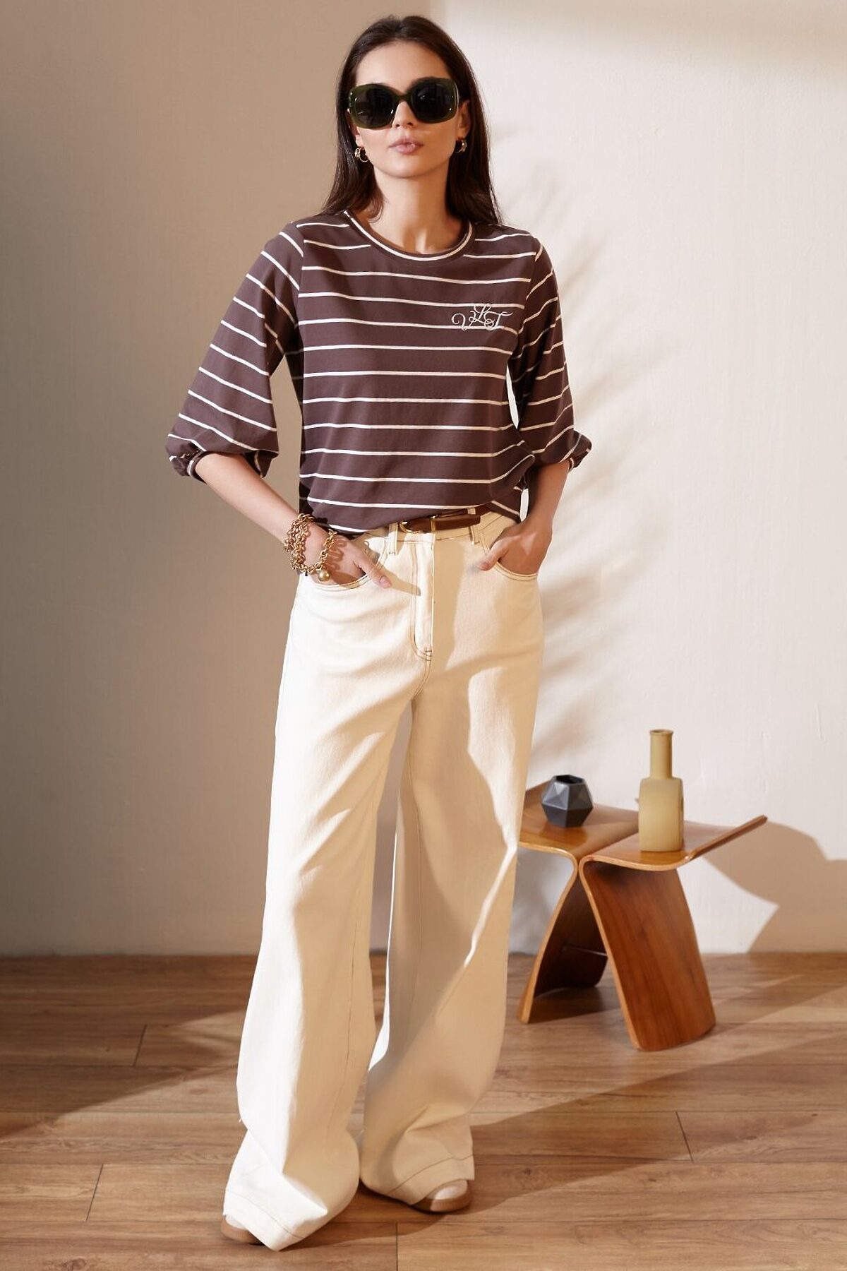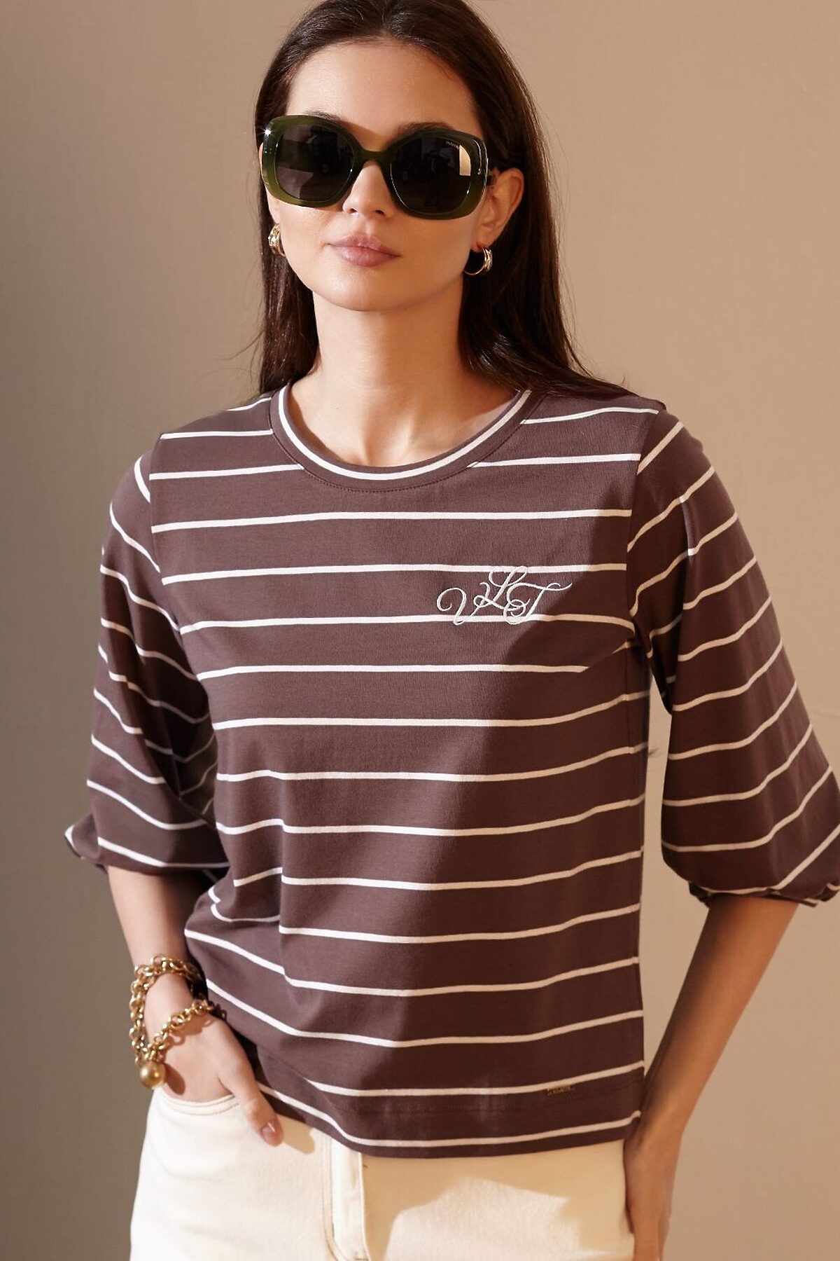 Свободный лонгслив кофейного цвета в белую полоску с рукавом средней длины выполнен из премиального хлопка с добавлением эластана, плотностью 170 Г/м2, что обеспечивает комфорт и приятные тактильные ощущения. Полоска - придает изделию легкую текстурность, аккуратная вышивка в виде букв логотипа бренда добавляет стиля и индивидуальности, а круглый ворот создает универсальный образ, который подойдет для повседневного использования. Объемные рукава буфы средней длины делают этот лонгсив женственным и изящным.Такой лонгслив идеально подходит для весеннего и летнего сезона благодаря легкой и дышащей ткани. Представленная широкая размерная линейка позволяет выбрать оптимальный вариант на любую фигуру, в том числе на плюс-сайз, обеспечивая свободу движений и удобство на каждый день. Этот комфортный лонгслив станет отличной базой в гардеробе, сочетаясь с различными стилями одежды и создавая простой, но эффектный образ.