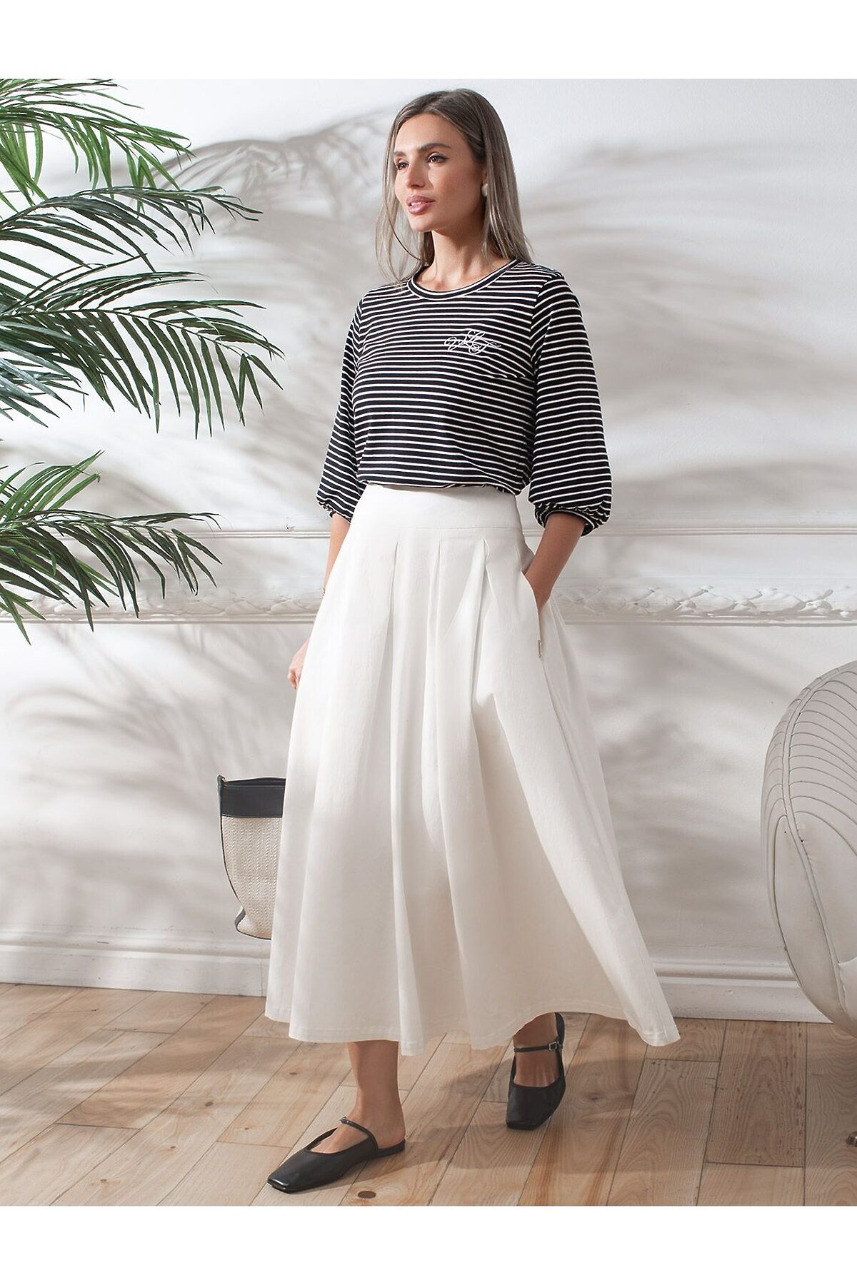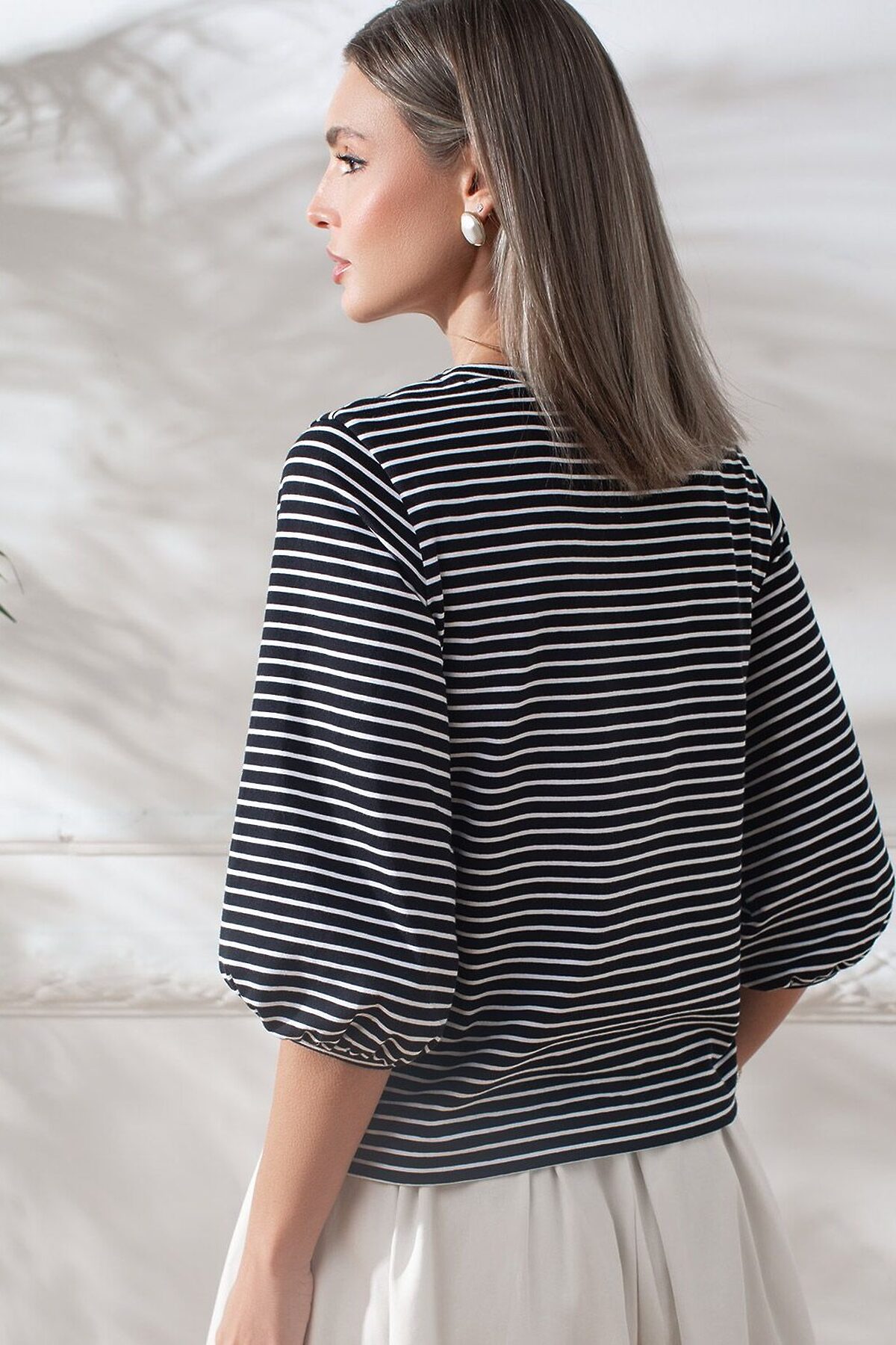 Свободный лонгслив в черно-белую полоску с рукавом средней длины выполнен из премиального хлопка с добавлением эластана, плотностью 170 Г/м2, что обеспечивает комфорт и приятные тактильные ощущения. Полоска - придает изделию легкую текстурность, аккуратная вышивка в виде букв логотипа бренда добавляет стиля и индивидуальности, а круглый ворот создает универсальный образ, который подойдет для повседневного использования. Объемные рукава буфы средней длины делают этот лонгсив женственным и изящным.Такой лонгслив идеально подходит для весеннего и летнего сезона благодаря легкой и дышащей ткани. Представленная широкая размерная линейка позволяет выбрать оптимальный вариант на любую фигуру, в том числе на плюс-сайз, обеспечивая свободу движений и удобство на каждый день. Этот комфортный лонгслив станет отличной базой в гардеробе, сочетаясь с различными стилями одежды и создавая простой, но эффектный образ.