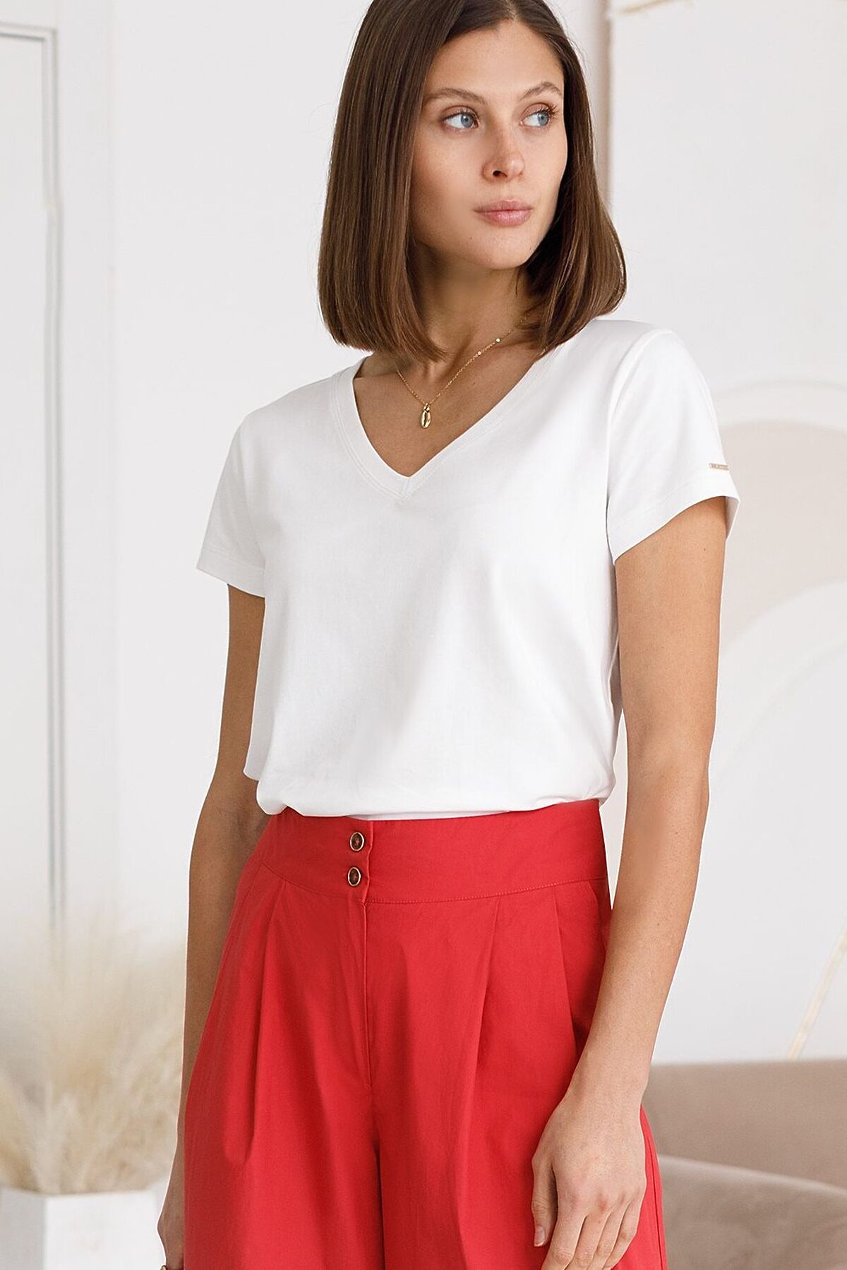 Базовая футболка белого цвета с V-образным вырезом выполнена из премиального хлопка. Добавление эластана в состав изделия способствует формоустойчивости. Футболка выполнена из качественного натурального материала, отлично сидит по фигуре и подходит для отдыха и работы. Преимущество этой модели - V-образный вырез, который подчеркивает линию шеи и придает внешнему виду элегантность. Такой фасон гармонично вписывается как в классические, так и в современные гардеробы. Декольте делает изделие более женственным и визуально вытягивает силуэт, создавая ощущение легкости. Такая футболка средней длины и классического кроя идеально подойдет под любую одежду. Модель доступна в больших размерах, чтобы каждая женщина могла подчеркнуть свою индивидуальность.