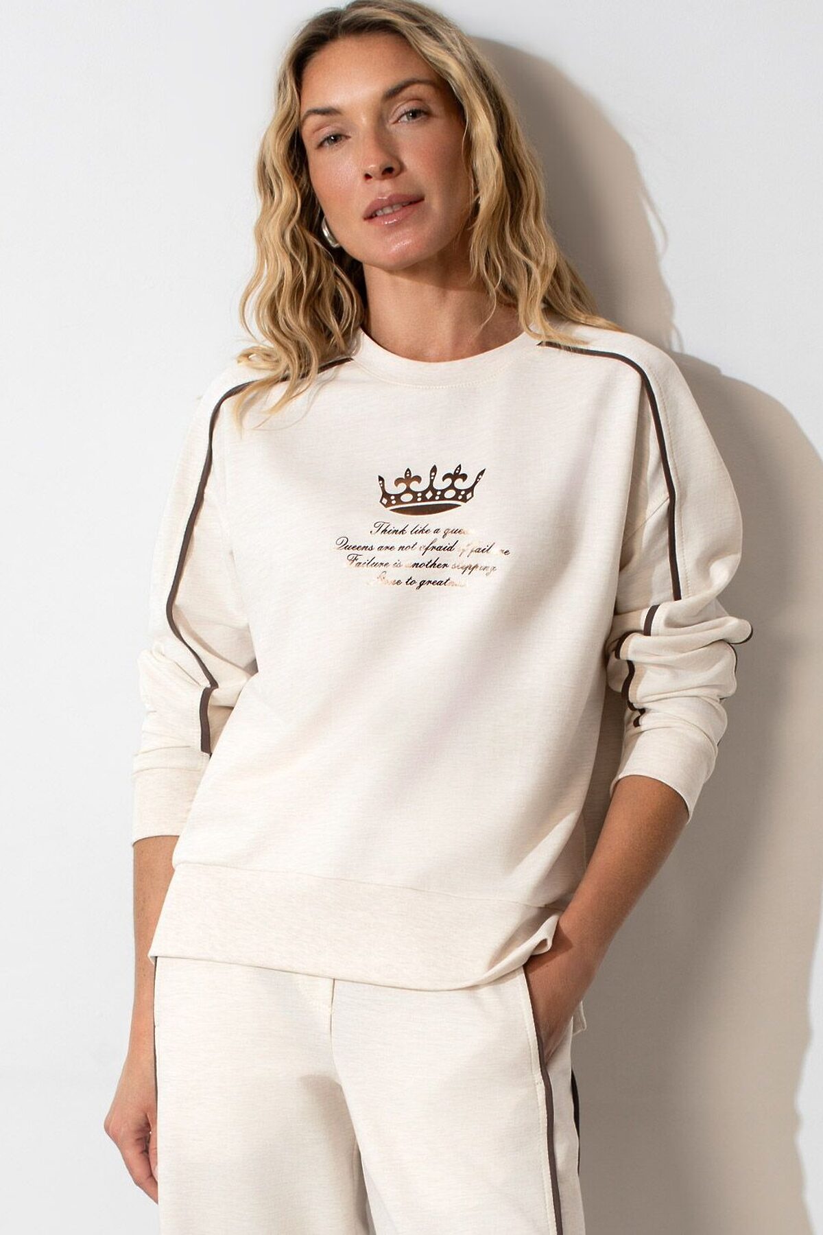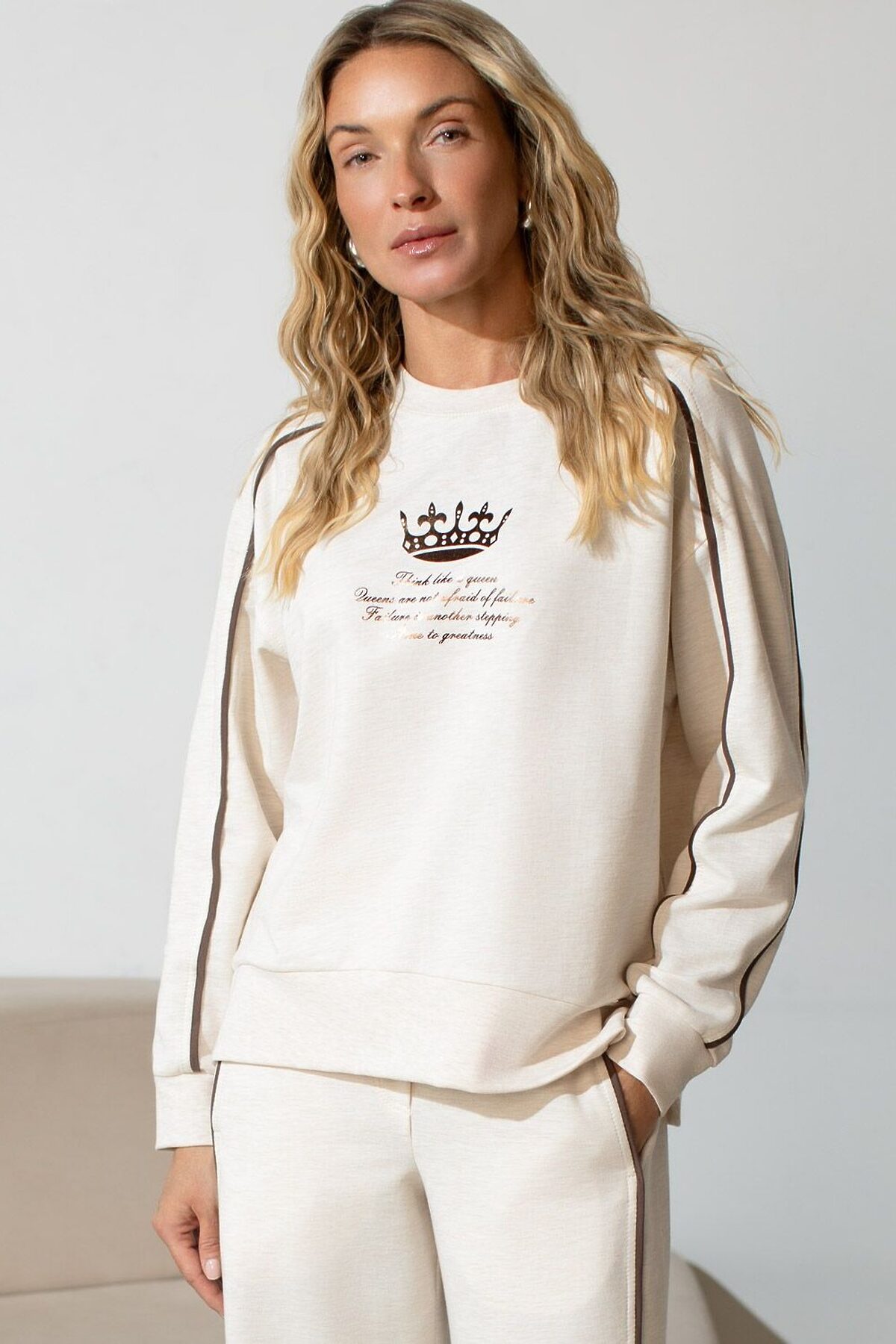 Стильный свитшот овсяного цвета с эффектом меланж из премиального футера двухнитки с эластаном сочетает в себе комфорт и оригинальность. Джемпер выполнен из натурального хлопка, который обеспечивает мягкость и дышащие свойства ткани. Нежный материал дарит ощущение уюта в любое время года, а премиальное качество изготовления гарантирует долговечность и сохранение формы после множества стирок. Особенность изделия — спущенная линия плеча и аккуратные разрезы, которые добавляют современный акцент и делают образ более выразительным. Лампасы на рукавах добавляют наряду динамики и выделяют этот свитшот на фоне классических решений. Принт в виде надписи придает индивидуальность, позволяя выделиться без лишней вычурности. Перевод надписи:Think like queen Queens are not afraid of failure Failure is another stepping Stone to greatness - Думай как королева Королевы не боятся неудач, Неудача — это ещё один шаг К величию. Дополнен металлическим логотипом бренда. Представлена широкая размерная линейка, включая маленькие и большие размеры, что позволяет подобрать идеальный вариант для разной фигуры и роста. Этот уютный свитшот отлично подходит для повседневной носки благодаря своей комфортной посадке и мягкой текстуре. Он станет универсальным элементом гардероба, легко сочетающимся с различными стилями одежды. Свободный джемпер из футера станет отличным выбором для активного отдыха, обеспечивая стильный внешний вид и удобство в прохладное время года. Рекомендуем сочетать с артикулами: D44.164, D44.166, D49.138, D49.165