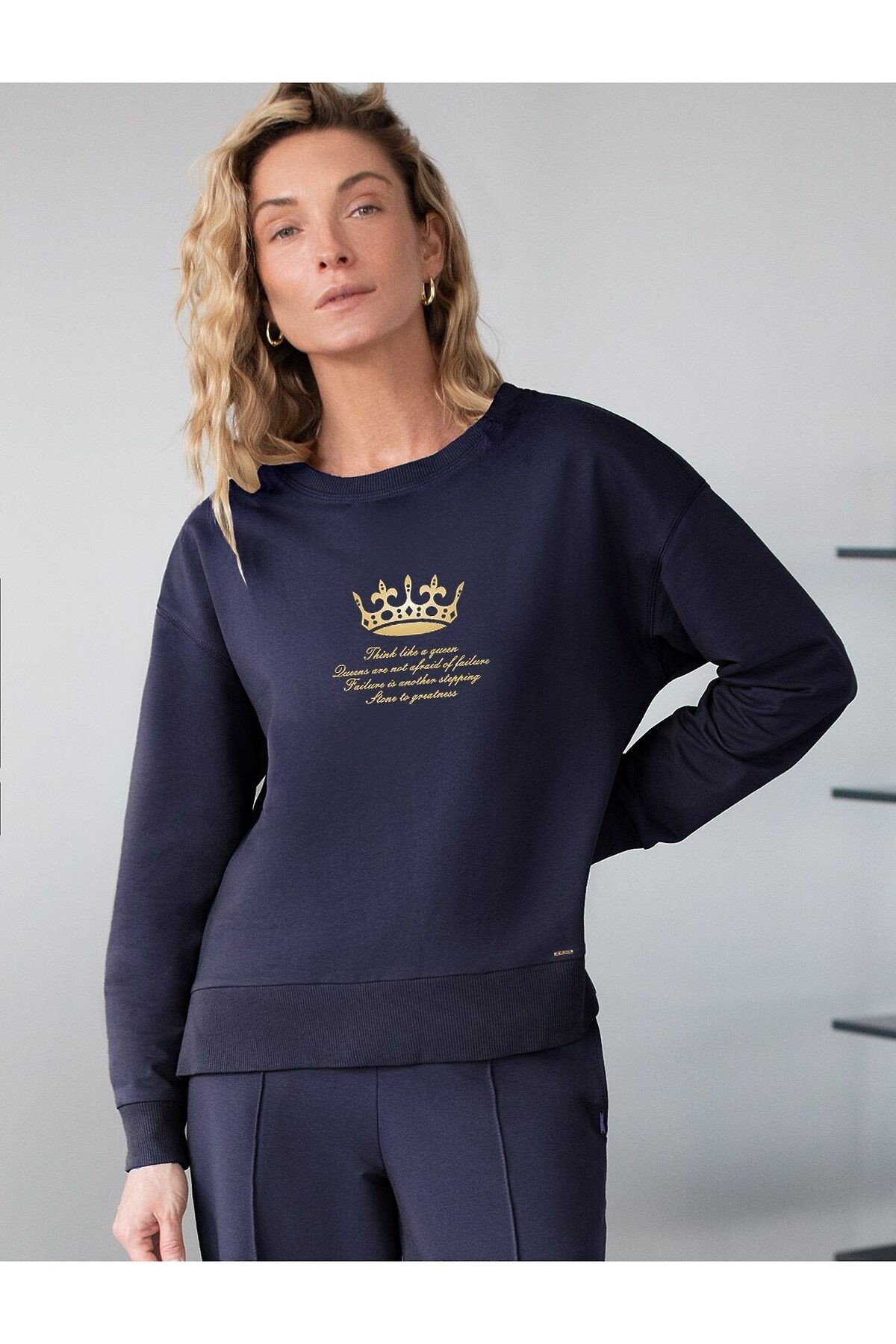 Стильный свитшот темно-синего цвета из премиального футера двухнитки с эластаном сочетает в себе комфорт и оригинальность. Джемпер выполнен из натурального хлопка, который обеспечивает мягкость и дышащие свойства ткани. Нежный материал дарит ощущение уюта в любое время года, а премиальное качество изготовления гарантирует долговечность и сохранение формы после множества стирок. Особенность изделия — спущенная линия плеча и аккуратные разрезы, которые добавляют современный акцент и делают образ более выразительным. Принт в виде надписи придает индивидуальность, позволяя выделиться без лишней вычурности. Перевод надписиThink like queen Queens are not afraid of failure Failure is another stepping Stone to greatness - Думай как королева Королевы не боятся неудач Неудача — это ещё один шаг К величию. Дополнен металлическим логотипом бренда. Представлена широкая размерная линейка, включая маленькие и большие размеры, что позволяет подобрать идеальный вариант для разной фигуры и роста. Этот уютный свитшот отлично подходит для повседневной носки благодаря своей комфортной посадке и мягкой текстуре. Он станет универсальным элементом гардероба, легко сочетающимся с различными стилями одежды. Свободный джемпер из футера станет отличным выбором для активного отдыха, обеспечивая стильный внешний вид и удобство весной, летом или в прохладную погоду. Рекомендуем сочетать с артикулами: D44.166, D44.135
