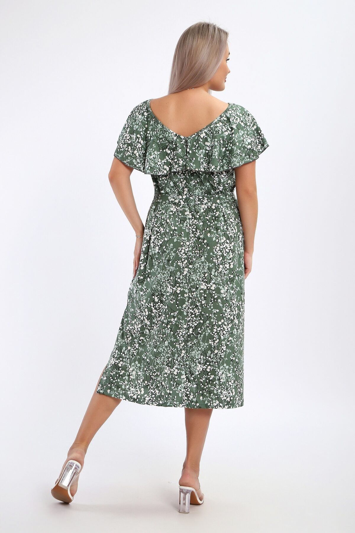 Платье-сарафан женское выполнено из кулирки 100% хлопок. Изделие средней длины, по бокам разрезы, с глубоким вырезом горловины в области спины, украшенным красивым воланом. Горловина и проймы обработаны узким кантом. Платье дополнено поясом, который изящно подчеркивает талию. Сарафан идеально подходит для романтичных образов, в нем будет комфортно на отдыхе и прогулках.