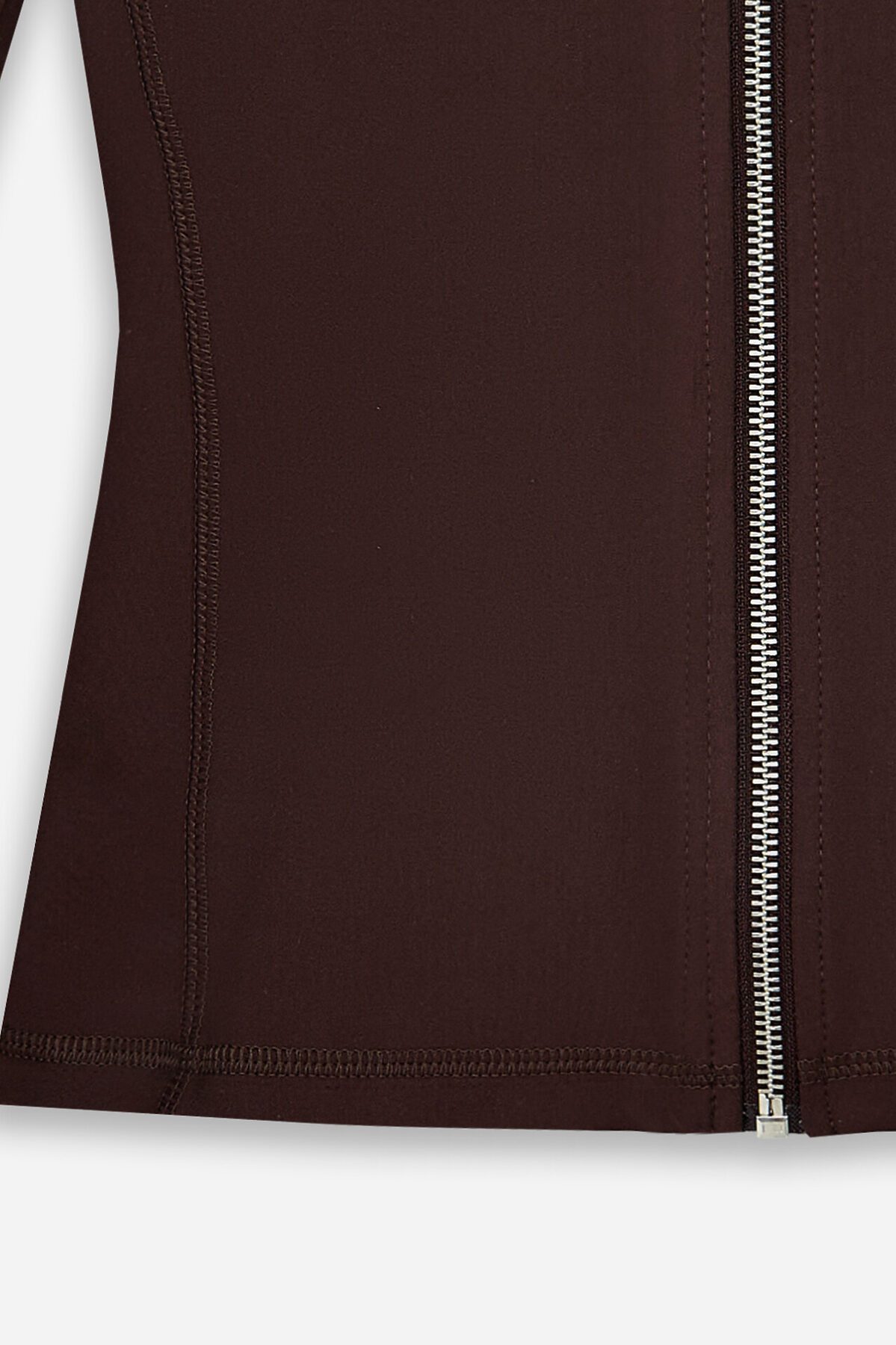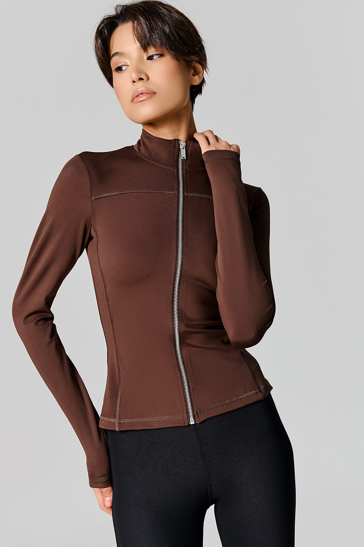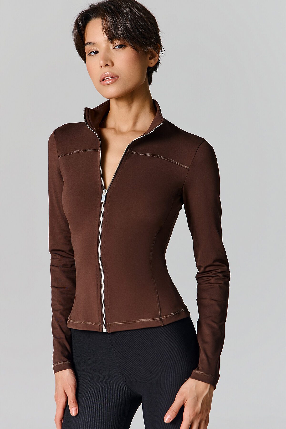 Жакет изготовлен из трикотажного полотна интерлок Жакет прилегающего силуэта, укороченный. Горловина округлой формы с воротником стойкой. Рукава втачные длинные. Жакет с отрезными бочками. По переду фигурная кокетка. По спинке фигурные рельефы.Центральная застежка на железную молнию (OpenEnd, StandartMetal №8 (7.6мм), слайдер Auto-Lock. Нижний срез жакета и рукавов обработан швом вподгибку.