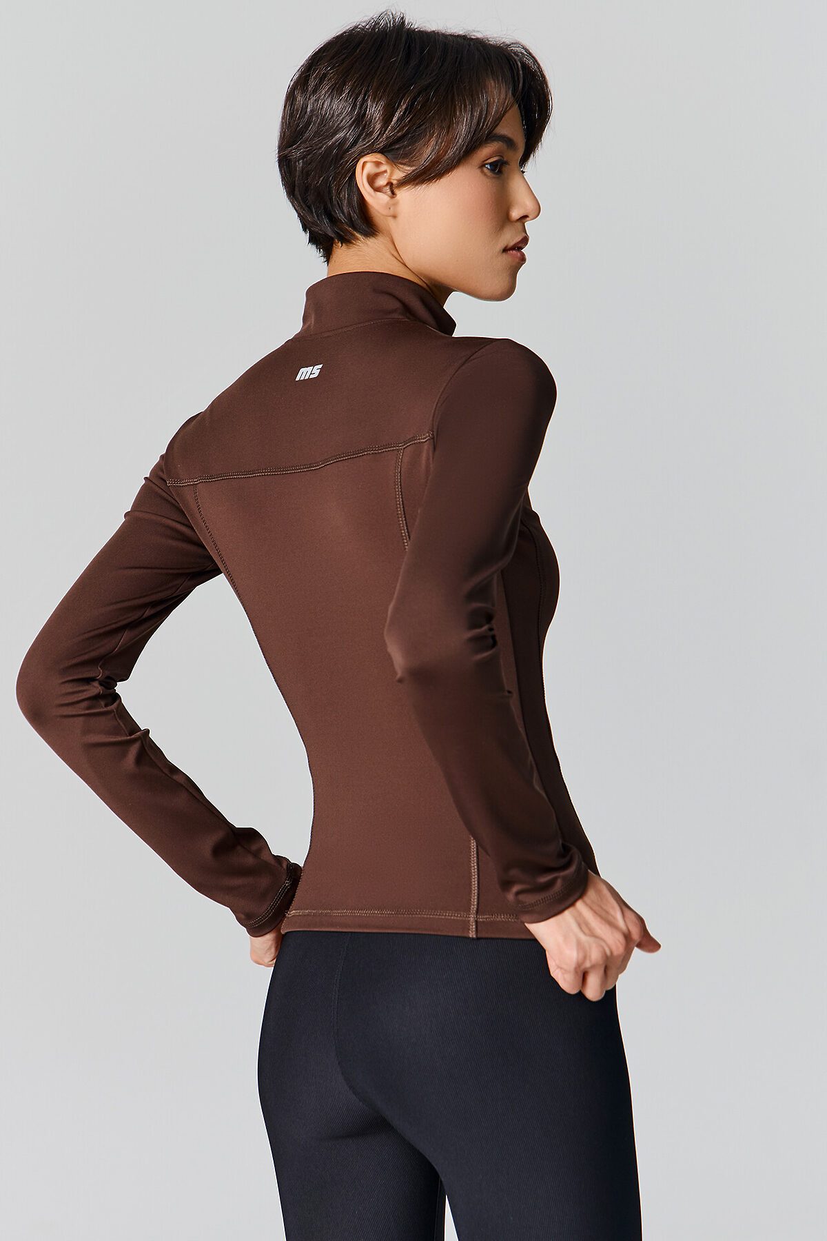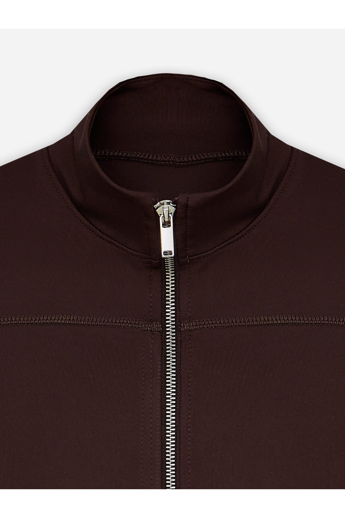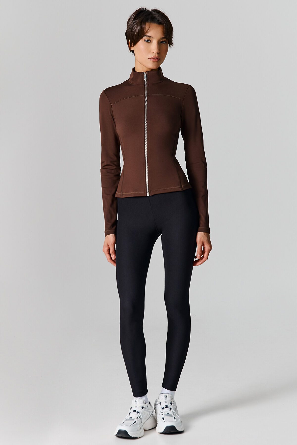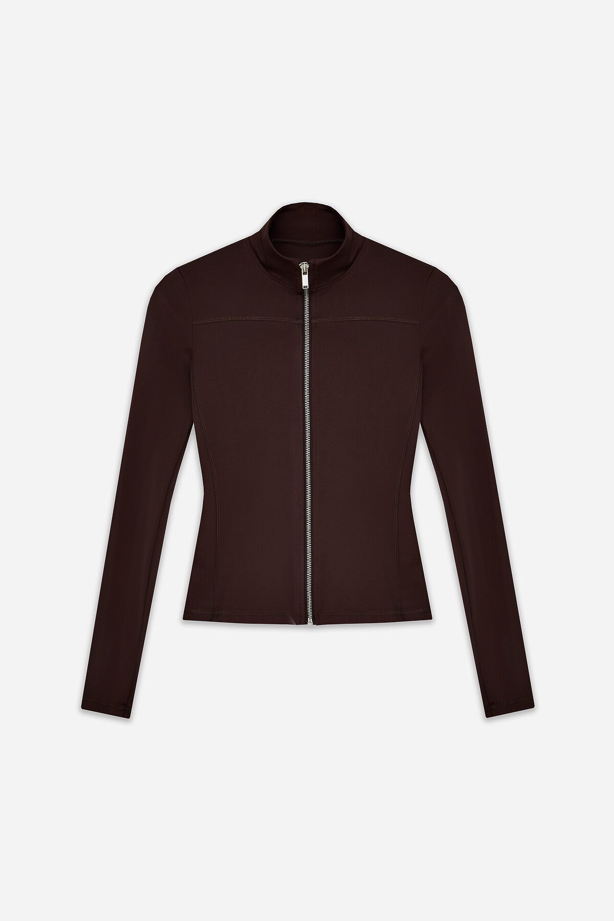 Жакет изготовлен из трикотажного полотна интерлок Жакет прилегающего силуэта, укороченный. Горловина округлой формы с воротником стойкой. Рукава втачные длинные. Жакет с отрезными бочками. По переду фигурная кокетка. По спинке фигурные рельефы.Центральная застежка на железную молнию (OpenEnd, StandartMetal №8 (7.6мм), слайдер Auto-Lock. Нижний срез жакета и рукавов обработан швом вподгибку.