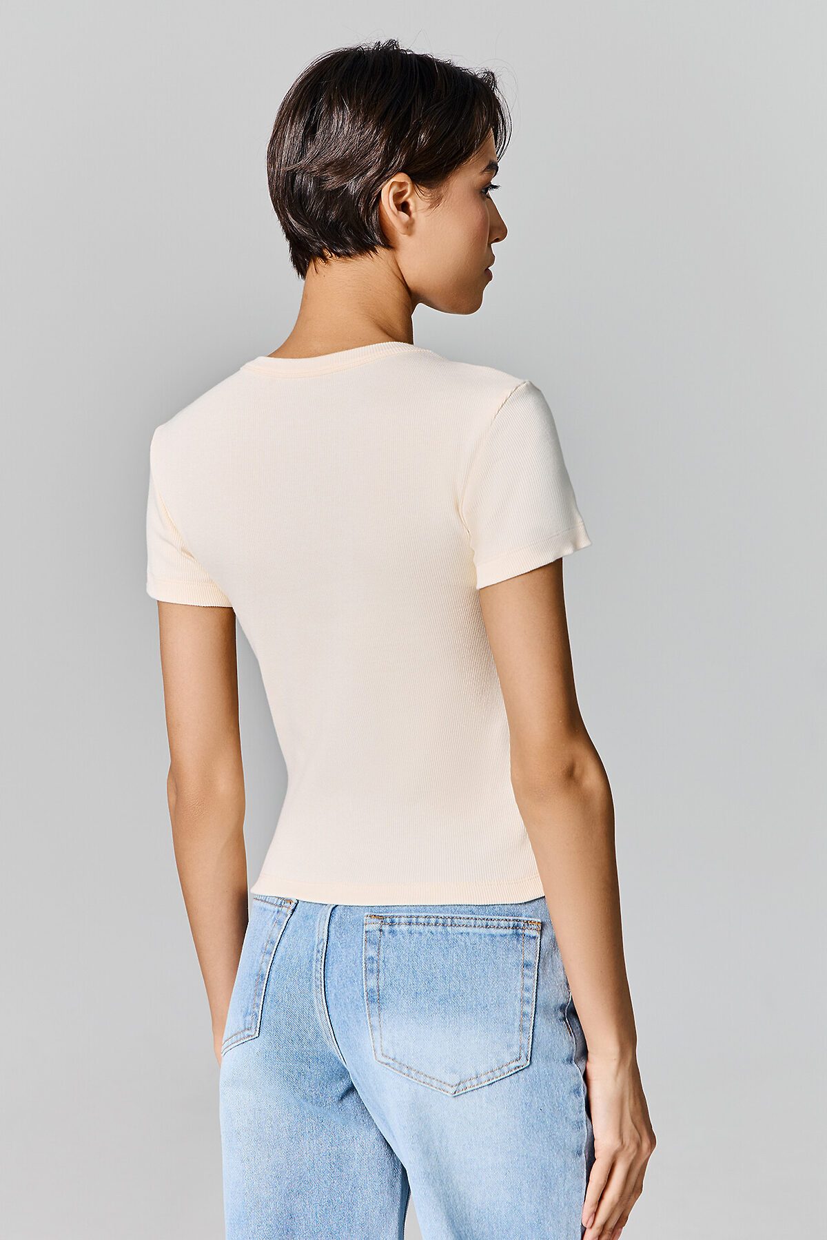 Женская футболка в рубчик — идеальный выбор для тех, кто ценит стиль и комфорт. Модель прилегающего силуэта подчёркивает фигуру, а круглая горловина и короткие рукава обеспечивают классический и удобный крой. Изделие выполнено из эластичной хлопковой рибаны, что придаёт футболке мягкость, отличную воздухопроницаемость и долговечность. Этот материал хорошо сохраняет форму и цвет. Благодаря эластичности, модель удобно облегает тело, не сковывая движений. Такая футболка станет отличным дополнением вашего гардероба, подходящим как для повседневной носки, так и для создания стильных образов на различные случаи.