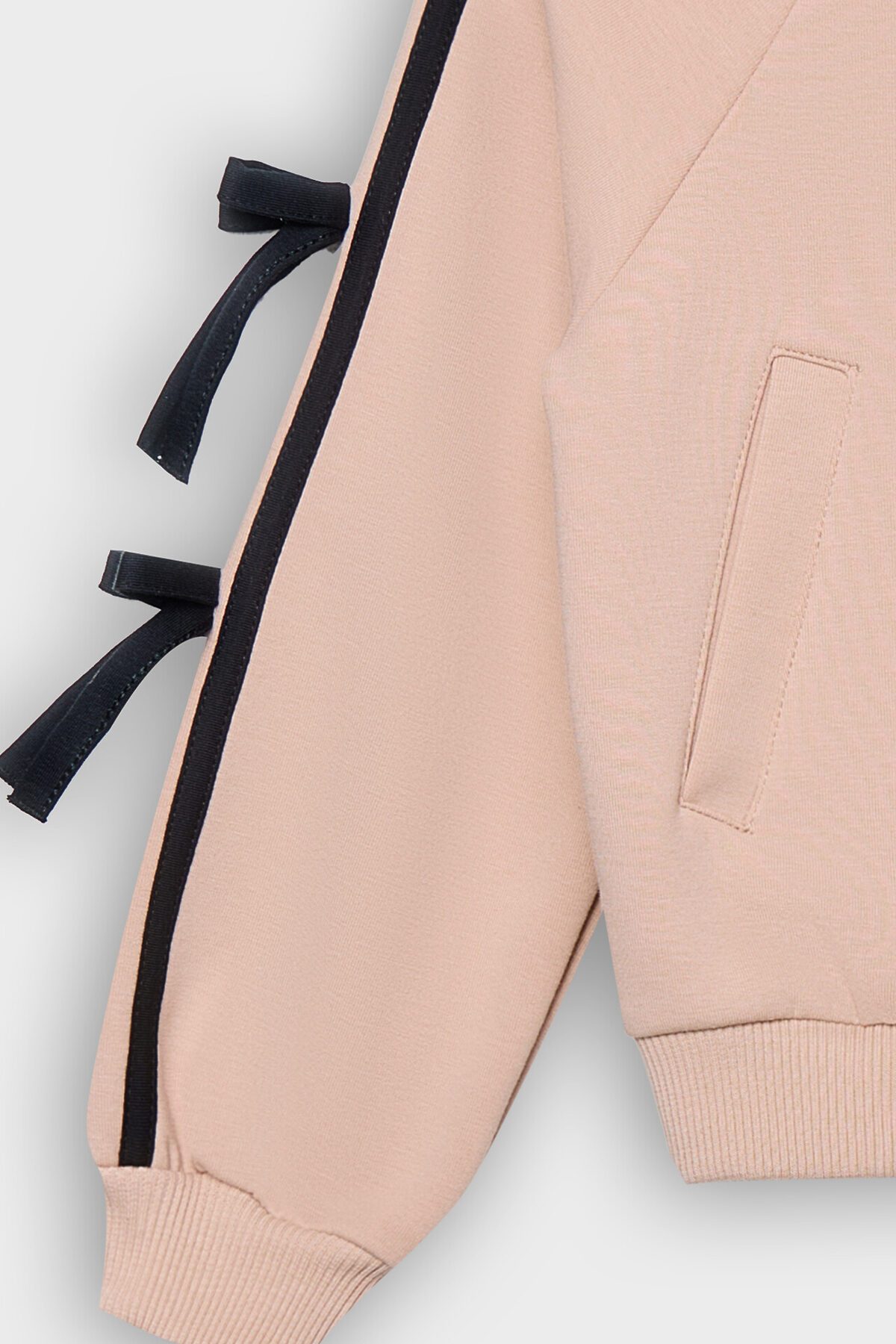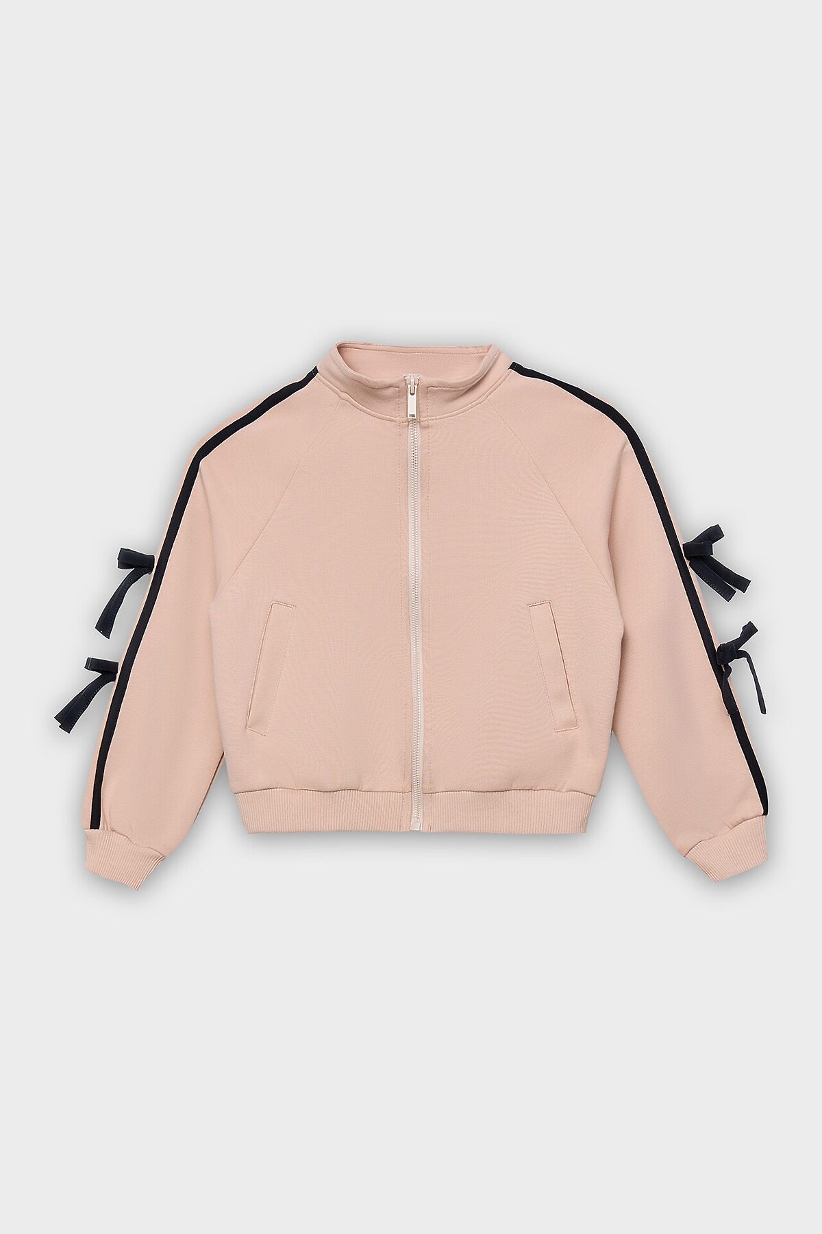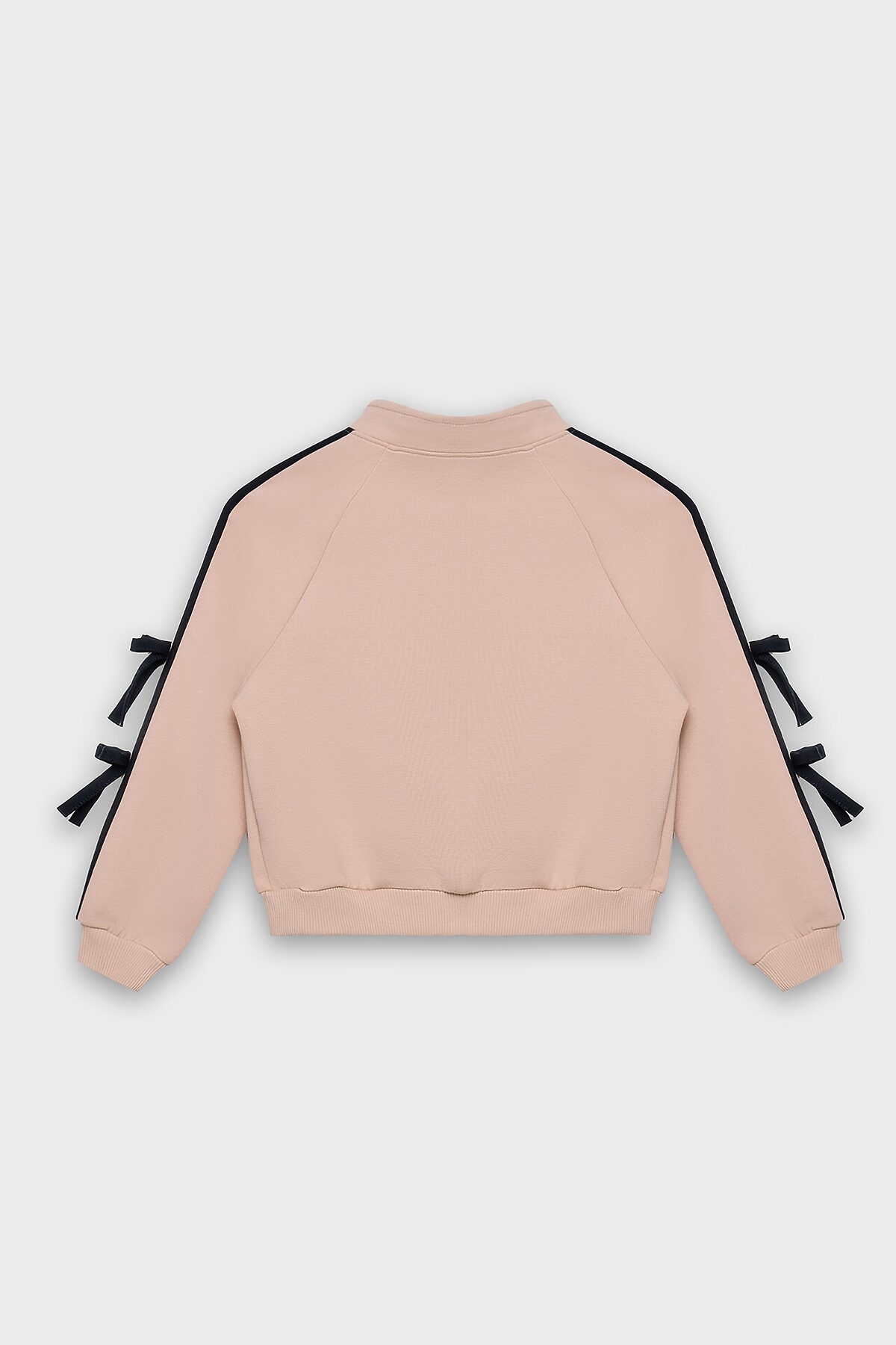 Толстовка свободного силуэта. В горловину втачен воротник-стойка. Рукава- реглан. По низу рукава манжеты из рибаны На рукавах настрочены лампасы и бантики из кулирного полотна. По переду застежка на молнию. На деталях переда прорезные карманы. По низу изделия отрезной пояс из рибаны.