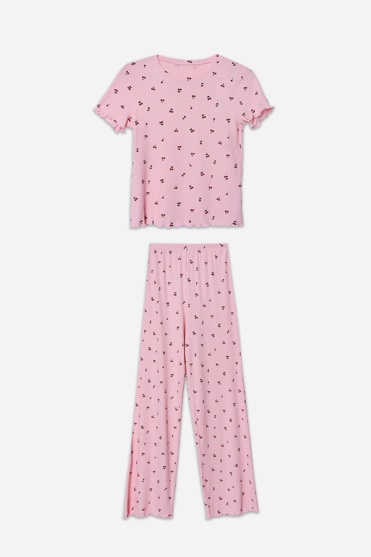 Джемпер полуприлегающего силуэта с круглой горловиной и короткими рукавами создаёт аккуратную, комфортную посадку. Прямые брюки свободного кроя со средней посадкой и мягким поясом на резинке обеспечивают ощущение лёгкости и полного расслабления. Все края изделий аккуратно обработаны для долговечности и опрятного вида.
