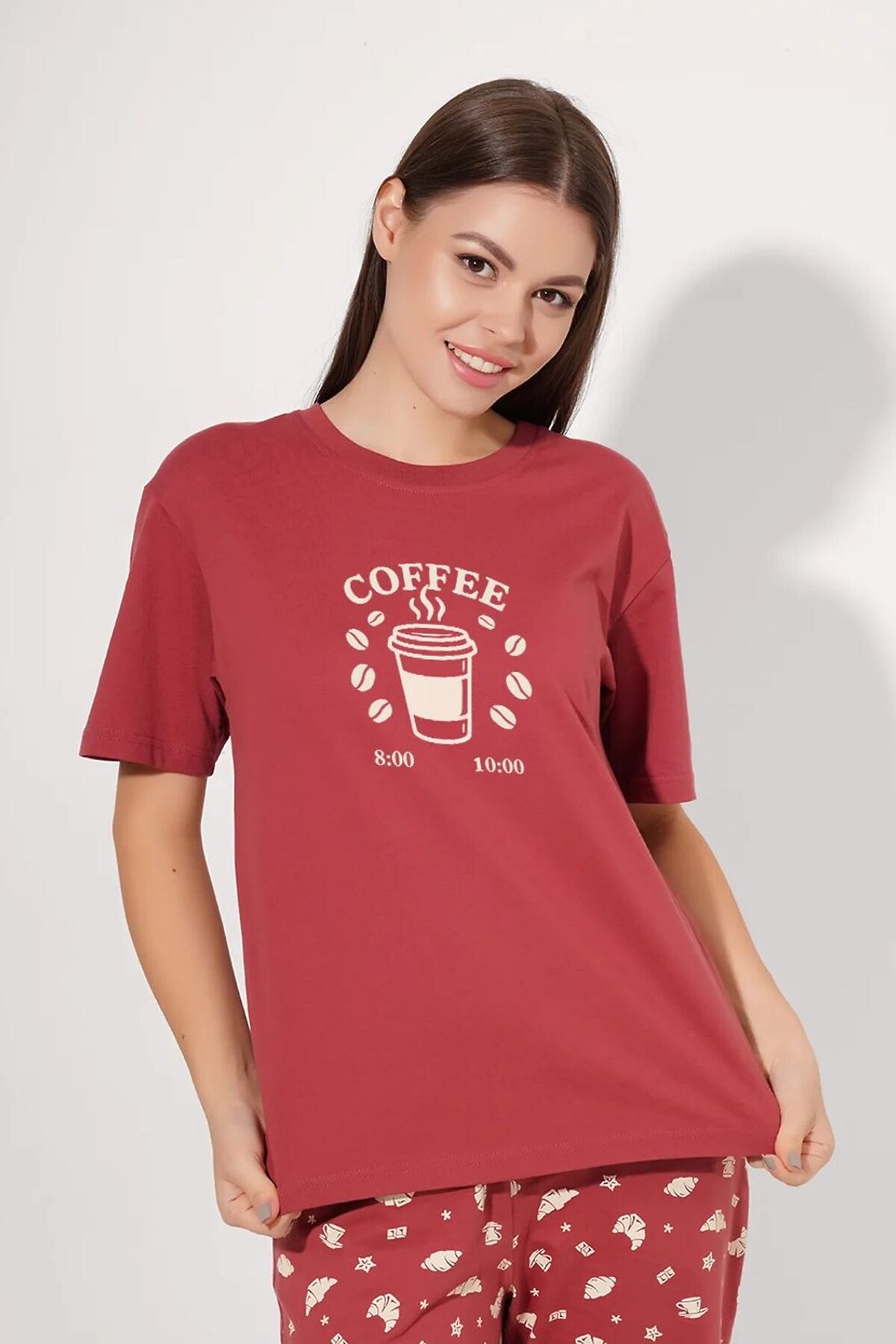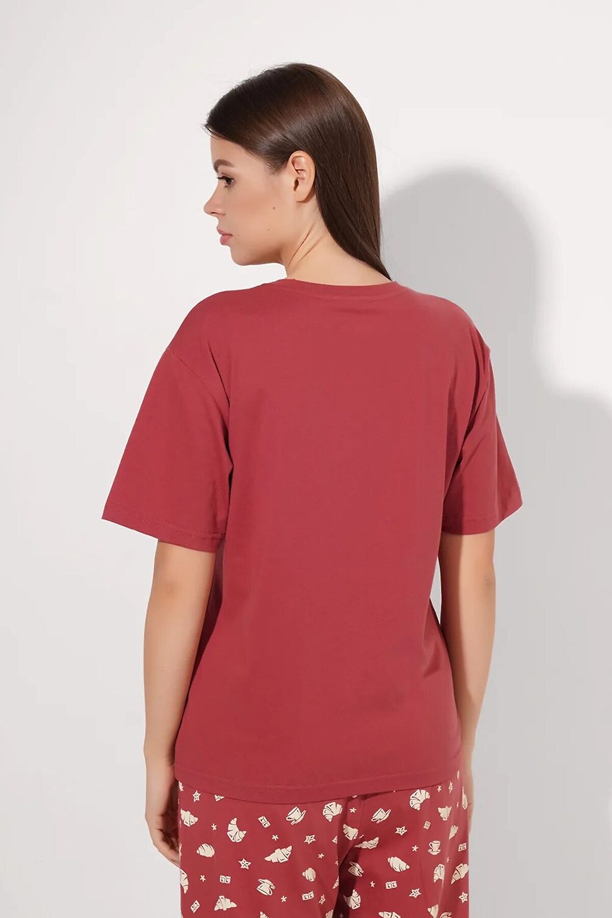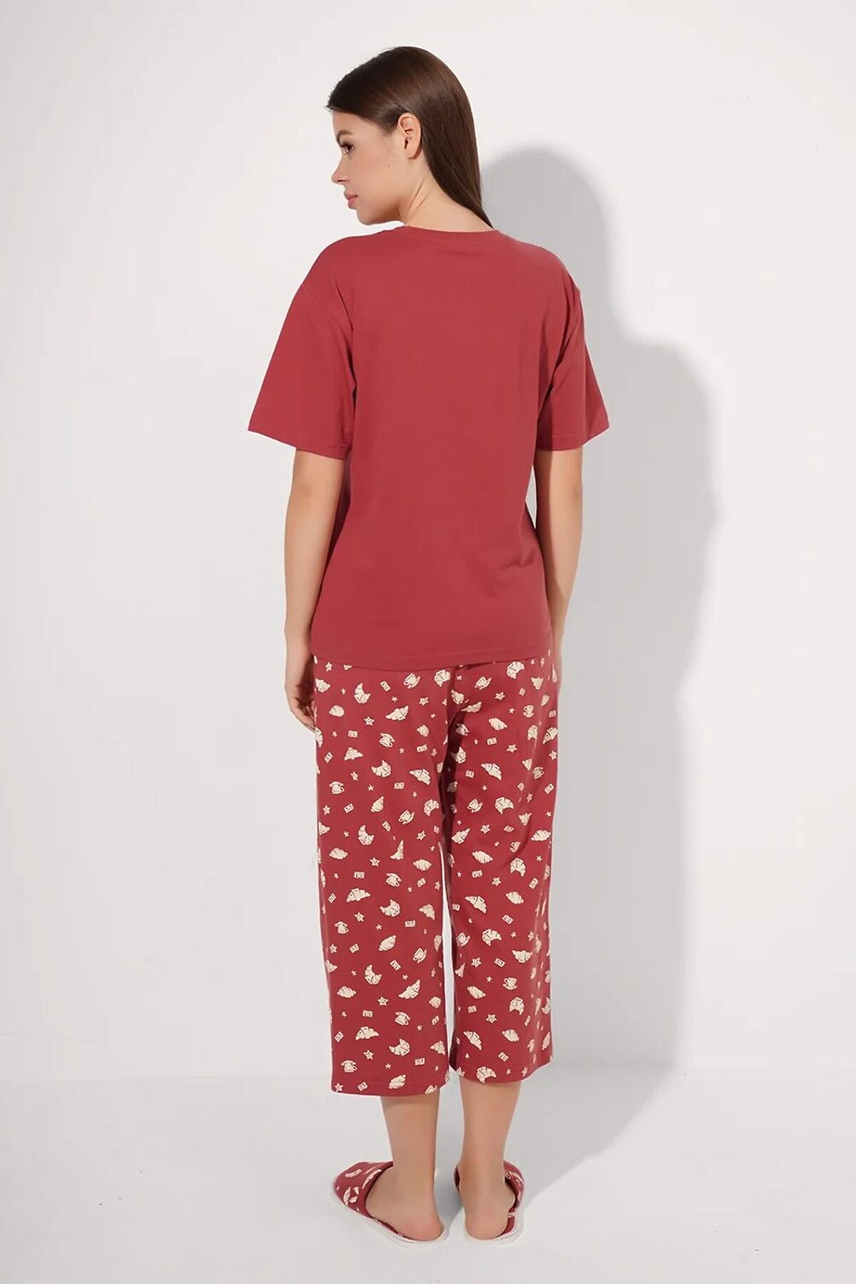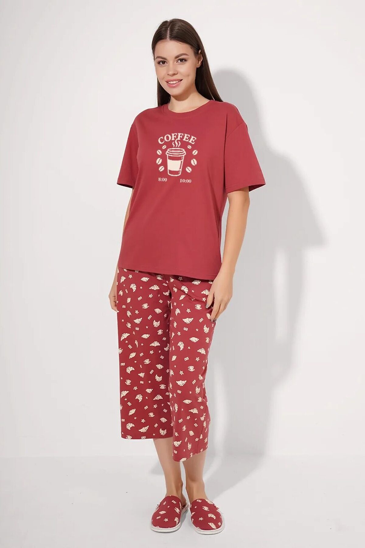 Набор одежды для дома и отдыха из хлопкового трикотажного полотна. Футболка прямого кроя. Короткий втачной рукав. Округлая горловина с обтачкой. Спереди принт. Бриджи с поясом на внутренней резинке, спереди нашивка. Боковые карманы с отрезным бочком.