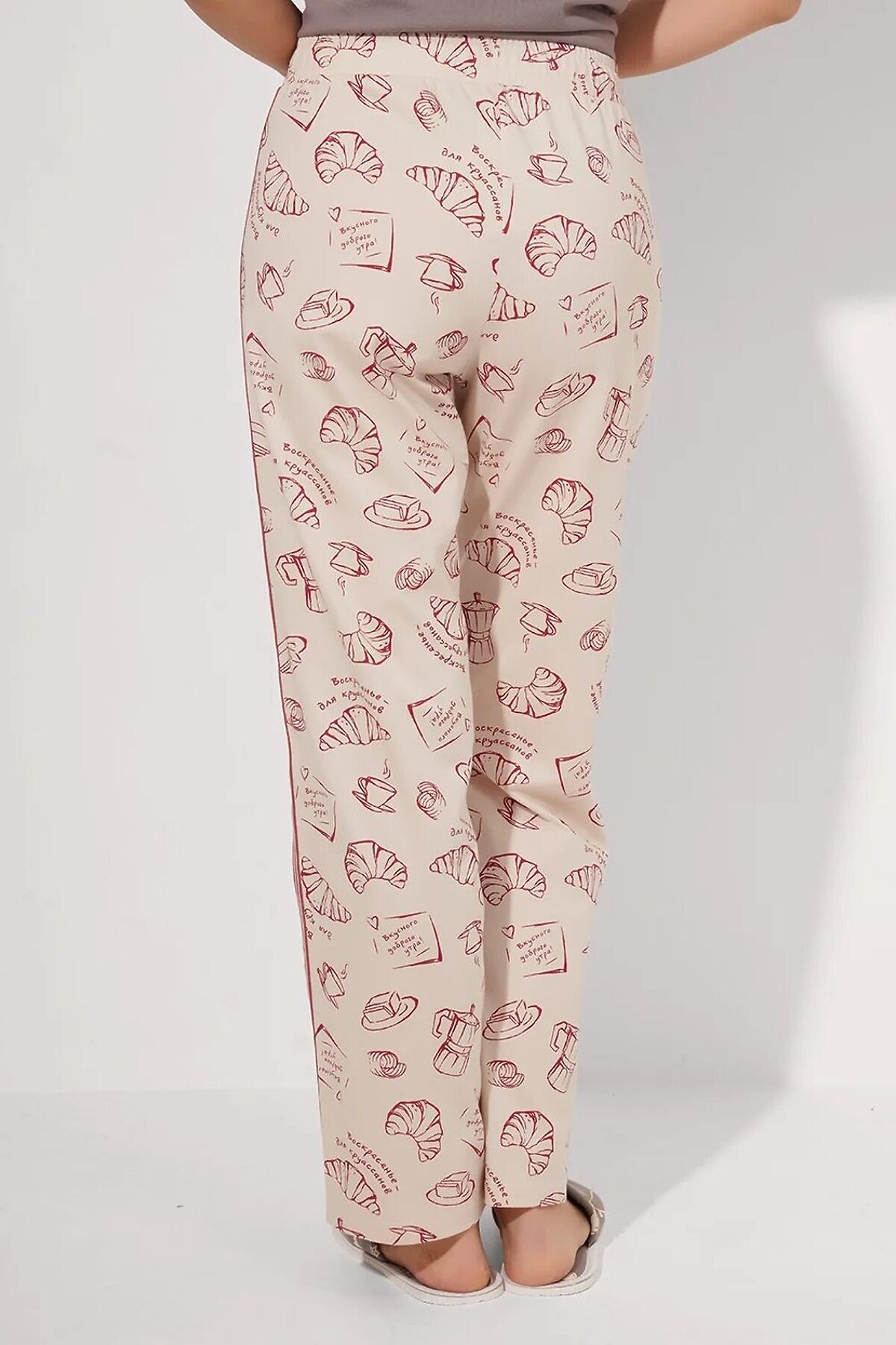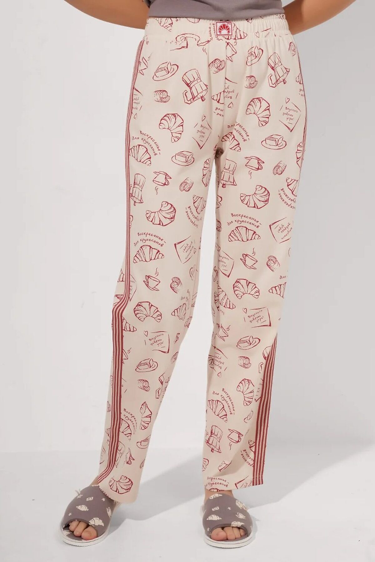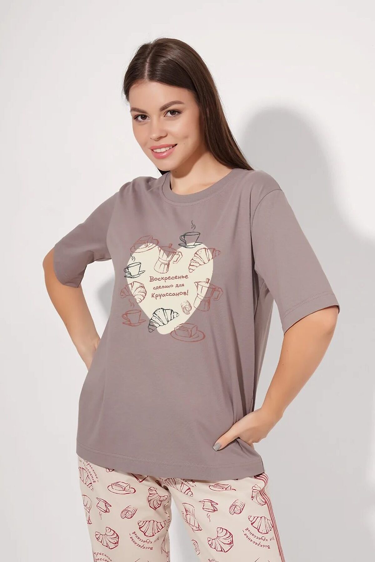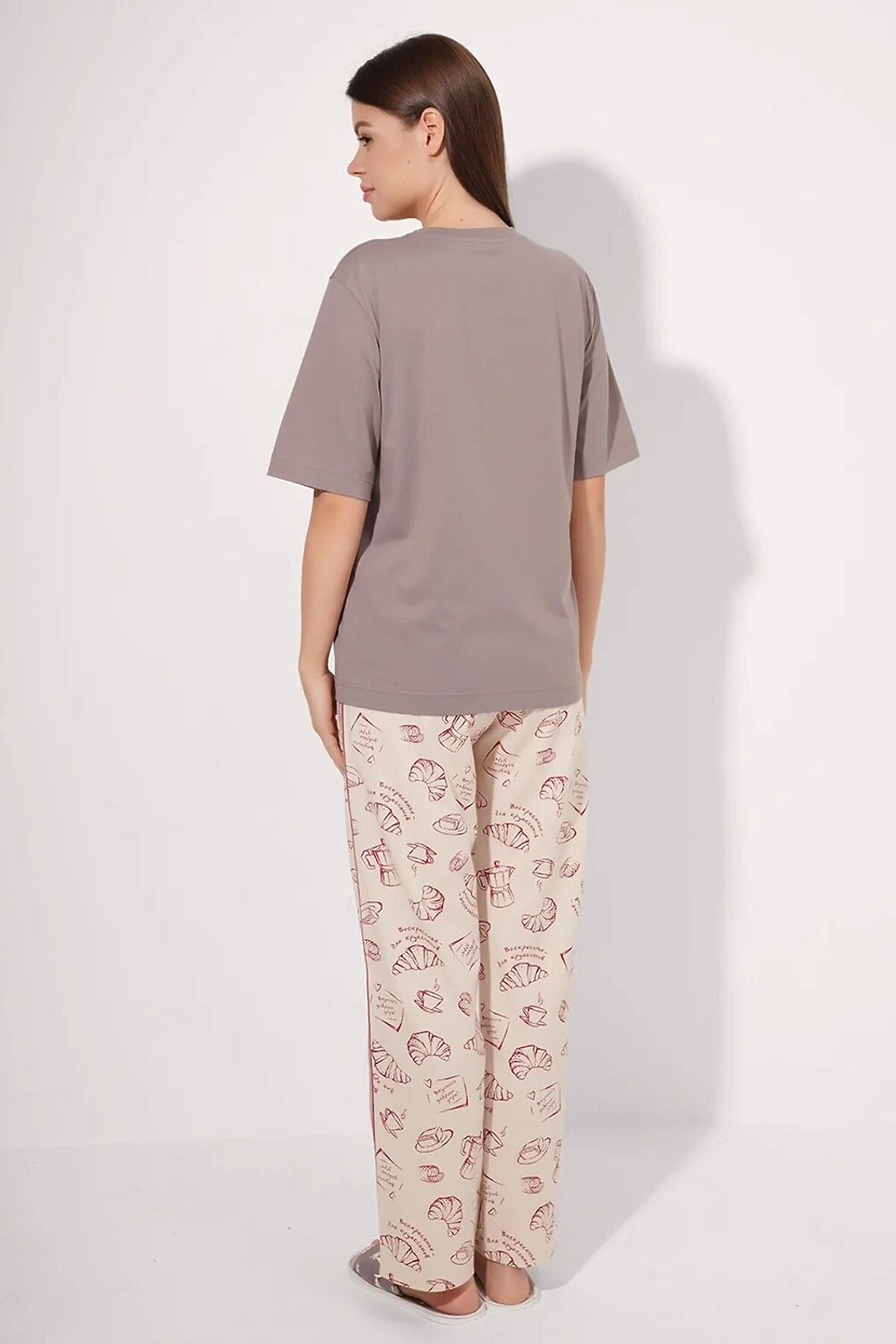 Набор одежды для дома и отдыха из хлопкового трикотажного полотна. Футболка прямого кроя. Короткий втачной рукав. Округлая горловина с обтачкой. Спереди принт. Брюки с поясом на внутренней резинке, по боковому шву -лампас из тесьмы, спереди нашивка.