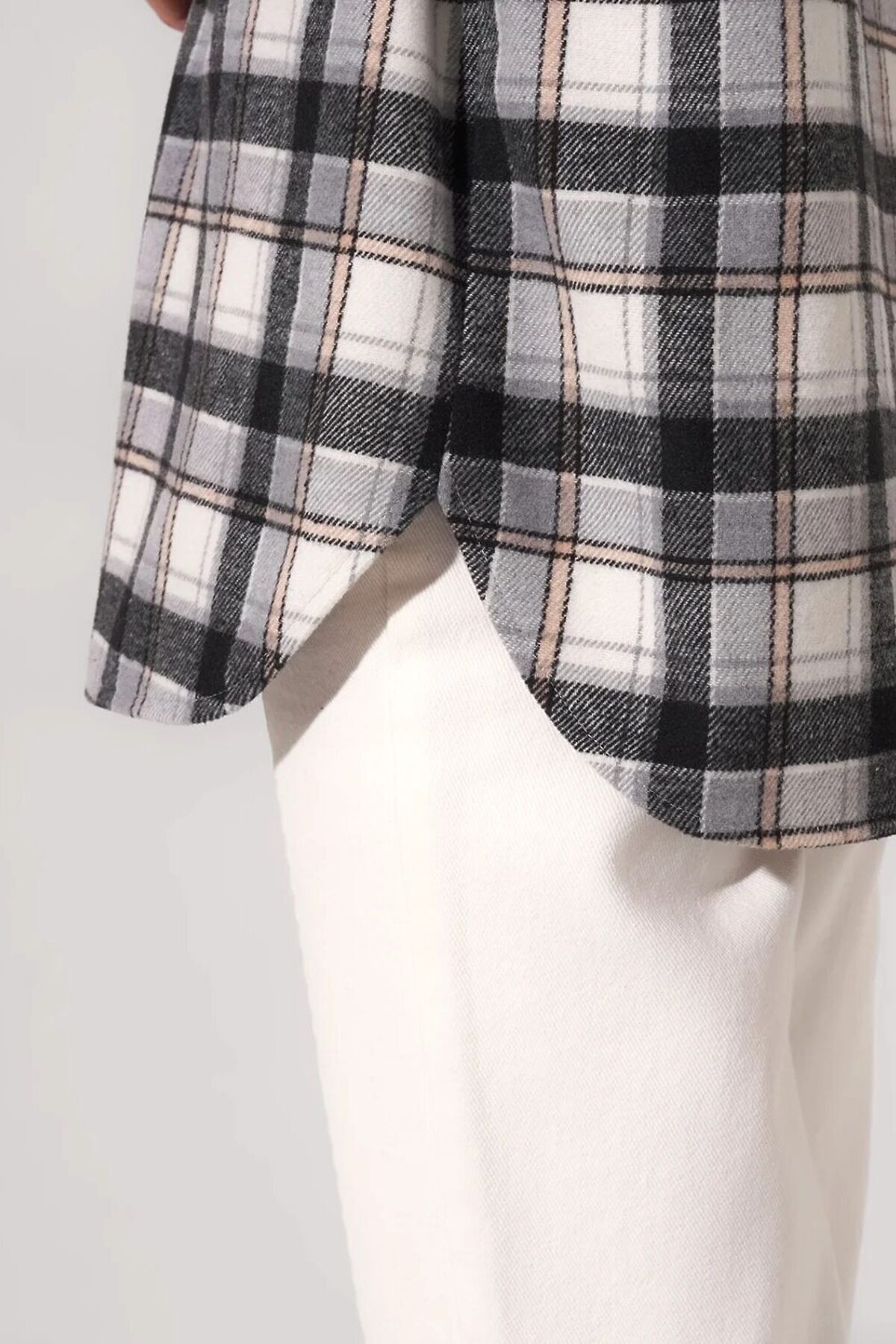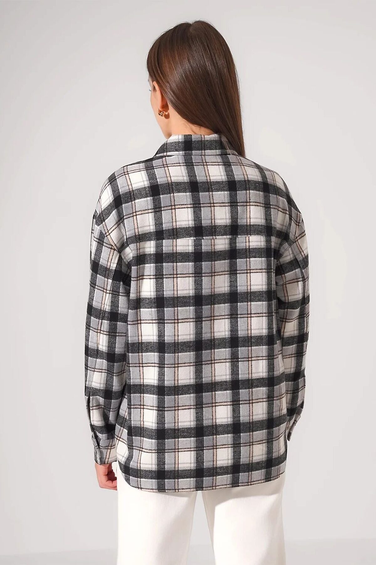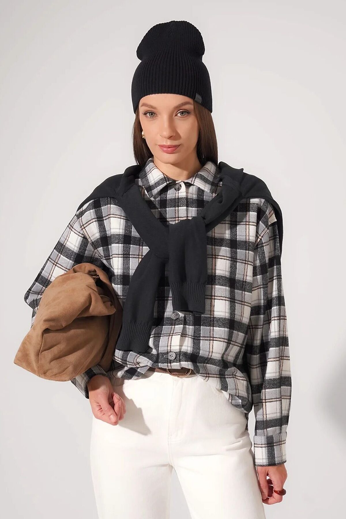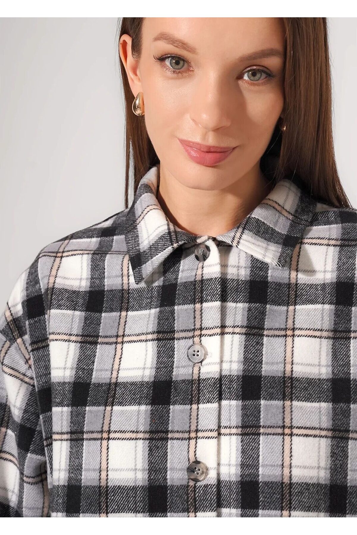 Блузка из текстильного полотна поплин, прямого силуэта на пуговицах с отложным воротником. По борту планка с пуговицами, по спинке кокетка. Длинный рукав со спущенной линией плеча. По низу рукава притачной манжет с пуговицей. Низ изделия фигурный.