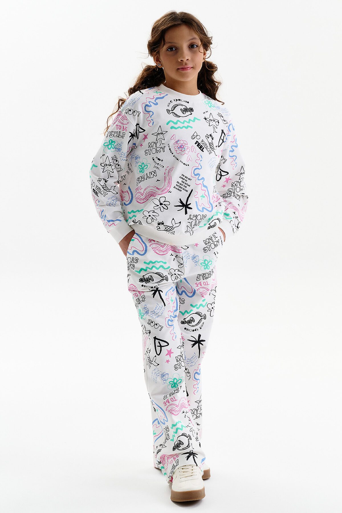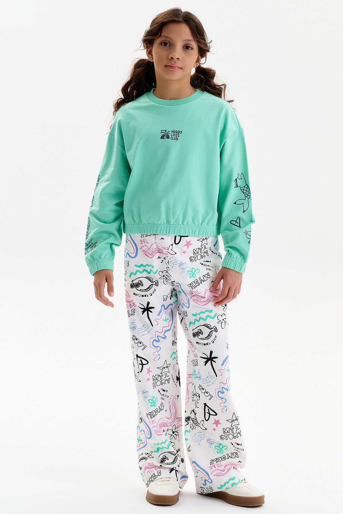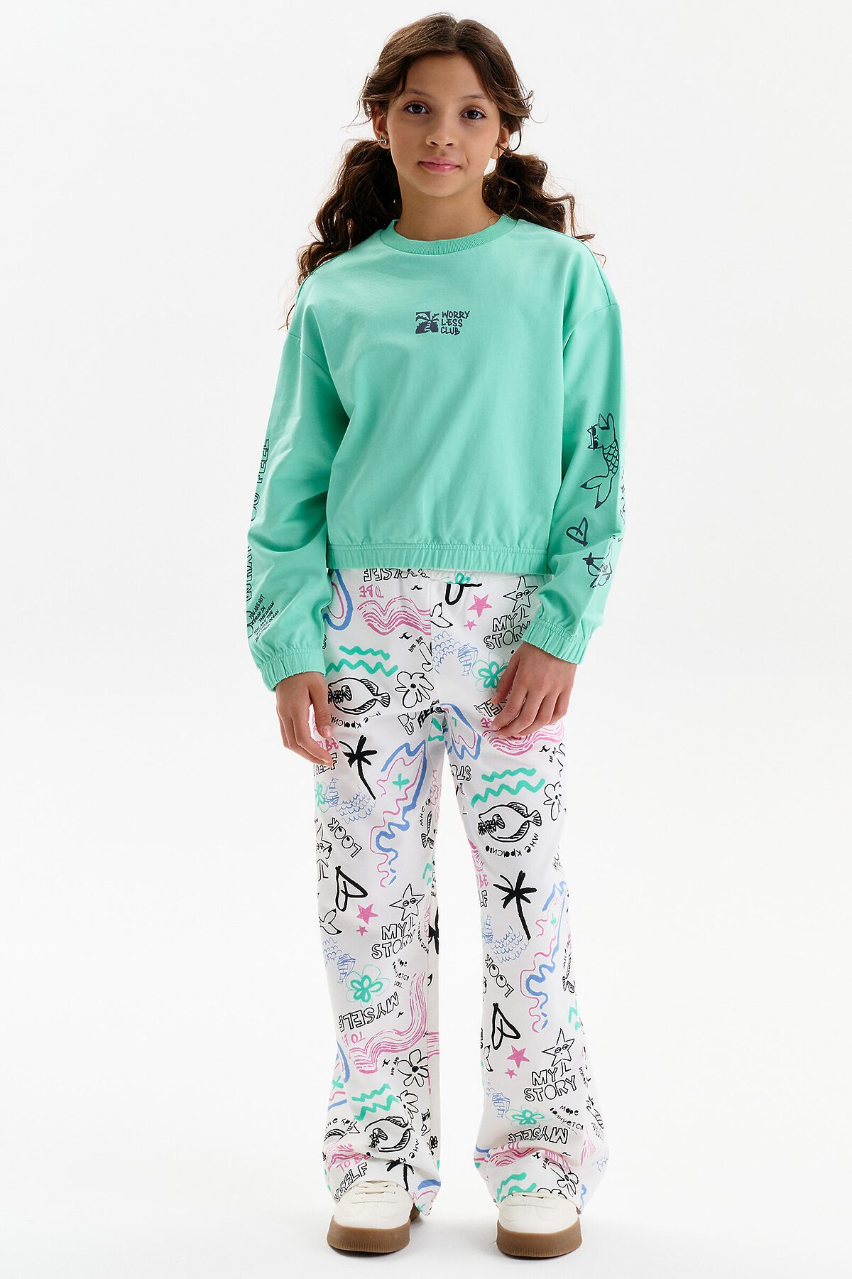 Широкие прямые брюки для девочек палаццо. Брюки выполнены из хлопкового футера, плотностью 245 гр/кв.м. Пояс на резинке, с внутренней регулировакой объема шнурком. По переду застрочены стрелки. Без карманов.
