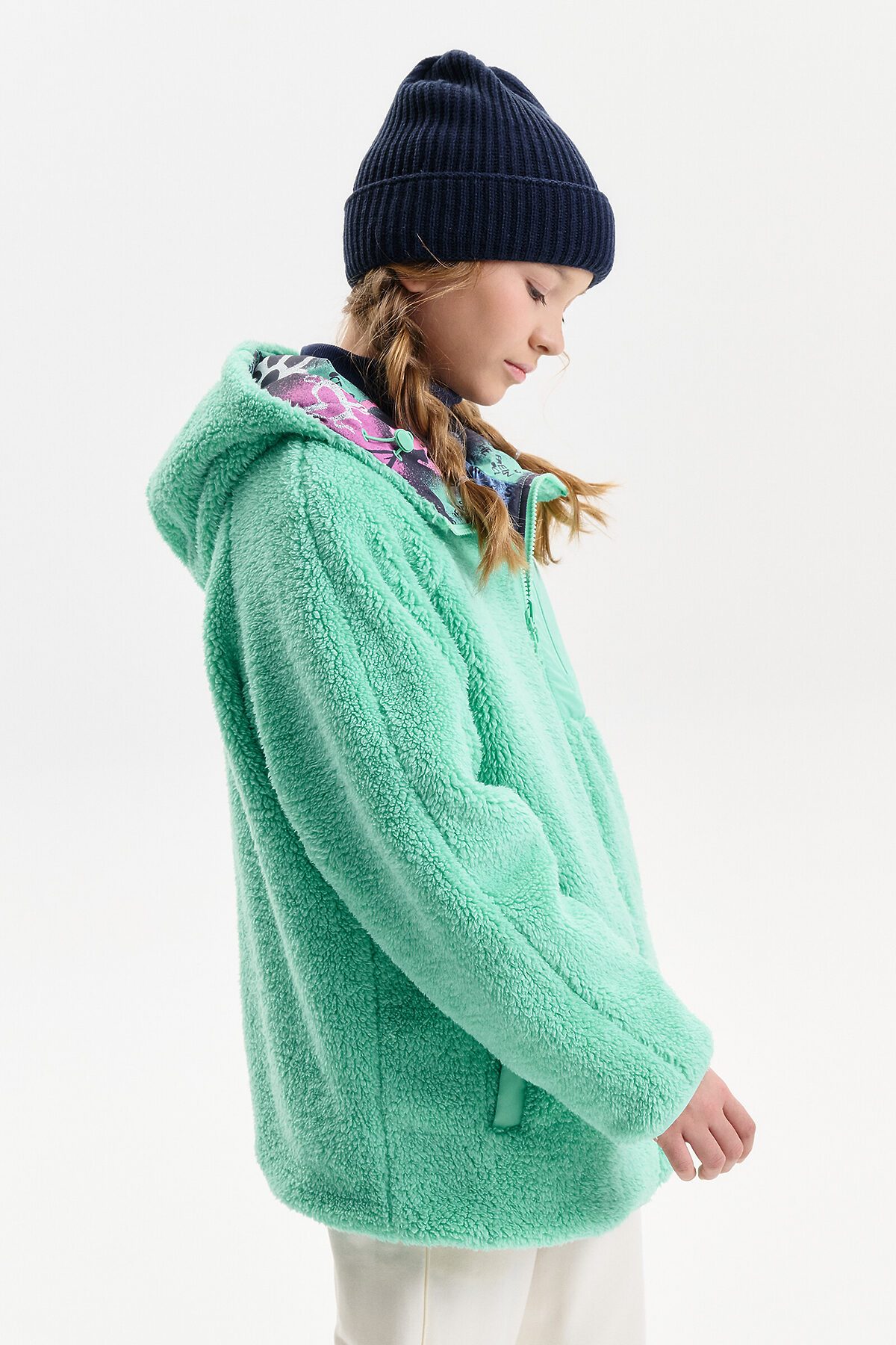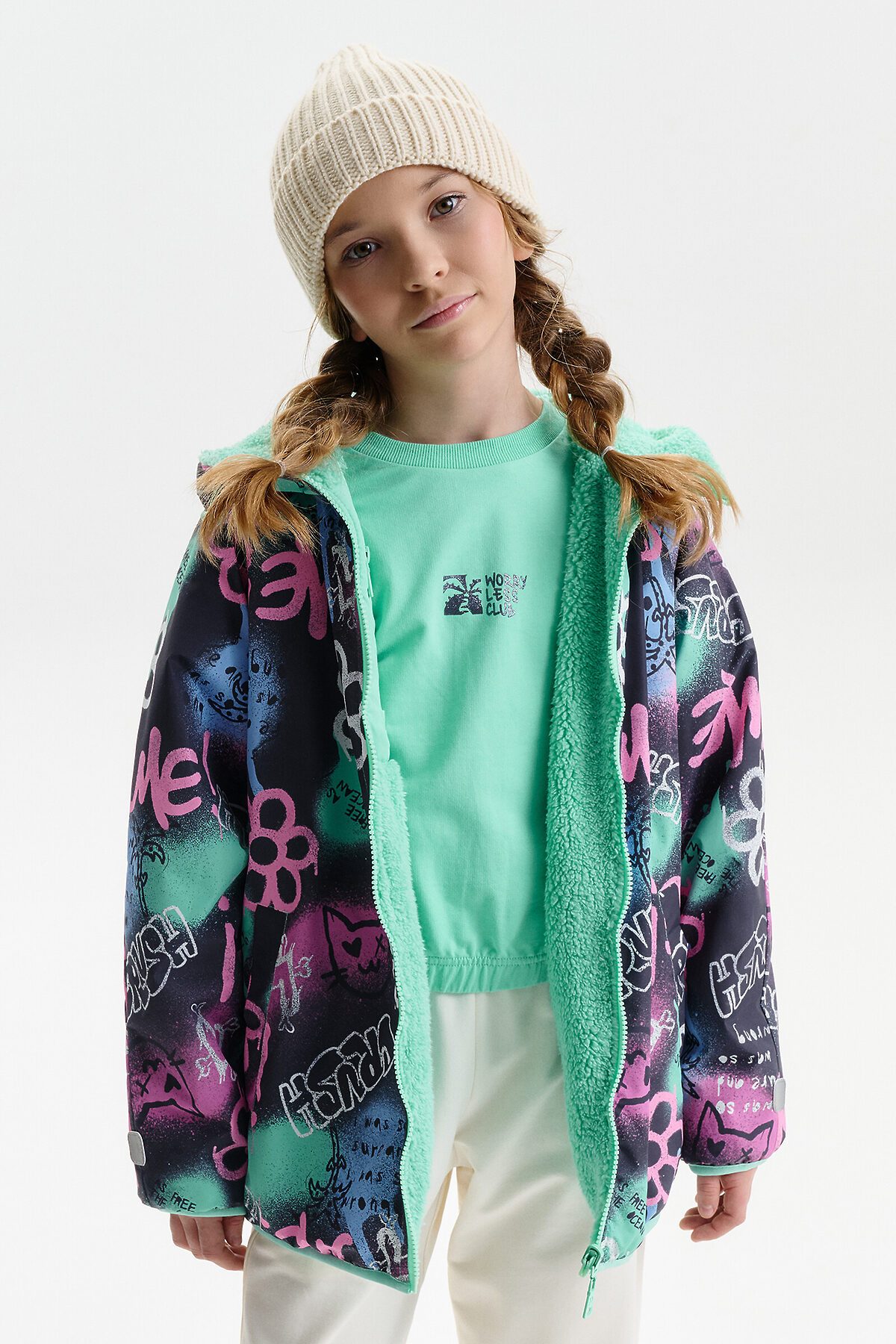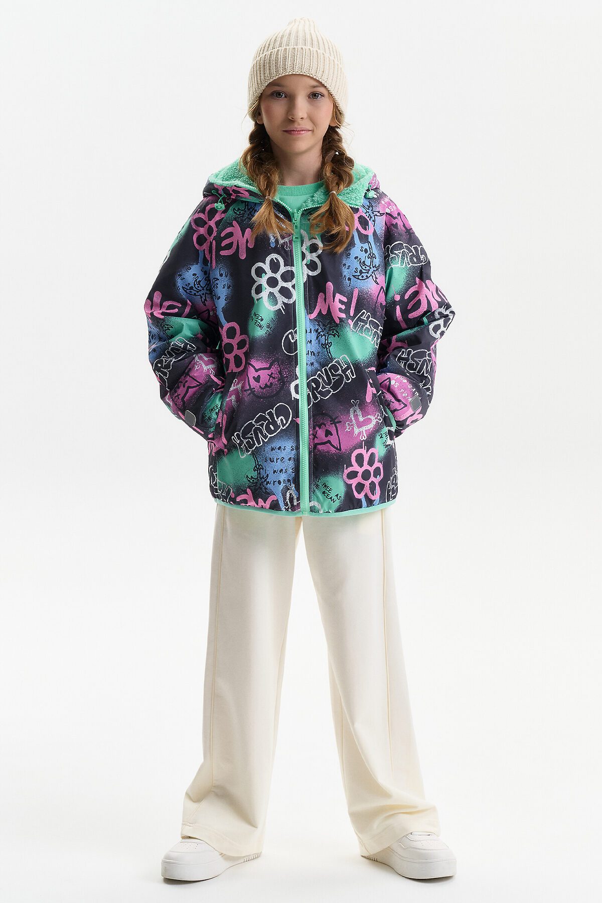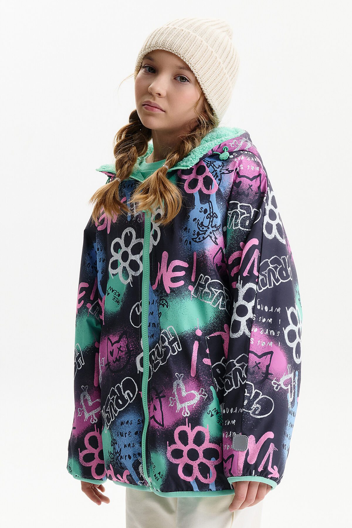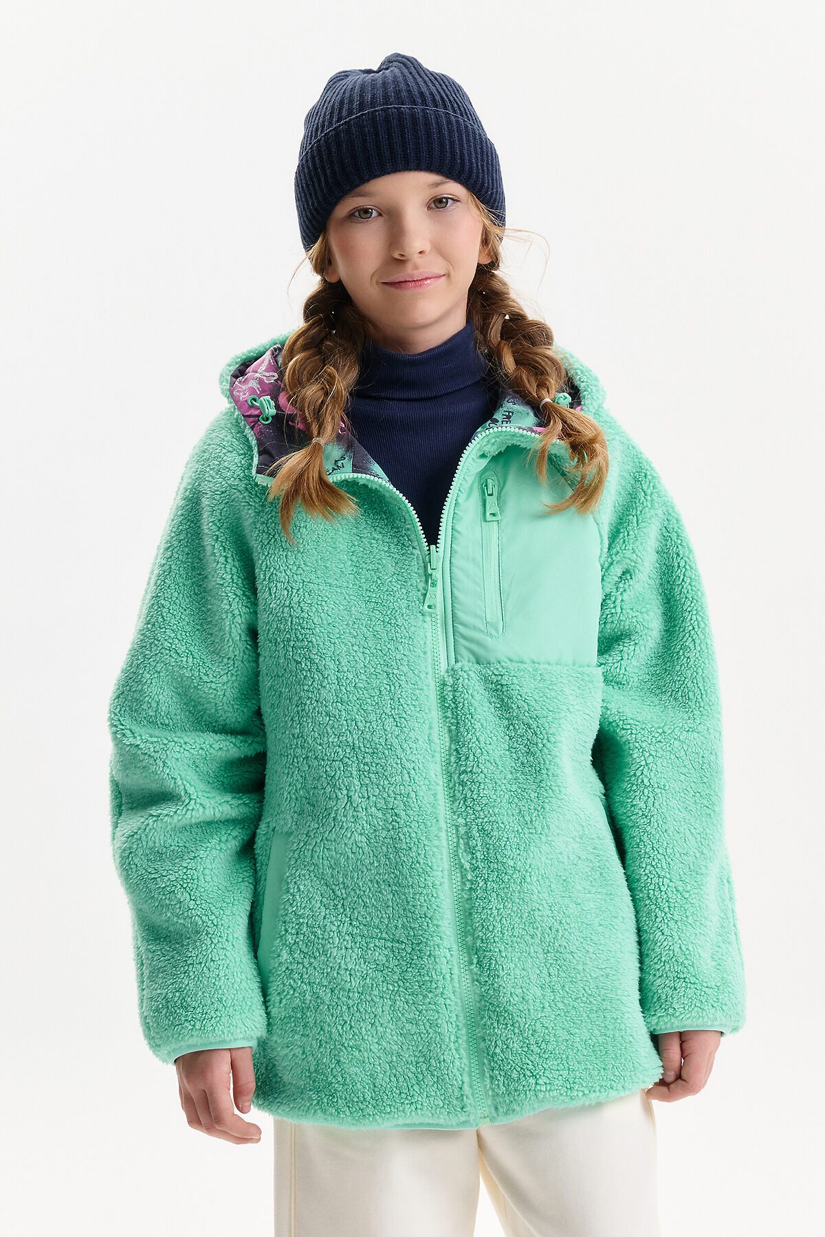 Демисезонная куртка для девочки Pelican — универсальная модель для прохладной погоды весной и осенью, сочетающая комфорт, функциональность и актуальный дизайн. Куртка выполнена в двустороннем формате, что позволяет носить её на любую сторону и легко менять образ в зависимости от настроения и цветовой гаммы. Внешняя сторона изготовлена из практичной курточной ткани, устойчива к ветру и повседневным нагрузкам. Внутренняя сторона выполнена из мягкого бербера — уютного и тёплого материала, который по тактильным ощущениям воспринимается как плюшевая куртка. Благодаря этому модель часто выбирают как меховую куртку для девочки на демисезон, без утяжеления и перегрева. Куртка для девочки имеет современный свободный крой оверсайз и укороченную длину до подъягодичной складки. Покрой рукава реглан формирует мягкую линию плеча, а объёмный верх рукава с заужением к низу обеспечивает свободу движений. Низ изделия и рукава окантованы эластичным пайпингом и слегка собраны, что помогает защититься от ветра. Модель оснащена центральной застёжкой на молнии с передвижным пуллером, который легко переворачивается на обе стороны. Несъёмный капюшон с забралом регулируется эластичным шнуром с фиксаторами. На переде расположены удобные карманы с листочкой без молнии. На стороне из бербера предусмотрен дополнительный вертикальный карман на молнии с тканевыми ограничителями. По низу рукавов со стороны основной ткани размещены светоотражающие нашивки, повышающие заметность ребёнка в тёмное время суток. Куртка рассчитана на температурный режим от +5°C до +15°C, подходит для прогулок, школы и активного отдыха.