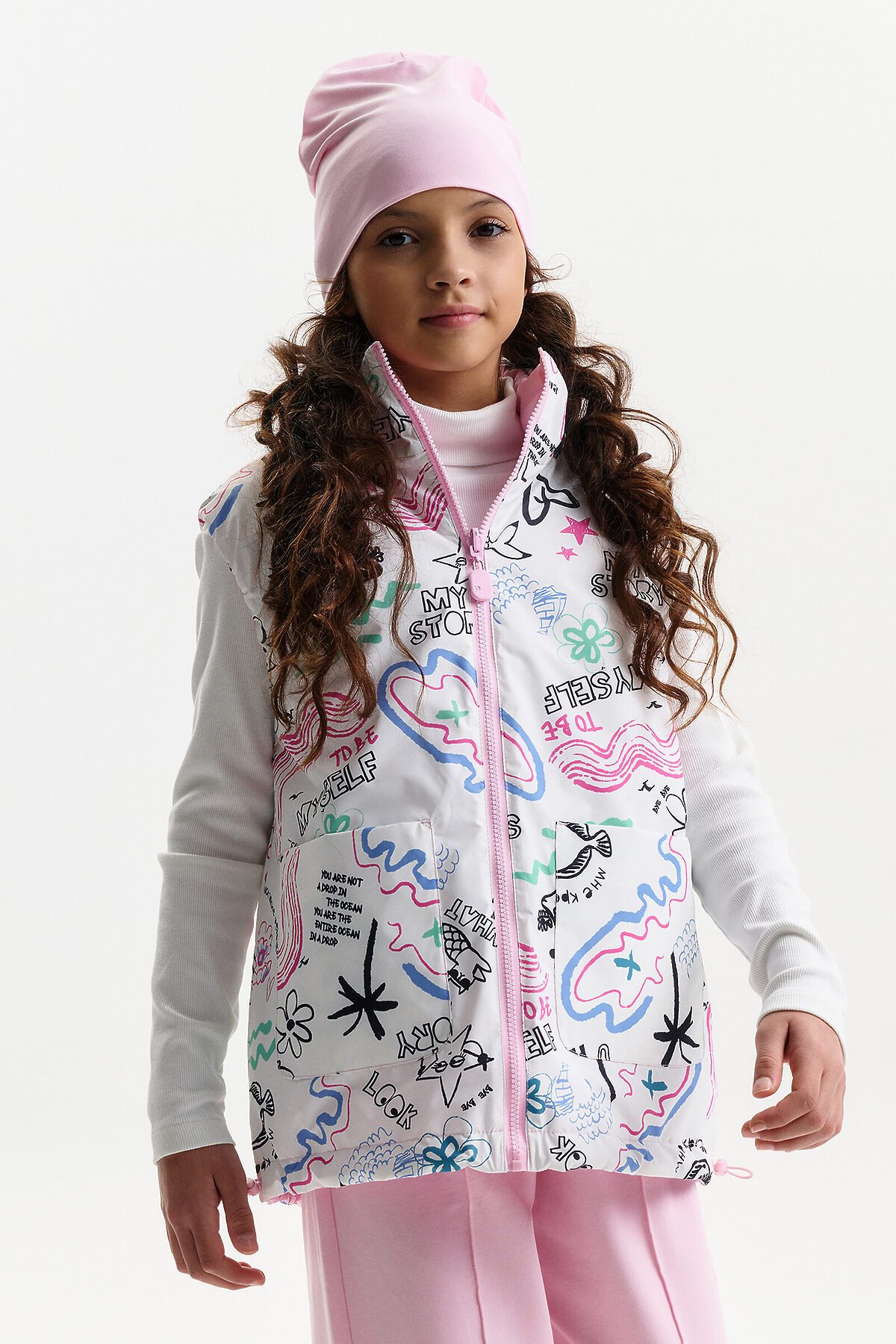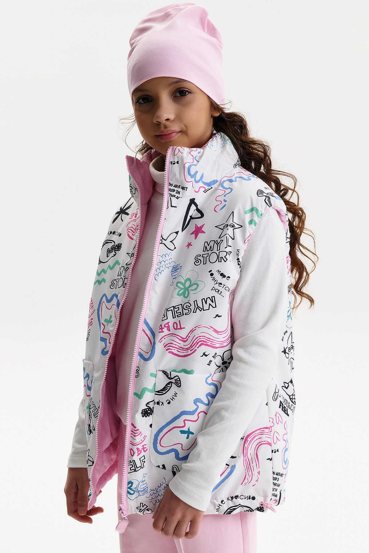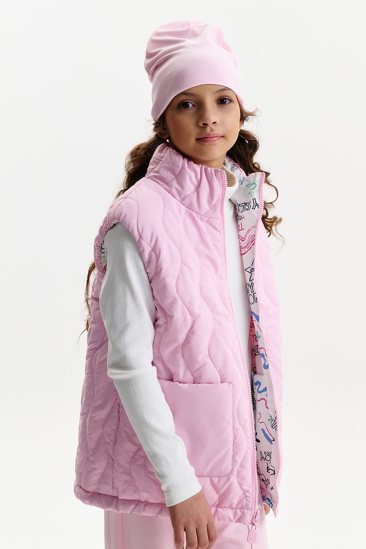 Жилетка для девочки — удобный и функциональный вариант верхней одежды для межсезонья и прохладной погоды. Детская утепленная жилетка выполнена в двустороннем формате, что позволяет менять внешний вид изделия в зависимости от образа и настроения. Жилет детский имеет увеличенный объем и прямой силуэт, благодаря чему комфортно сидит, не сковывает движения и подходит для многослойных комплектов. Модель дополнена накладными карманами, удобными для повседневной носки. Одна сторона жилетки простегана декоративной отстрочкой, вторая выполнена гладкой, без стёжки, что делает модель универсальной и визуально аккуратной. Воротник оформлен в виде высокой стойки, обеспечивающей защиту от ветра. Молния с двусторонним пуллером позволяет легко застегивать жилет с любой стороны, что особенно удобно для двусторонней конструкции. По пройме и по верхнему краю стойки проложен внутренний эластик, который улучшает посадку и комфорт при носке. В качестве утеплителя используется синтепон 60 г/м² в два слоя (120 г/м²) — оптимальный вариант для активных детей, обеспечивающий тепло без утяжеления. По низу жилета предусмотрена утяжка эластичным шнуром со стопперами, позволяющая регулировать посадку и защищать от прохладного воздуха. Утепленная детская жилетка для девочки подходит для прогулок, школы и повседневного использования.