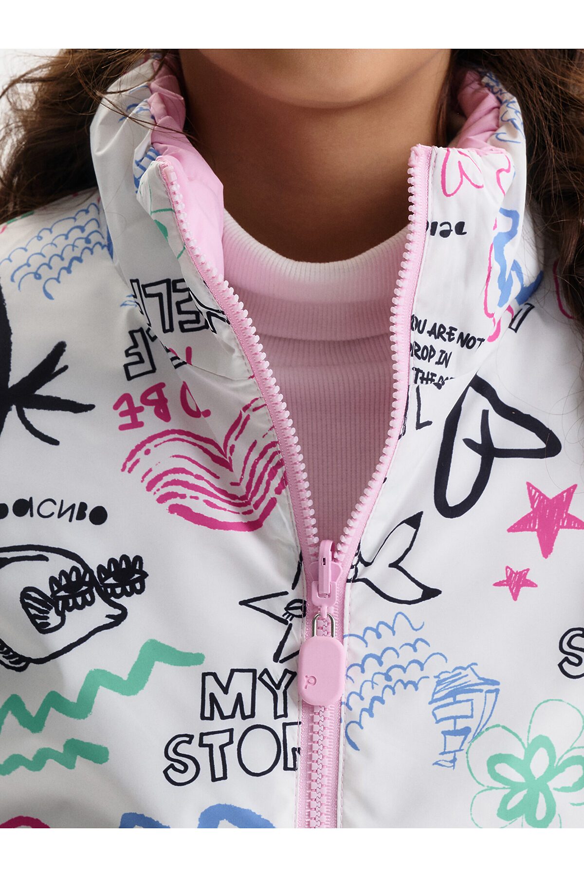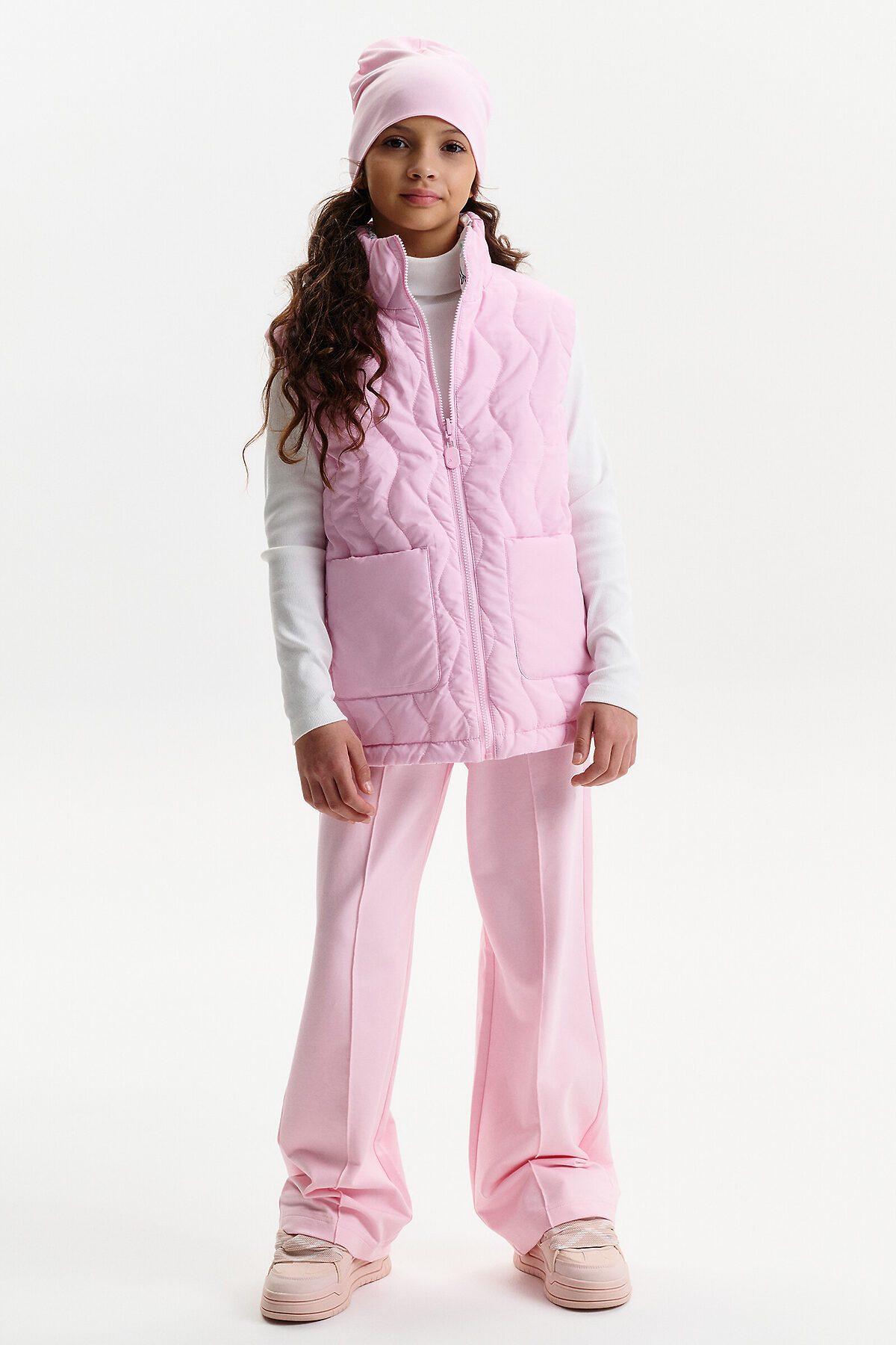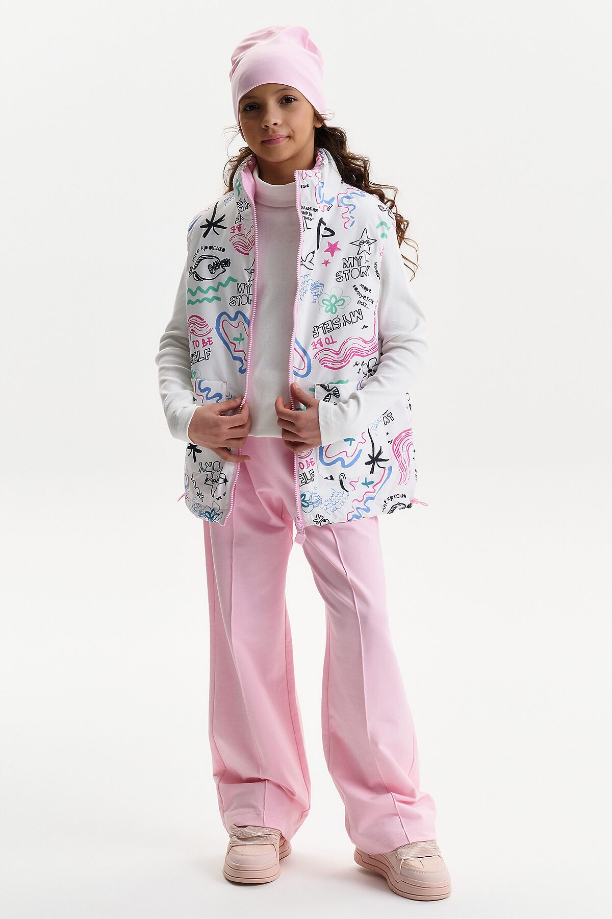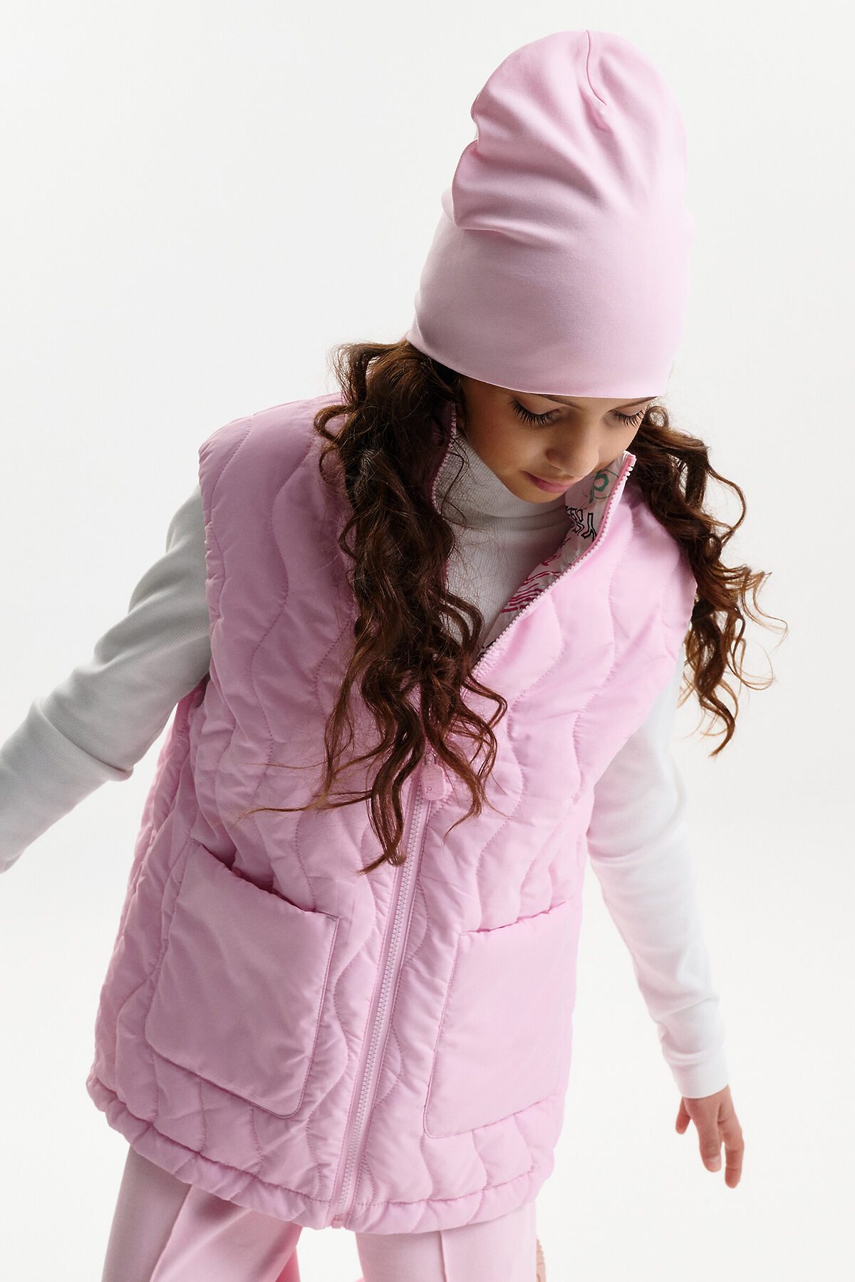 Жилетка для девочки — удобный и функциональный вариант верхней одежды для межсезонья и прохладной погоды. Детская утепленная жилетка выполнена в двустороннем формате, что позволяет менять внешний вид изделия в зависимости от образа и настроения. Жилет детский имеет увеличенный объем и прямой силуэт, благодаря чему комфортно сидит, не сковывает движения и подходит для многослойных комплектов. Модель дополнена накладными карманами, удобными для повседневной носки. Одна сторона жилетки простегана декоративной отстрочкой, вторая выполнена гладкой, без стёжки, что делает модель универсальной и визуально аккуратной. Воротник оформлен в виде высокой стойки, обеспечивающей защиту от ветра. Молния с двусторонним пуллером позволяет легко застегивать жилет с любой стороны, что особенно удобно для двусторонней конструкции. По пройме и по верхнему краю стойки проложен внутренний эластик, который улучшает посадку и комфорт при носке. В качестве утеплителя используется синтепон 60 г/м² в два слоя (120 г/м²) — оптимальный вариант для активных детей, обеспечивающий тепло без утяжеления. По низу жилета предусмотрена утяжка эластичным шнуром со стопперами, позволяющая регулировать посадку и защищать от прохладного воздуха. Утепленная детская жилетка для девочки подходит для прогулок, школы и повседневного использования.