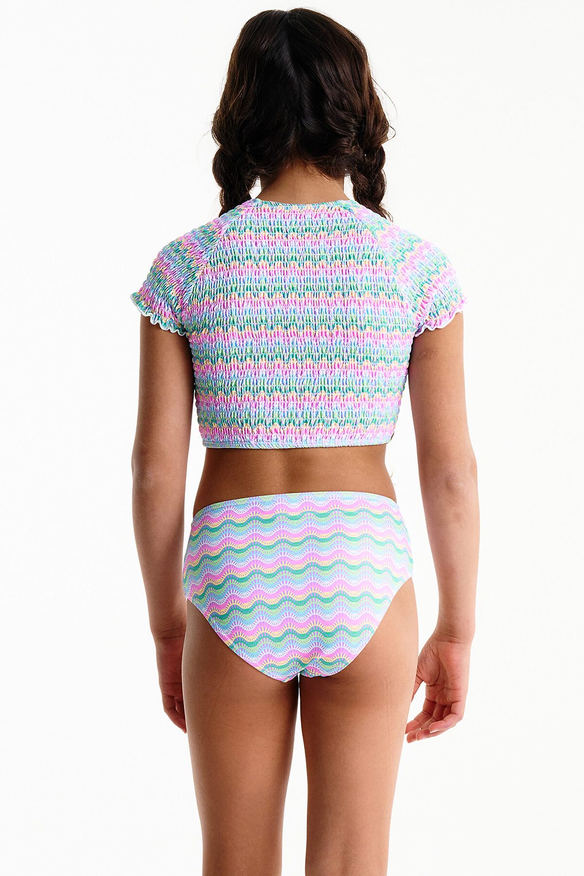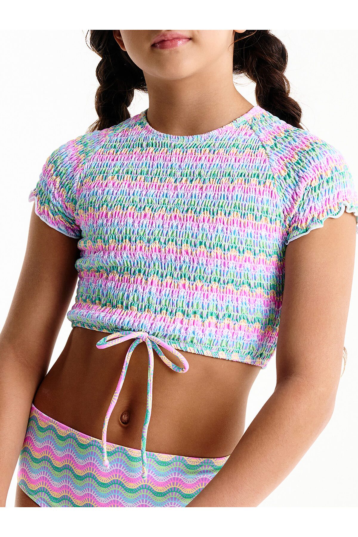 Оригинальный и стильный раздельный купальник для девочки. Топ — укороченная футболка с рукавами кроя реглан и округлым вырезом горловины. Весть топ собран параллельными эластичными строчками — актуально и по-девичьи красиво. По переду небольшой декоративный бантик. Трусы классические высокой посадки, аккуратные и комфортные. Детский купальник выполнен из полиамида и эластана — он прекрасно тянется, не теряя при этом своей формы, не выгорает и быстро сохнет. Трусы однотонные, жёлтого цвета. Топ в разноцветную фигурную полоску. В линейке представлены детские купальники следующих размеров: 3 (98): 4-5 (104-110): 6-7 (116-122): 8-9 (128-134): 10-11 (140-146). Купальник красивый подходит для девочек дошкольного, младшего школьного возраста и девочек-подростков. Идеальный вариант для летнего отдыха, пляжа, моря и бассейна. Топ можно носить отдельно — с юбками или шортами, велосипедками. Модный купальник — замечательный подарок дочери, внучке или сестре на любой праздник. Выбирайте нужный размер по таблице размеров на фото. Цвет товара на экране вашего устройства может отличаться от цвета изделия вживую. Товар возврату и обмену не подлежит.