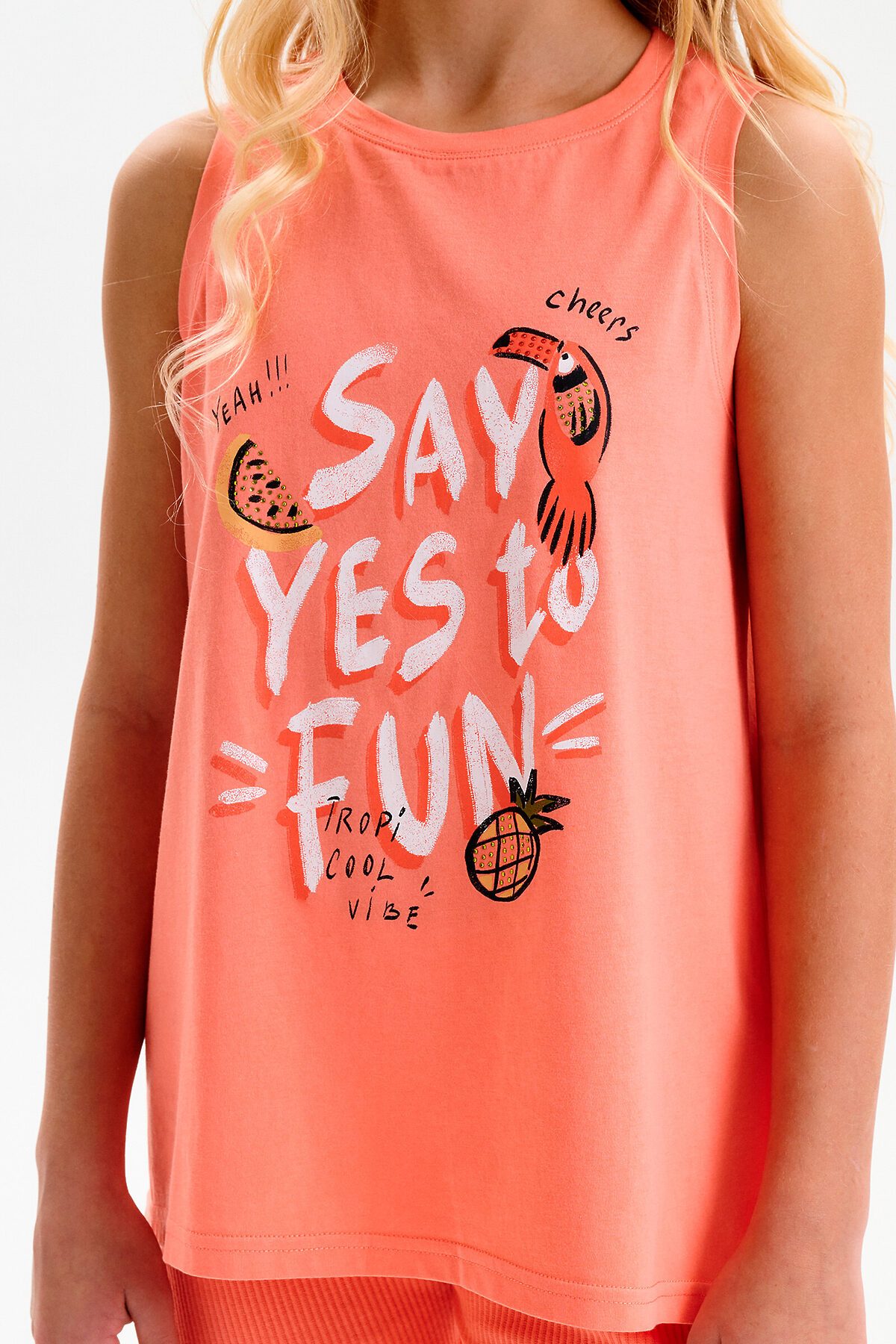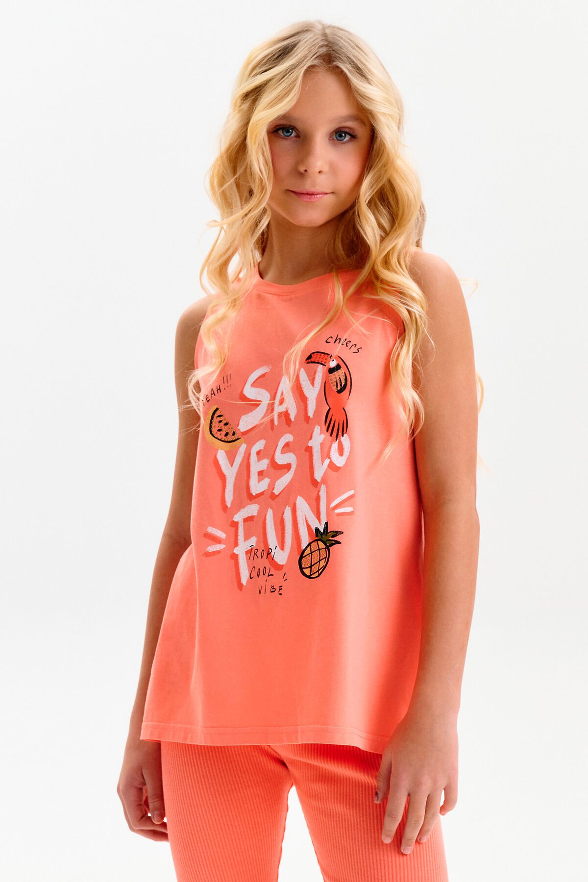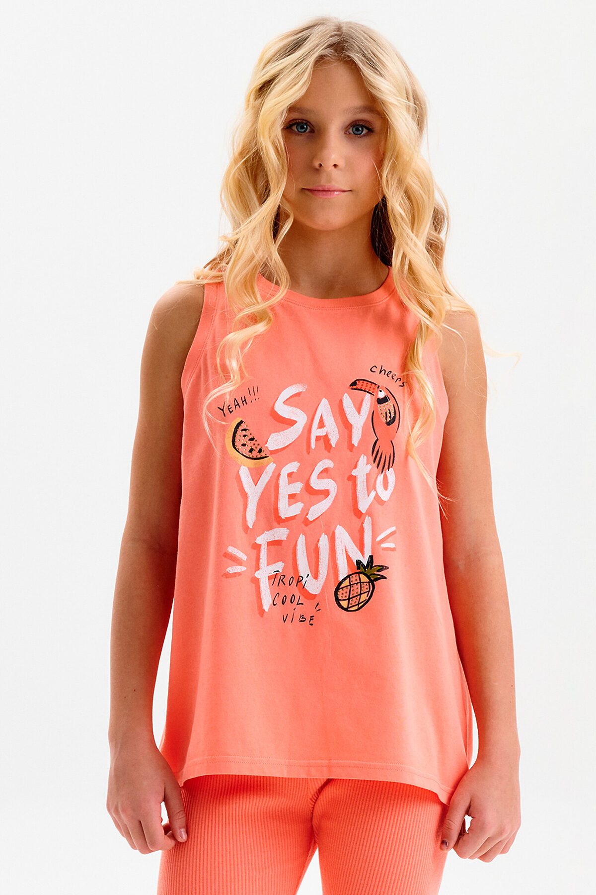 Майка для девочки. Выполнена из мягкого трикотажного полотна. Свободный трапециевидный силуэт с лёгким перепадом по низу делает модель удобной и не сковывает движения. Горловина и проймы аккуратно обработаны эластичной рибаной в тон ткани. Перевод: СКАЖИ ДА ВЕСЕЛЬЮ: ДА!!! УРА: ТРОПИКУЛ(ИГРА СЛОВ) ВАЙБ.