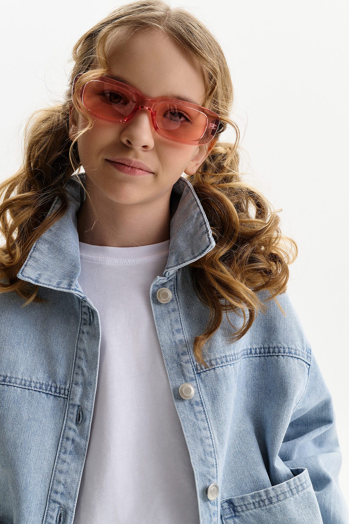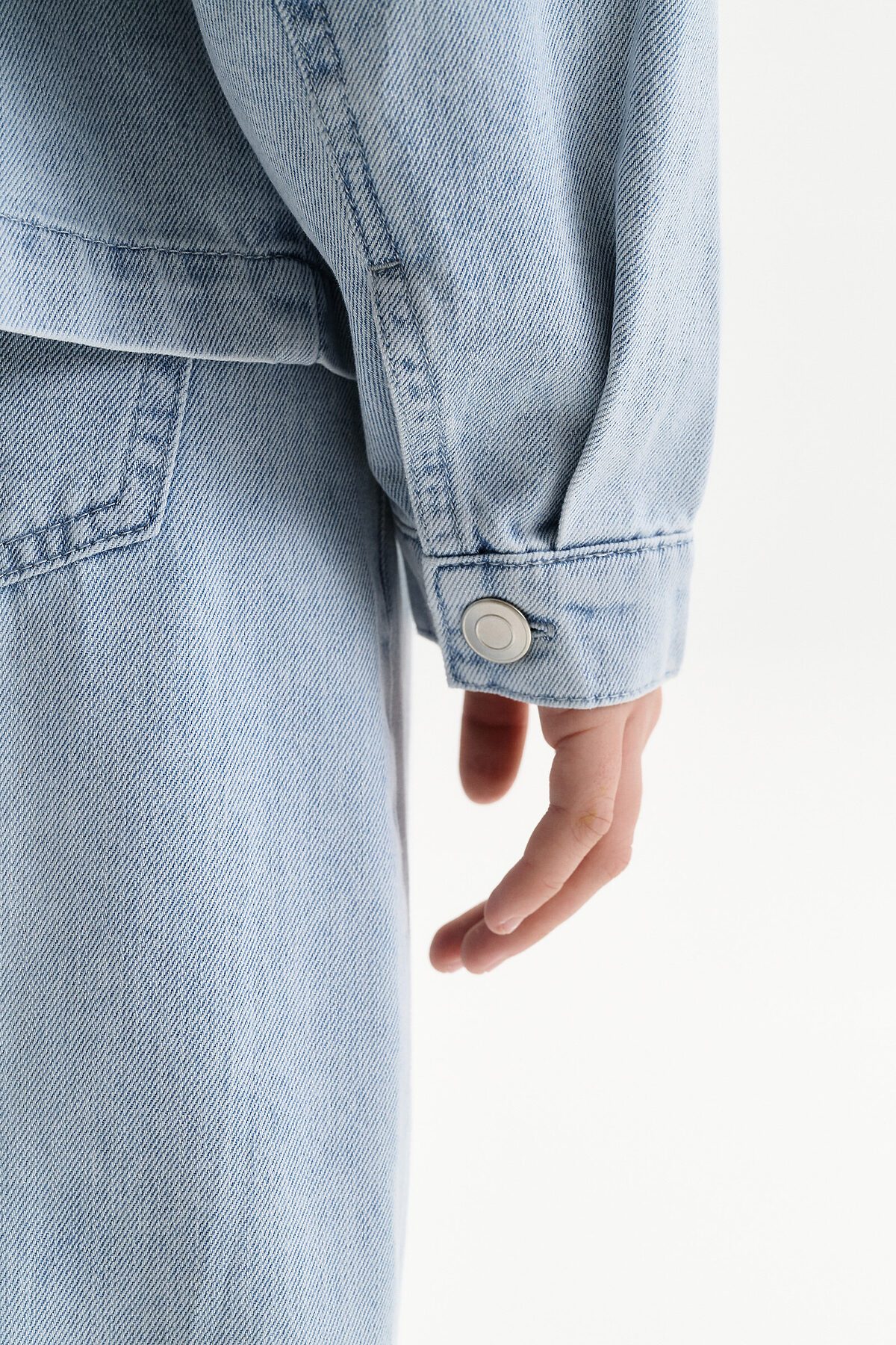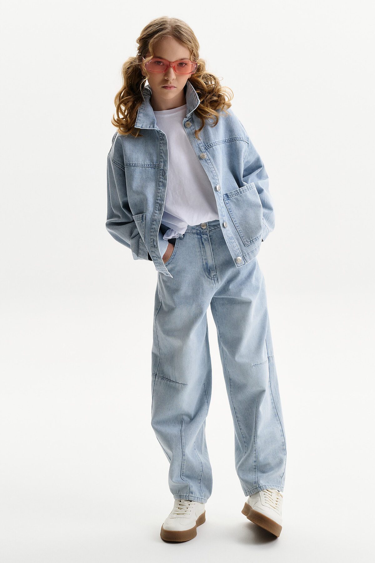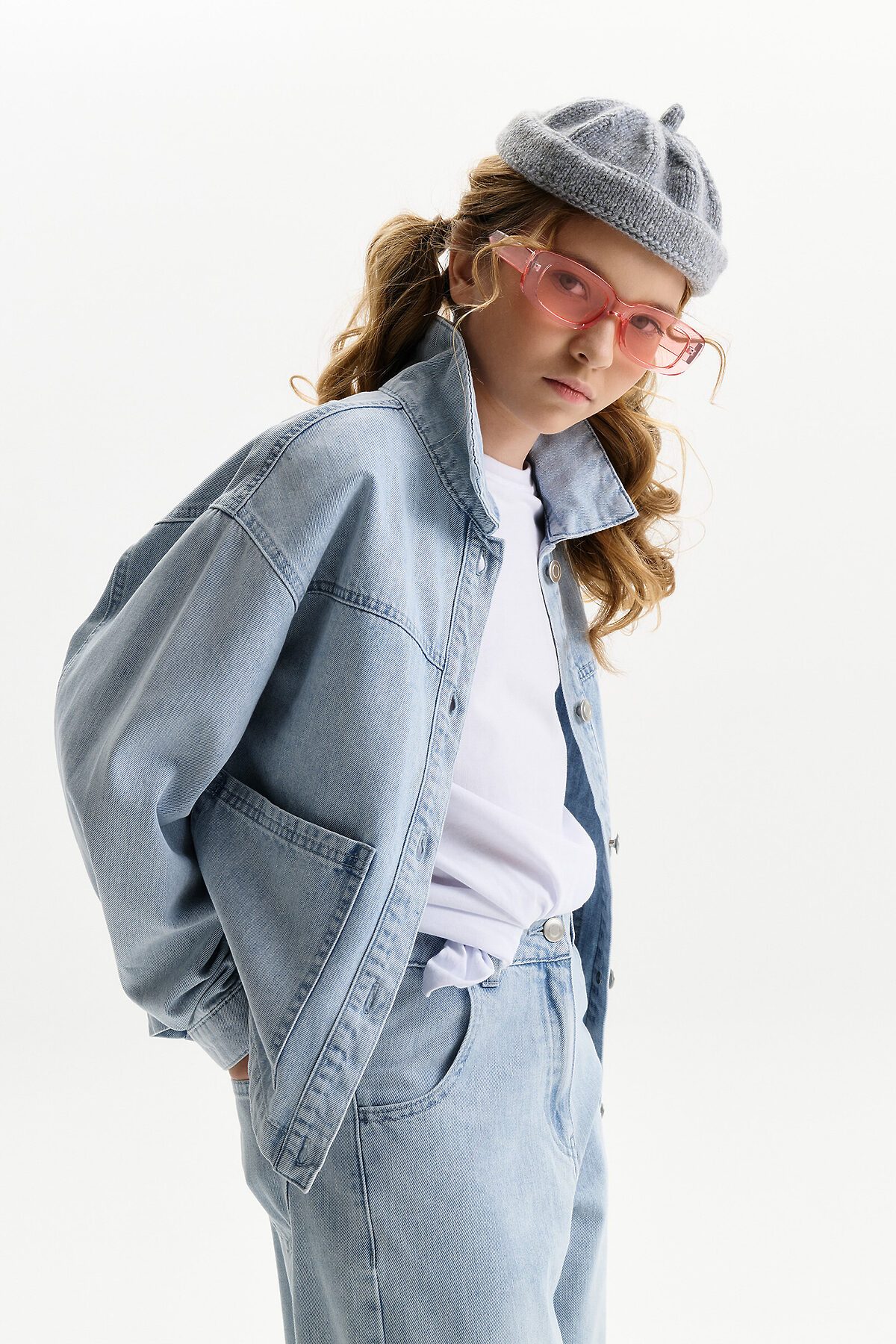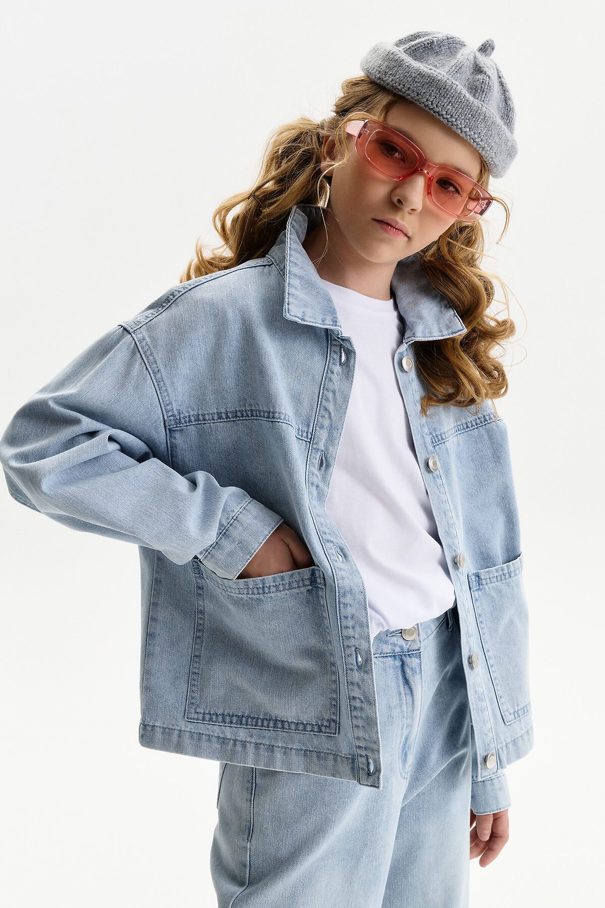 Джинсовая куртка из плотной джинсы, свободного прямого кроя с щелевидная пройма и двухшовным рукавом. Средней длины. Низ куртки без манжеты, оформлен швом. Это сделано для придания легкости изделию. Центральная застежка на планке на петли-пуговицы. Подрезная кокетка по переду и спинке, на переде накладные карманы. По спинке в дополнении к кокетке наклонные рельефные швы. По низу рукава защип и манжета на пуговицу. Объем куртки расчитан как третий слой. Для ношения не только с лонгсливом или футболкой, но и с худи, и со свитшотом. Что обеспечивает изделию более долгий сезон применения.