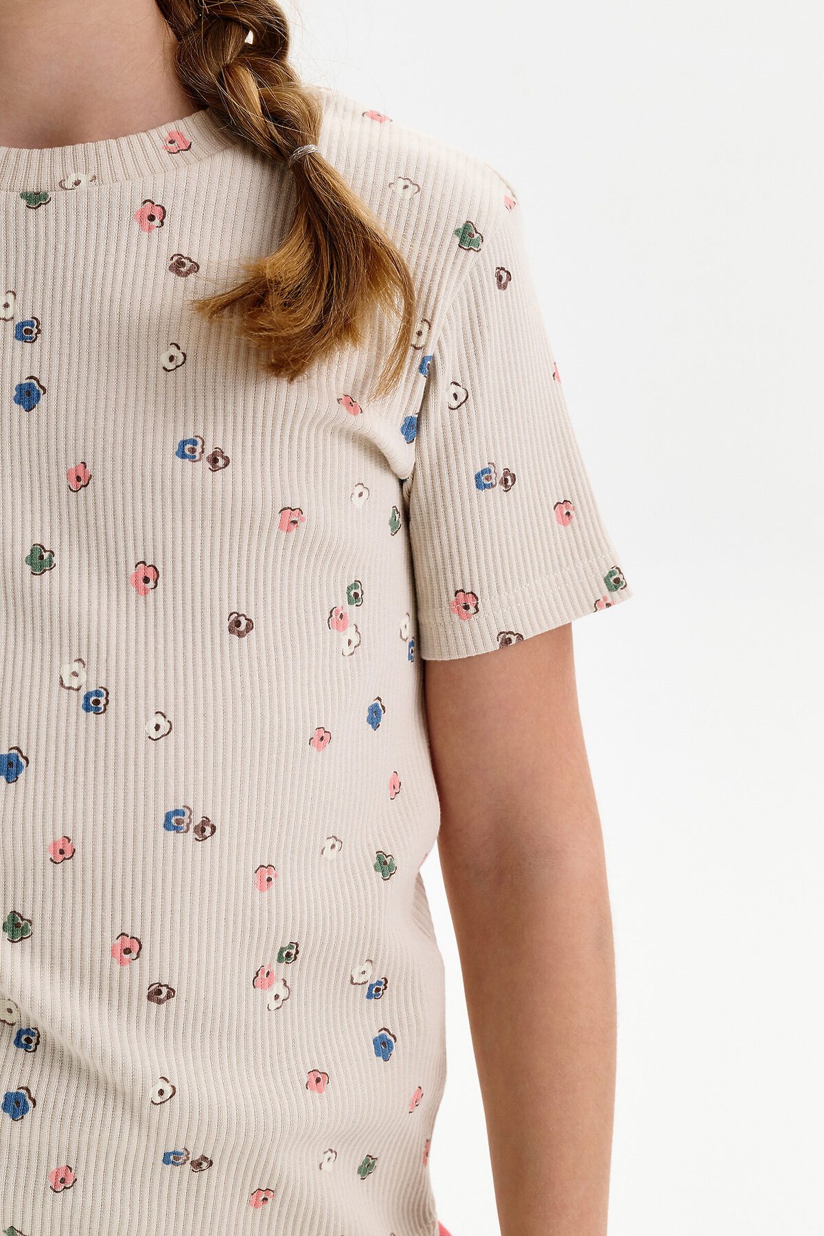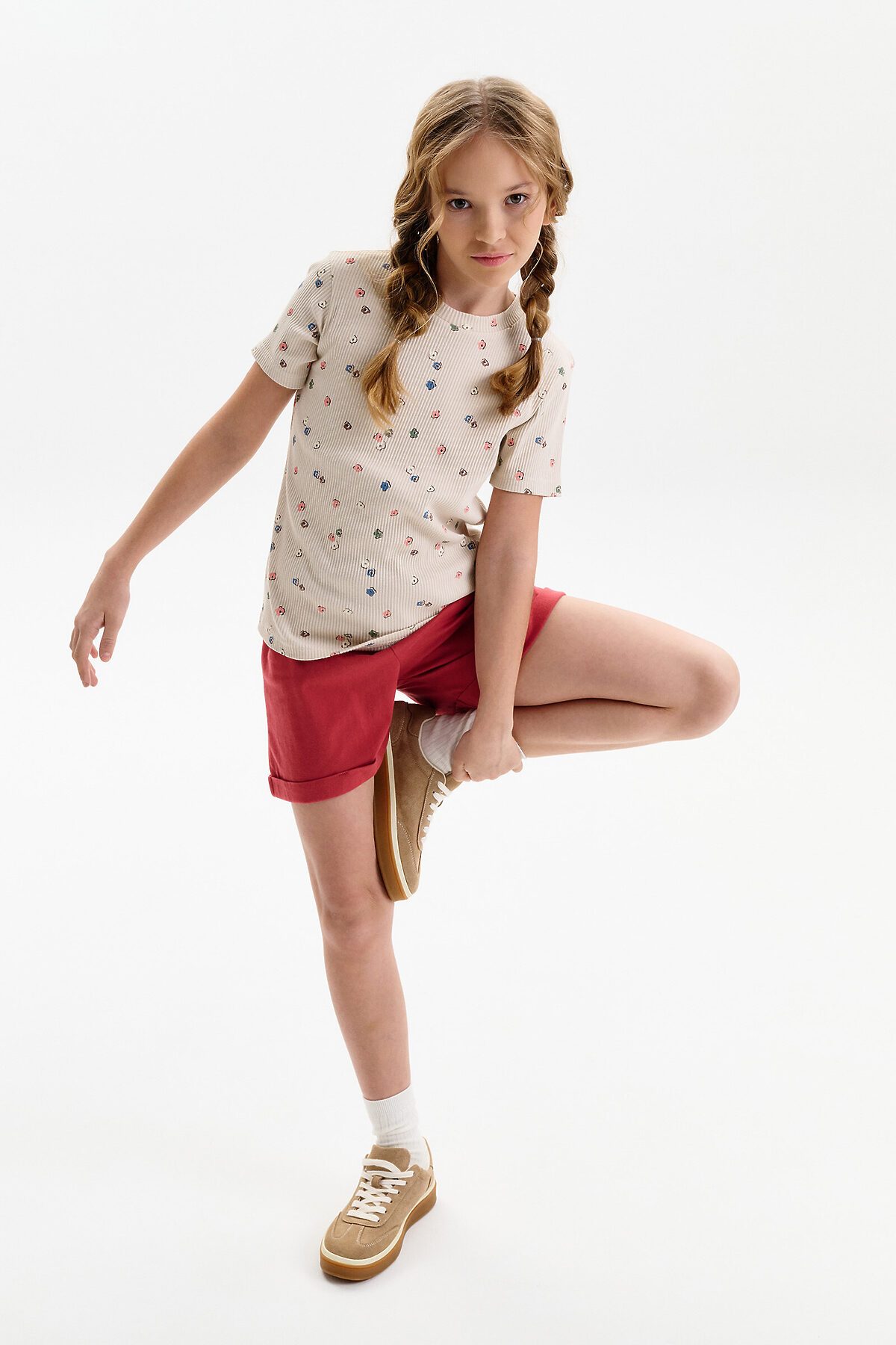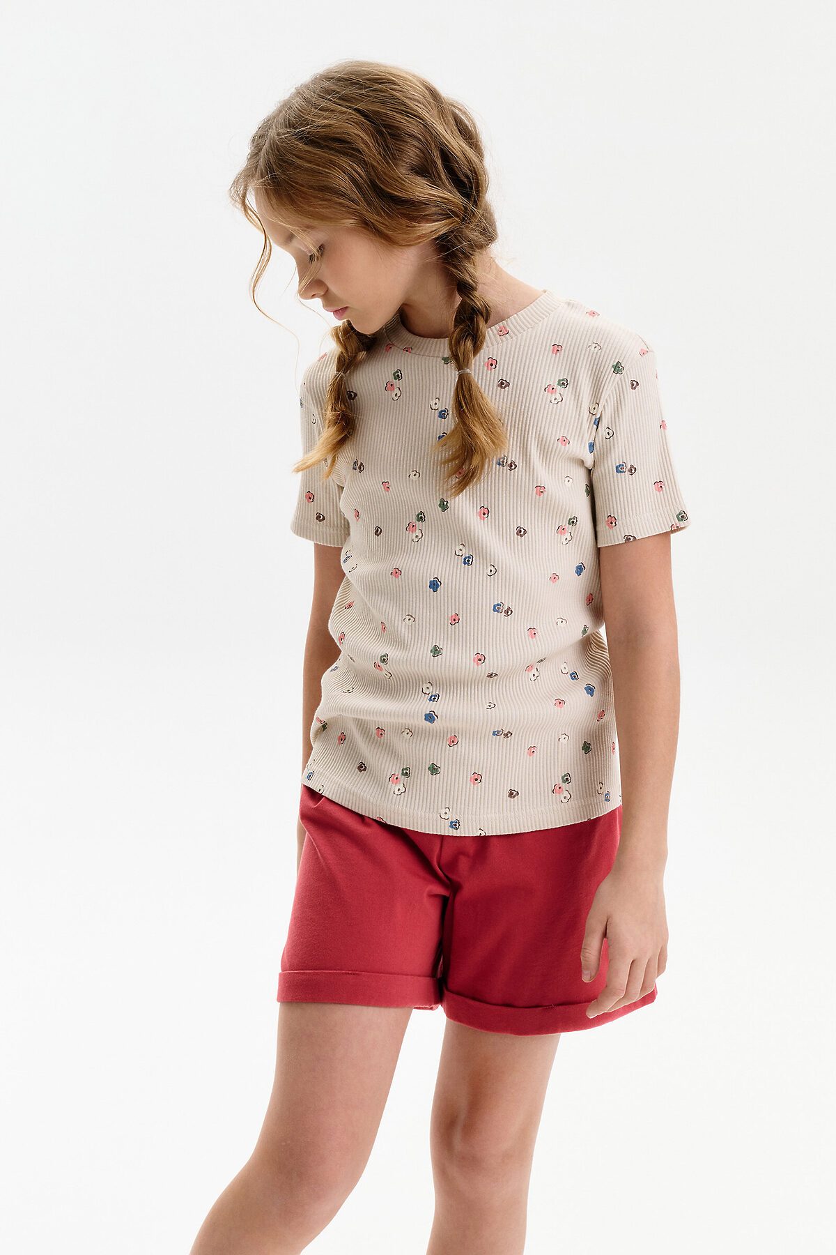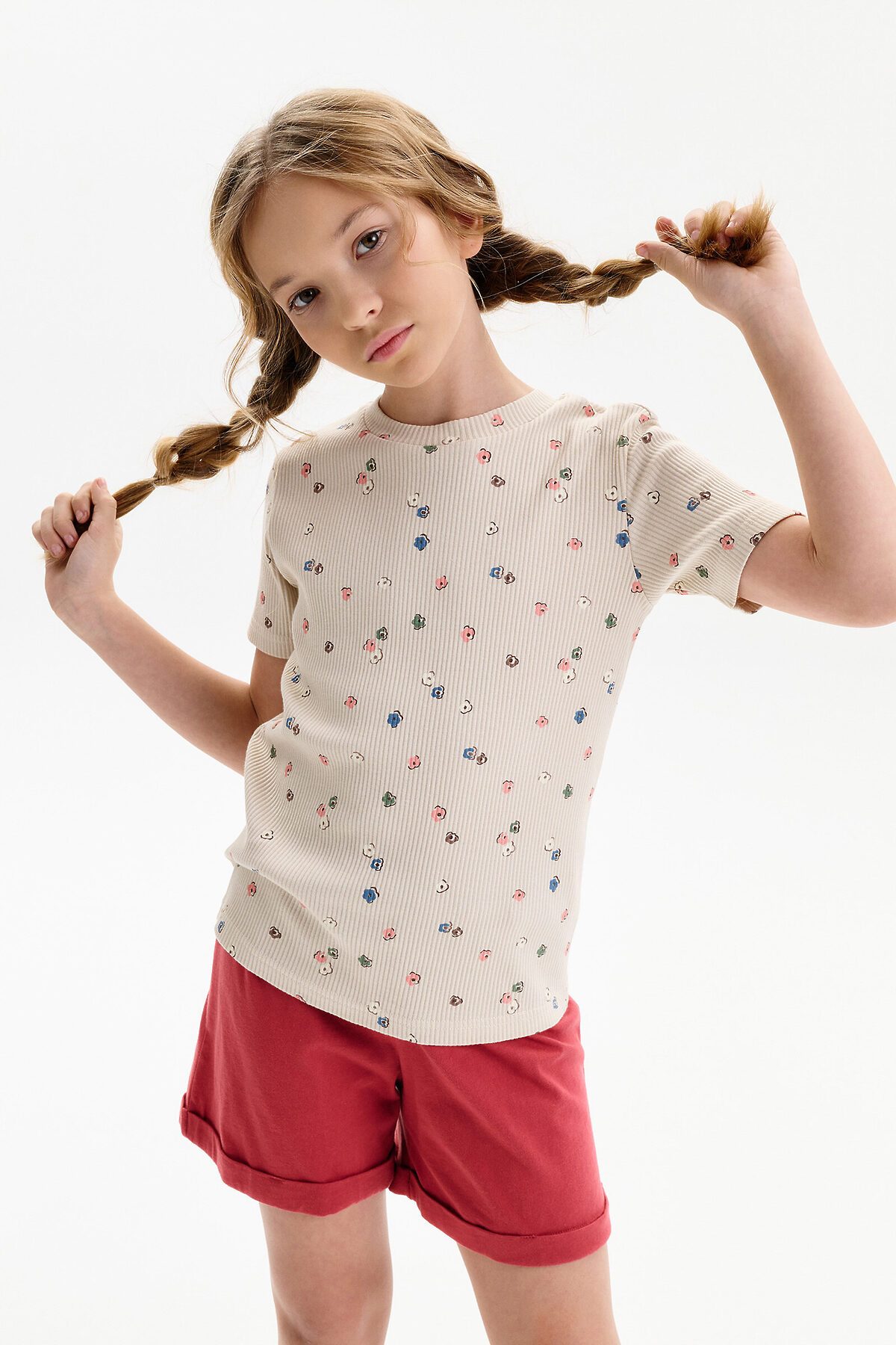Очаровательная футболка для девочки из трикотажа кашкорсе — мягкая, эластичная и приятная к телу. Ткань в рубчик отлично тянется, сохраняет форму и обеспечивает комфорт на весь день. Модель умеренного объёма — не обтягивает, но и не смотрится слишком свободной. Легко комбинируется с юбками, шортами, сарафанами и джинсами. Декорирована нежным мелким принтом в виде цветочков, который делает образ особенно милым и романтичным. Идеально вписывается в актуальный "деревенский" (cottagecore) стиль — модное направление, вдохновлённое природой, простотой и уютом. Не забывайте о выборе правильного размера. Используйте таблицу размеров на фотографии, чтобы выбрать подходящий вариант. Обратите внимание, что цвет товара на экране вашего устройства может отличаться от реального.