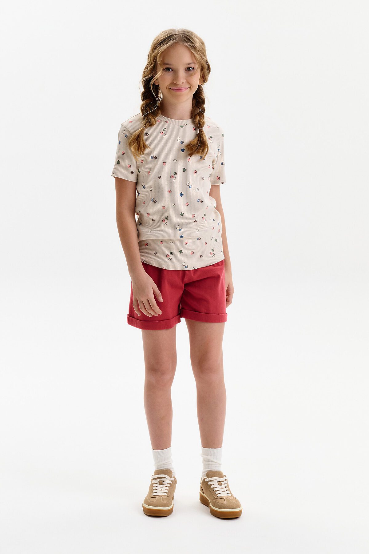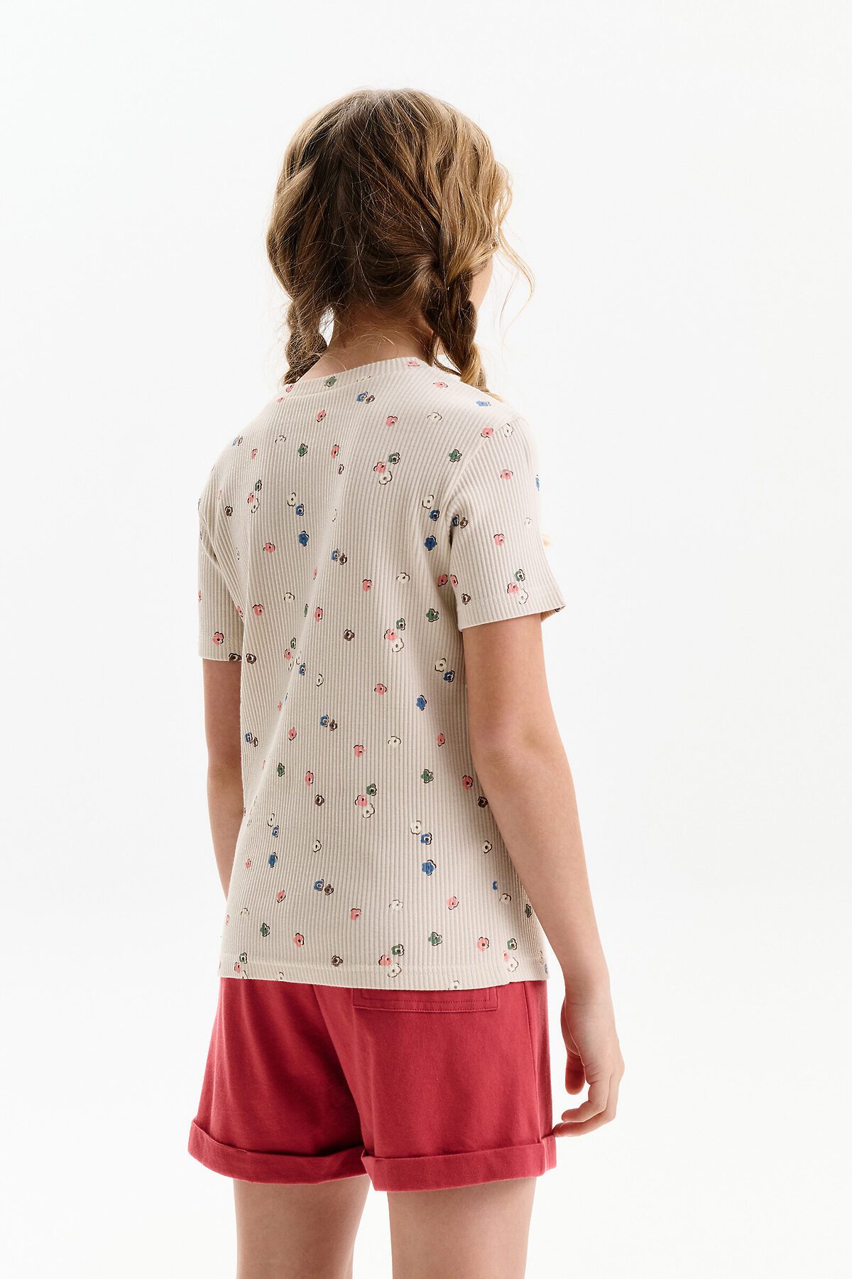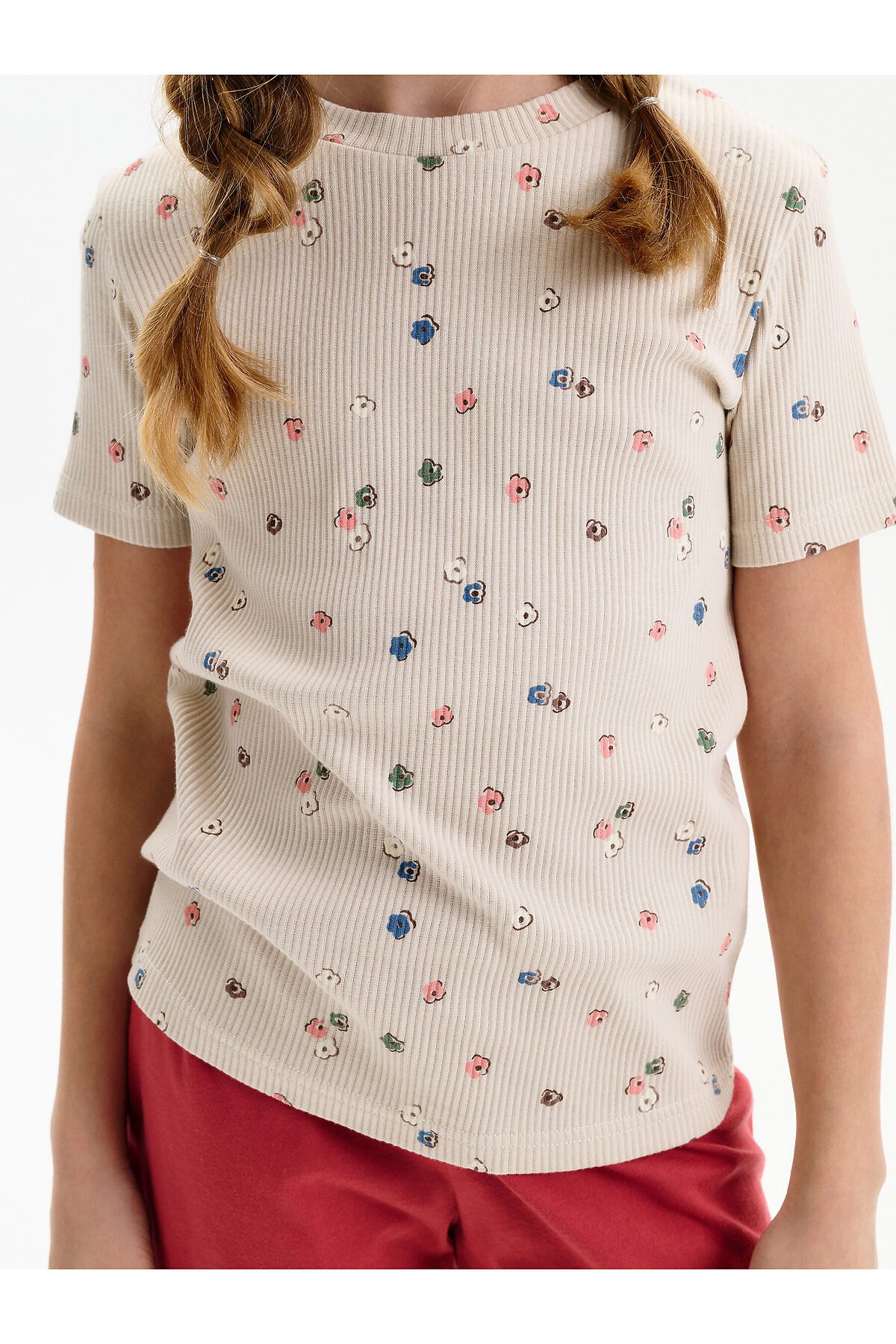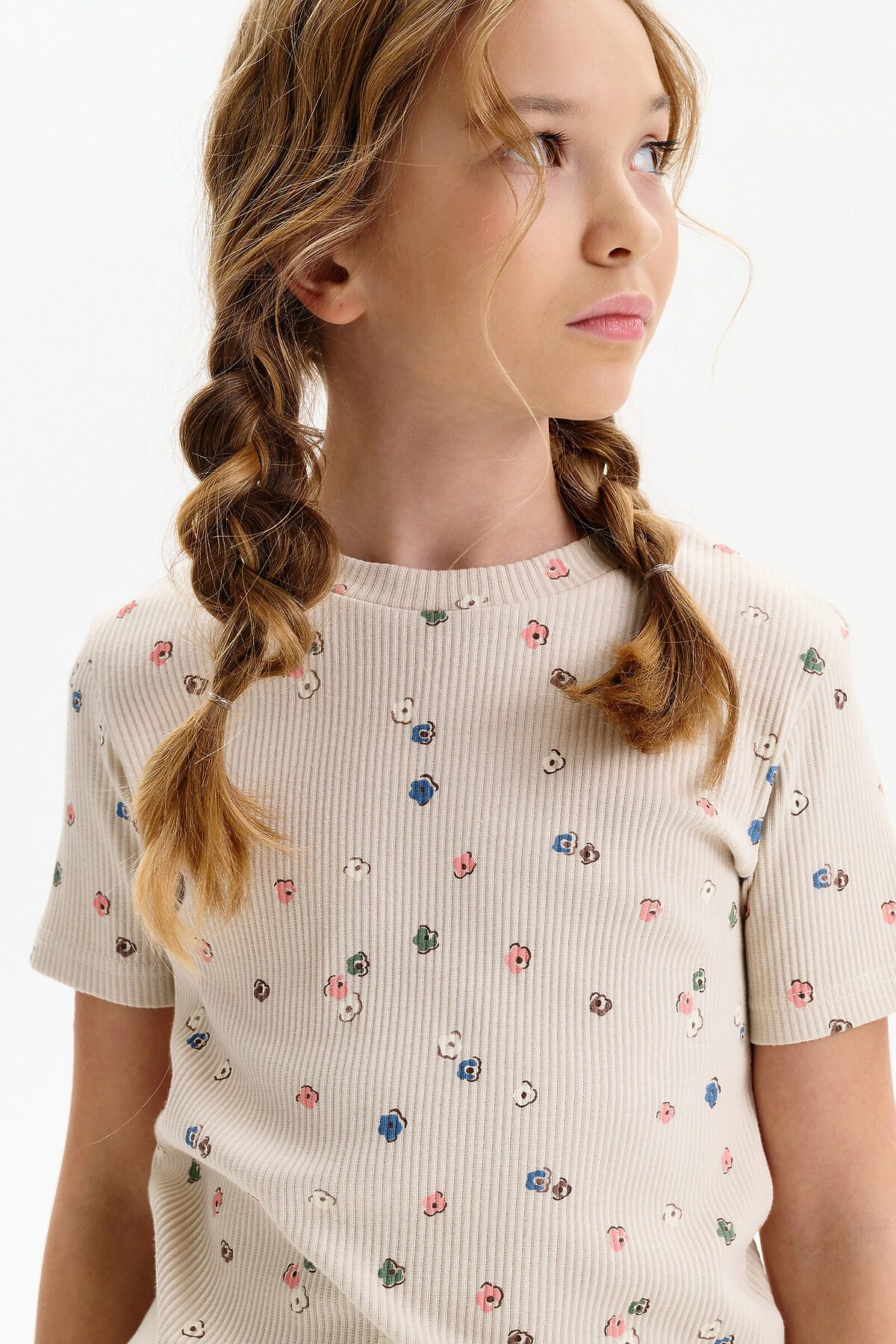 Очаровательная футболка для девочки из трикотажа кашкорсе — мягкая, эластичная и приятная к телу. Ткань в рубчик отлично тянется, сохраняет форму и обеспечивает комфорт на весь день. Модель умеренного объёма — не обтягивает, но и не смотрится слишком свободной. Легко комбинируется с юбками, шортами, сарафанами и джинсами. Декорирована нежным мелким принтом в виде цветочков, который делает образ особенно милым и романтичным. Идеально вписывается в актуальный "деревенский" (cottagecore) стиль — модное направление, вдохновлённое природой, простотой и уютом. Не забывайте о выборе правильного размера. Используйте таблицу размеров на фотографии, чтобы выбрать подходящий вариант. Обратите внимание, что цвет товара на экране вашего устройства может отличаться от реального.
