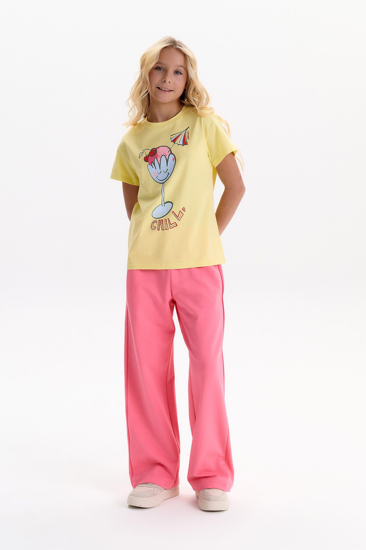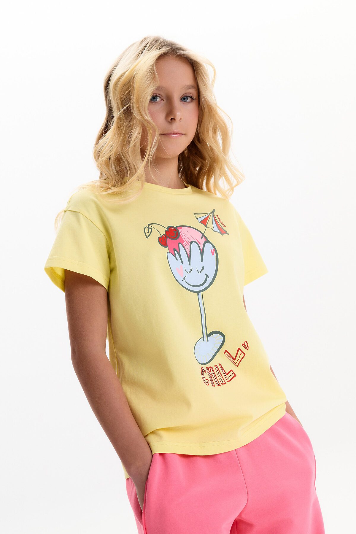 Футболка для девочки маленького объема. Выполнена из 100% хлопка. Эластичная рибана на вырезе горловины гарантирует, что футболка будет легко надеваться и сниматься, не теряя при этом своей формы. Перевод: чиль(прохлаждайся).